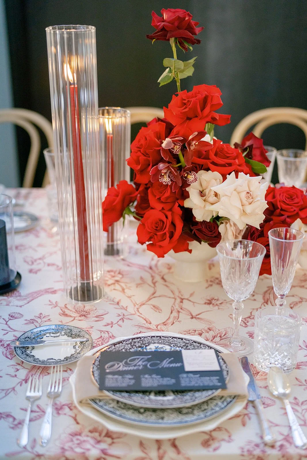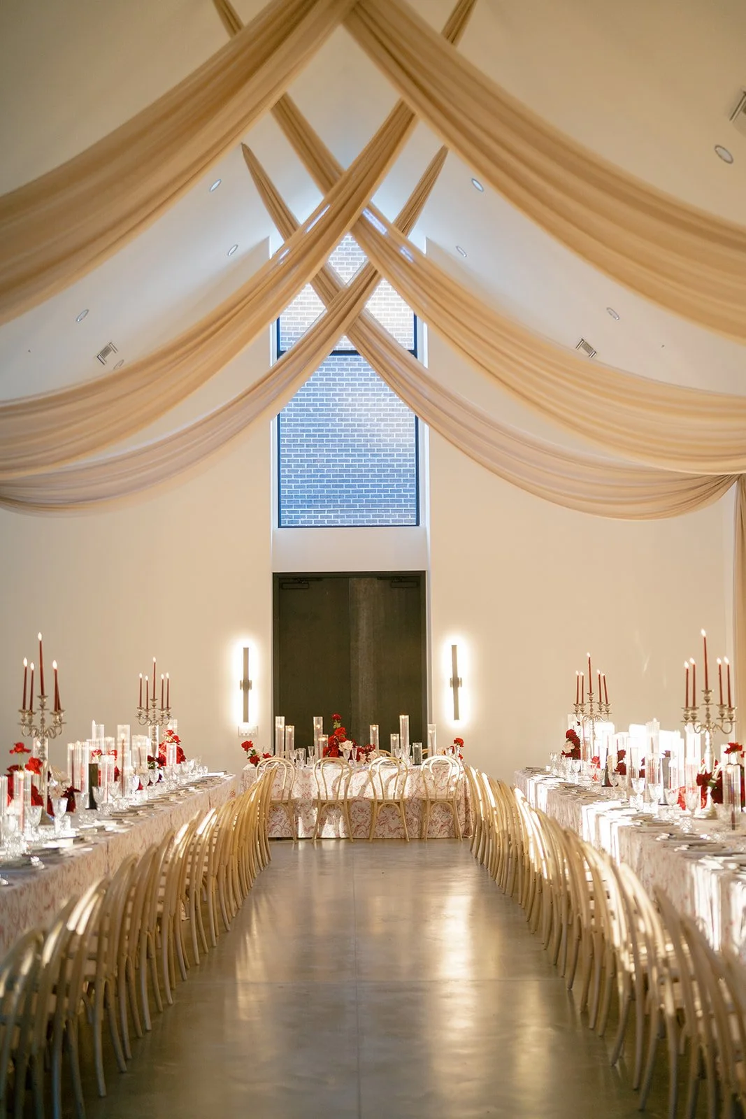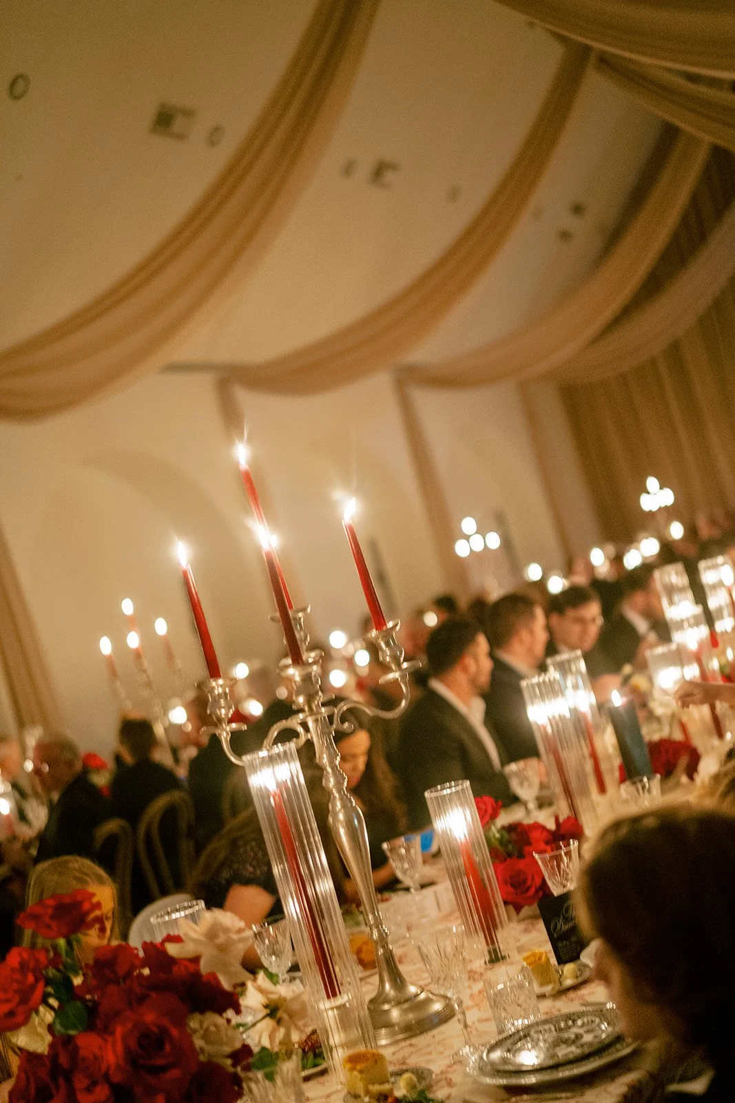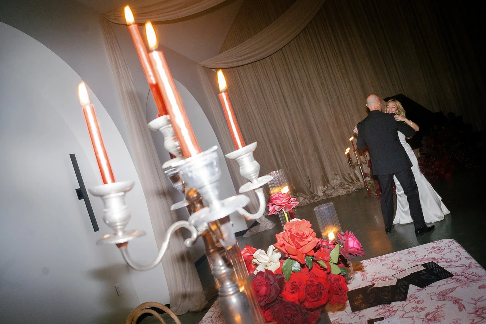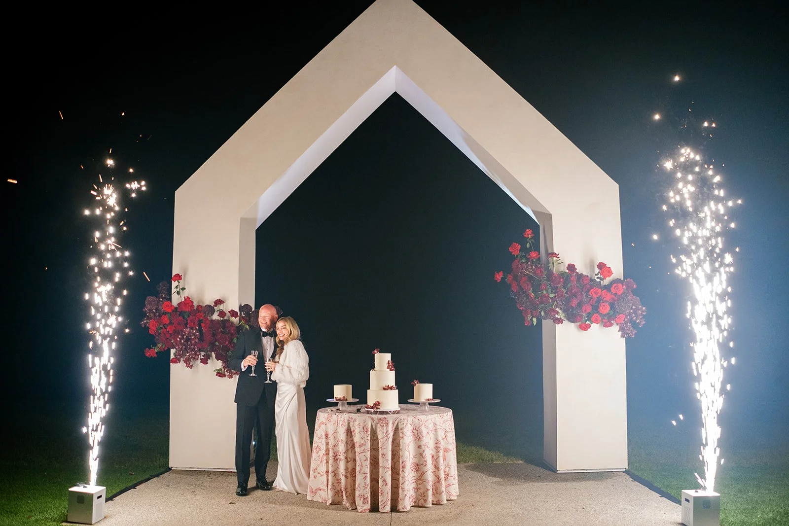 Following the ceremony guests headed to an indoor reception. Ivory fabric was draped from the ceiling that matched the ivory cushioned chairs. White and red pattern tablecloths covered tables were lined with red rose centerpieces in grey vases created by Seeded Events and Design. Tall, red taper candles in clear glass hurricane vases and silver candlelabras illuminated the space. White and black patterned dinnerware with black menus served as place settings. Guests enjoyed a meal featuring their choice of chicken, crab cakes, or filet. Signature cocktails from Family Catering Service included Toasted Pecan Old Fashioned, Star Gazer Spritz, or Blood Orange Mule. The dessert table held various choices including a three-tier white buttercream wedding cake with red floral accents. The bride changed into a long sleeve short lace dress and fur wrap for dancing to music from DJ Barkz Beats. The newlyweds got a sparkler send off from DJ Jay Rogers and all in attendance.
