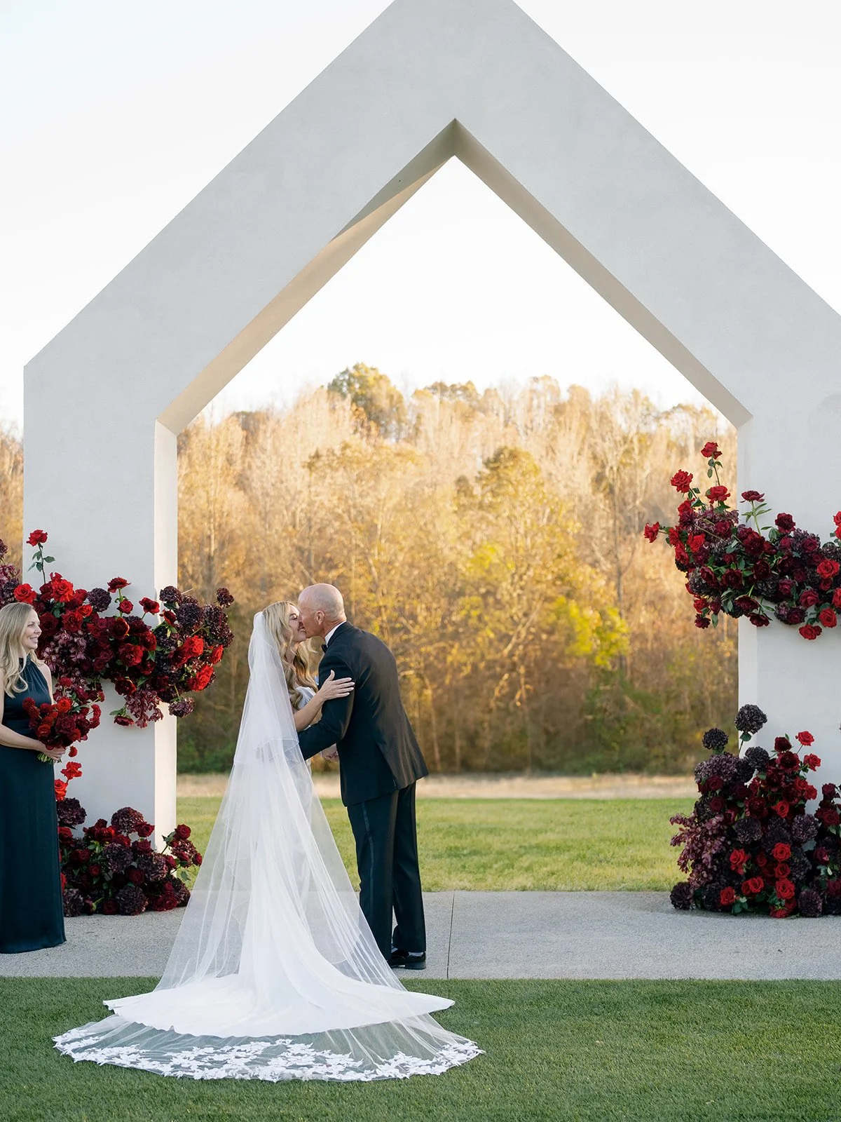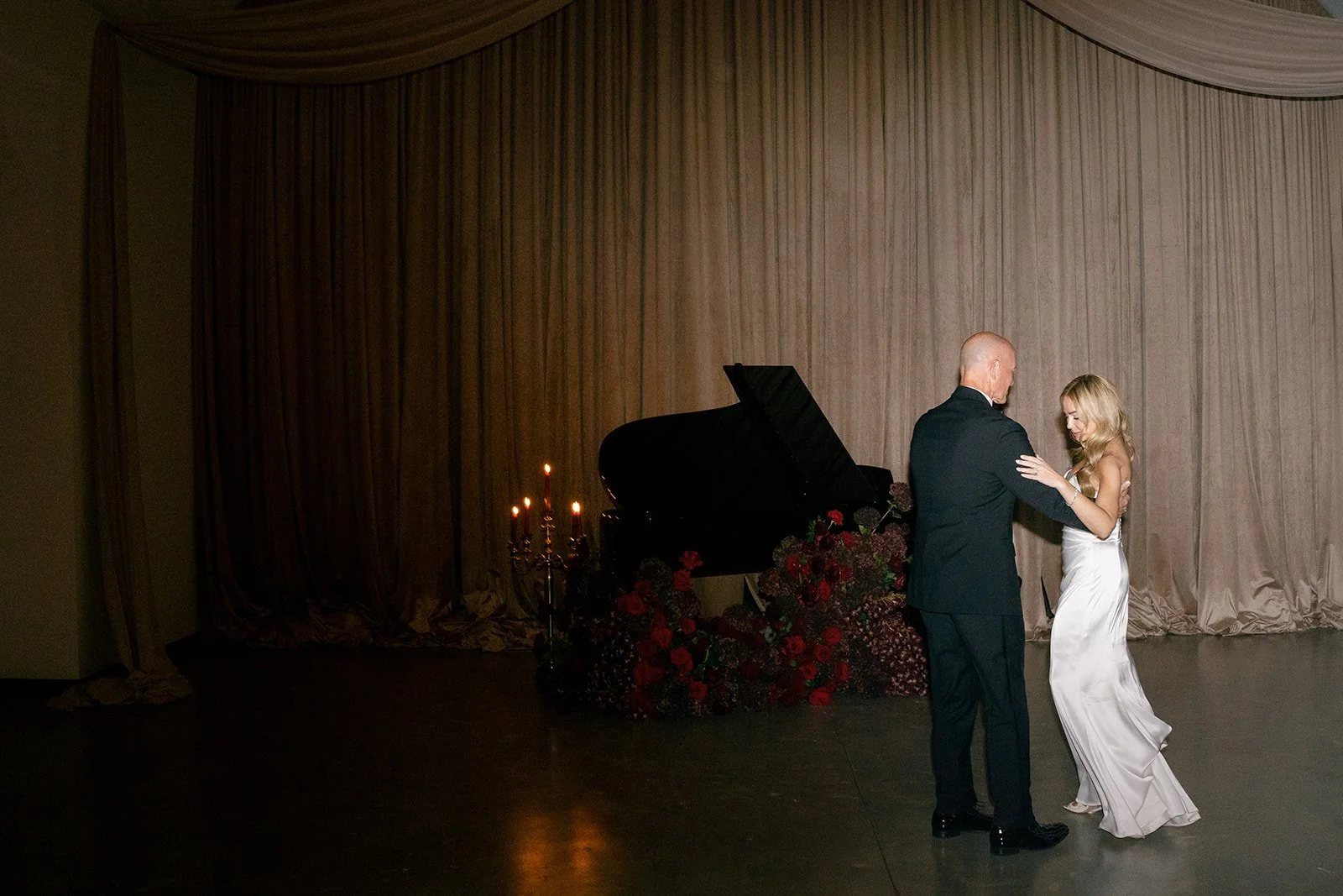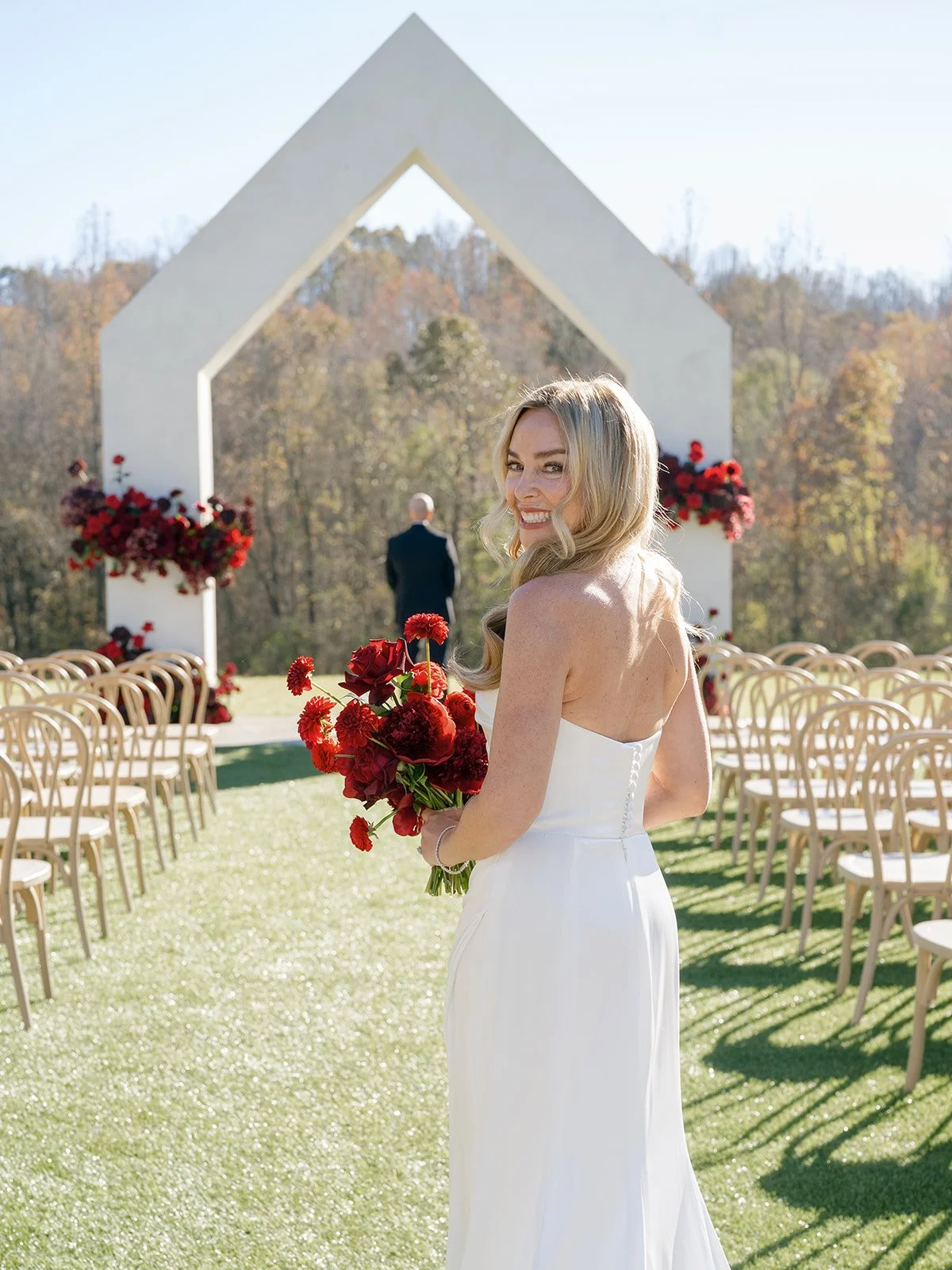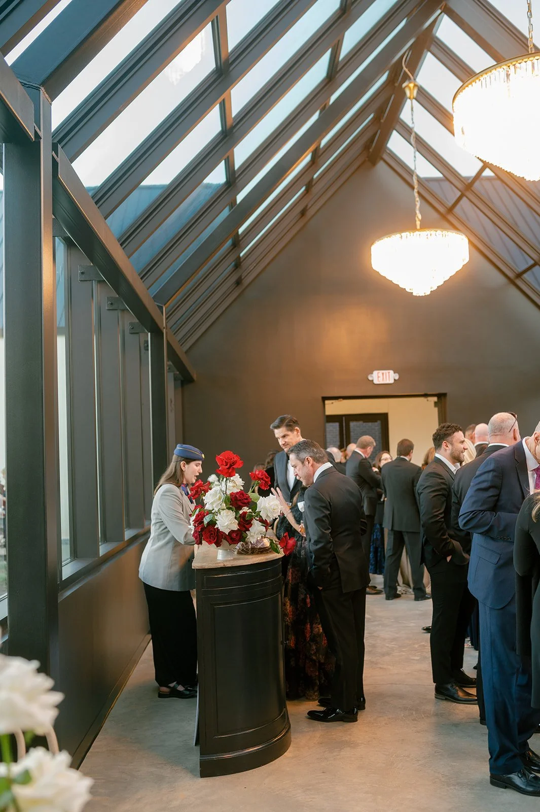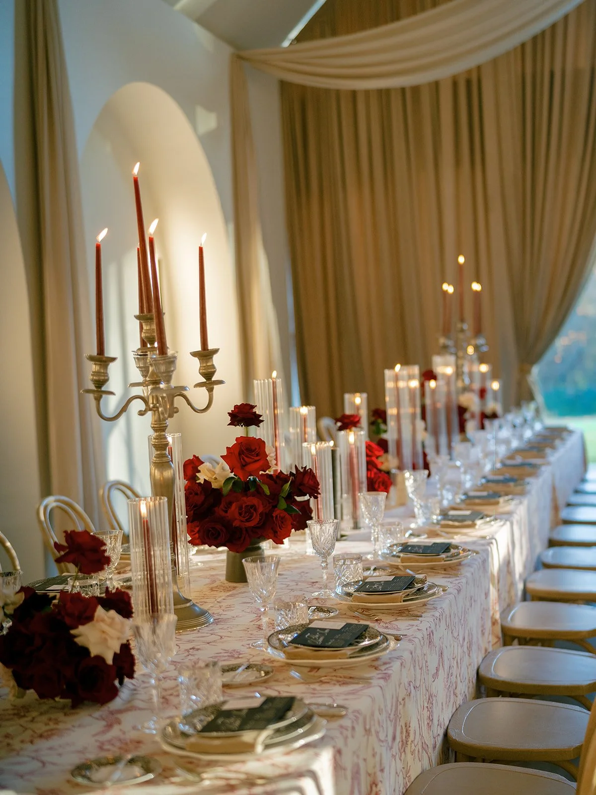 Following the ceremony guests headed to an indoor reception. Ivory fabric was draped from the ceiling that matched the ivory cushioned chairs. White and red pattern tablecloths covered tables were lined with red rose centerpieces in grey vases created by Seeded Events and Design. Tall, red taper candles in clear glass hurricane vases and silver candlelabras illuminated the space. White and black patterned dinnerware with black menus served as place settings. Guests enjoyed a meal featuring their choice of chicken, crab cakes, or filet. Signature cocktails from Family Catering Service included Toasted Pecan Old Fashioned, Star Gazer Spritz, or Blood Orange Mule. The dessert table held various choices including a three-tier white buttercream wedding cake with red floral accents. The bride changed into a long sleeve short lace dress and fur wrap for dancing to music from DJ Barkz Beats. The newlyweds got a sparkler send off from DJ Jay Rogers and all in attendance.