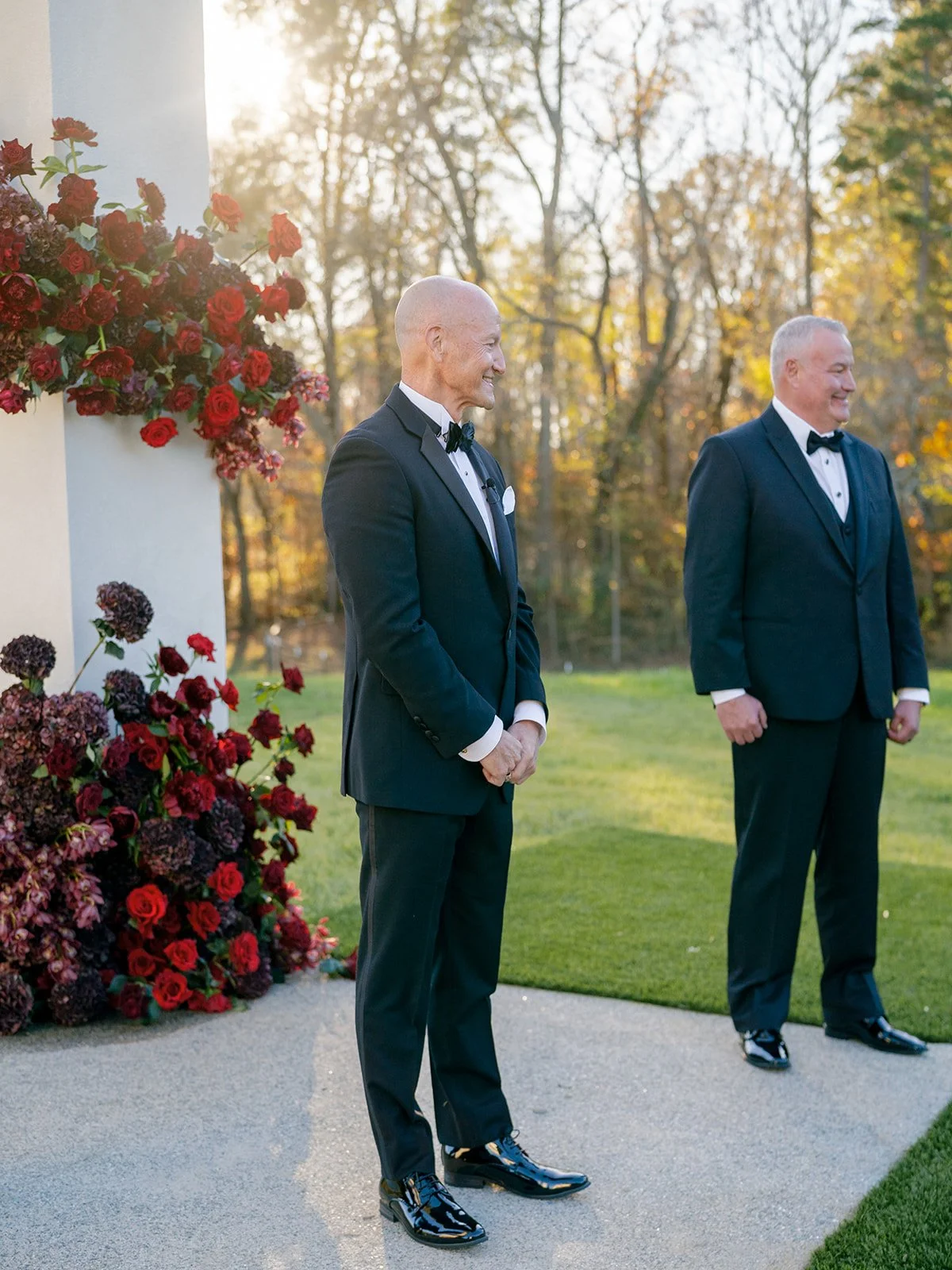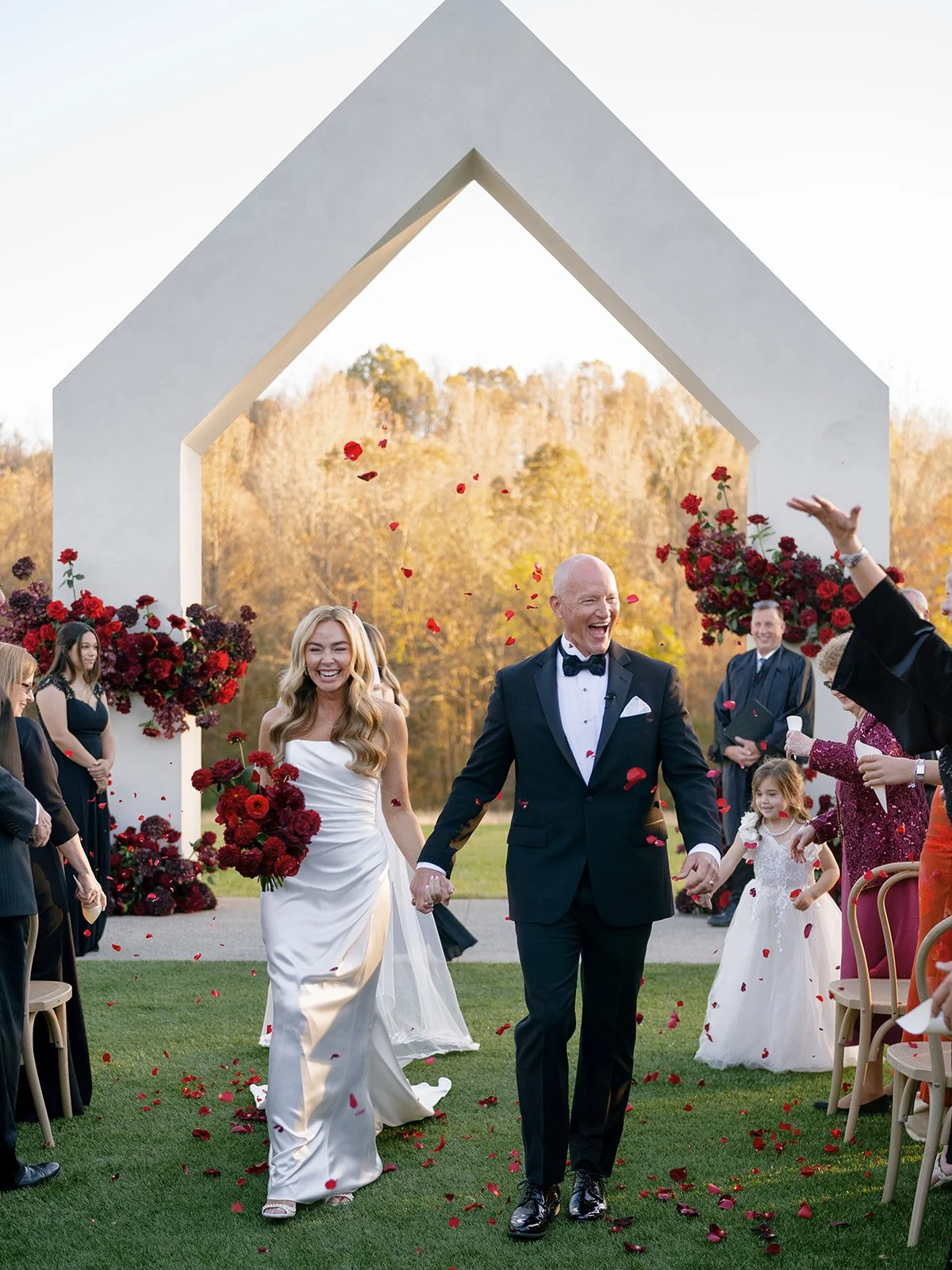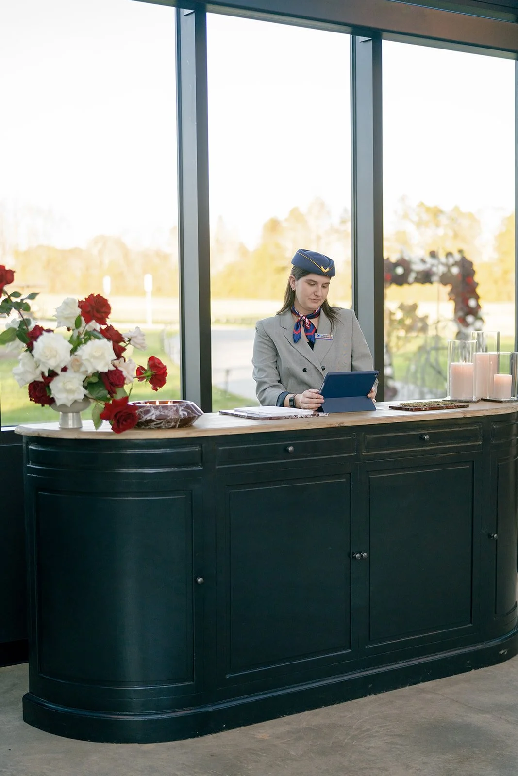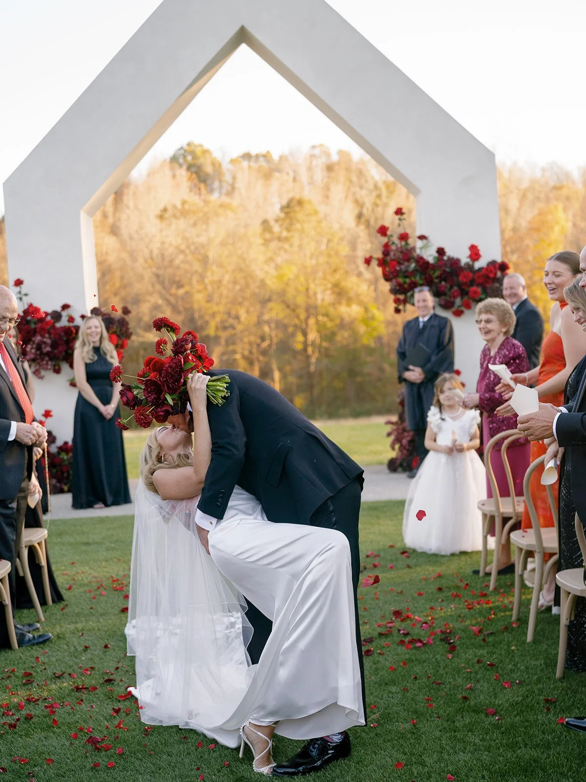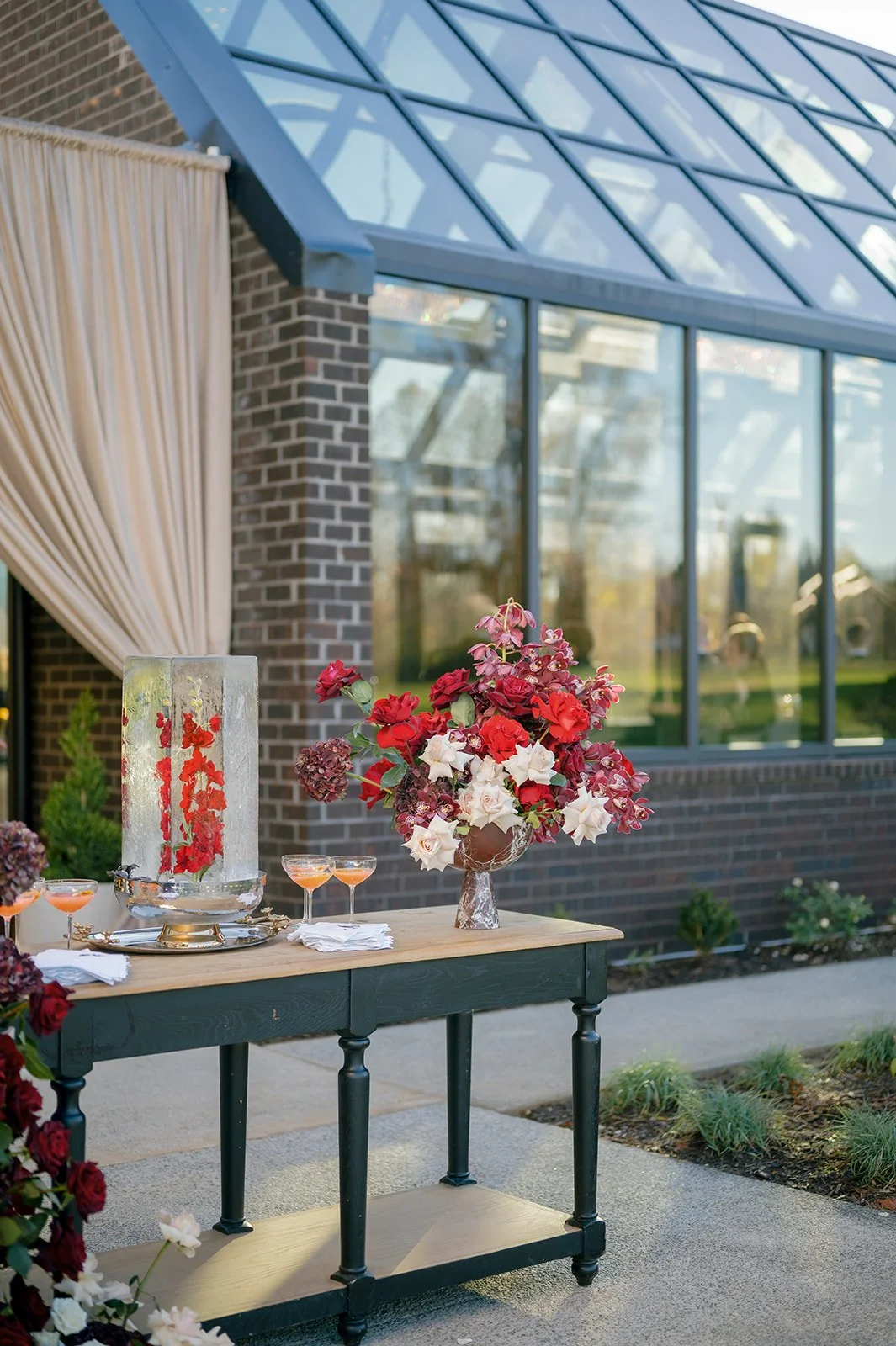 Following the ceremony guests headed to an indoor reception. Ivory fabric was draped from the ceiling that matched the ivory cushioned chairs. White and red pattern tablecloths covered tables were lined with red rose centerpieces in grey vases created by Seeded Events and Design. Tall, red taper candles in clear glass hurricane vases and silver candlelabras illuminated the space. White and black patterned dinnerware with black menus served as place settings. Guests enjoyed a meal featuring their choice of chicken, crab cakes, or filet. Signature cocktails from Family Catering Service included Toasted Pecan Old Fashioned, Star Gazer Spritz, or Blood Orange Mule. The dessert table held various choices including a three-tier white buttercream wedding cake with red floral accents. The bride changed into a long sleeve short lace dress and fur wrap for dancing to music from DJ Barkz Beats. The newlyweds got a sparkler send off from DJ Jay Rogers and all in attendance.