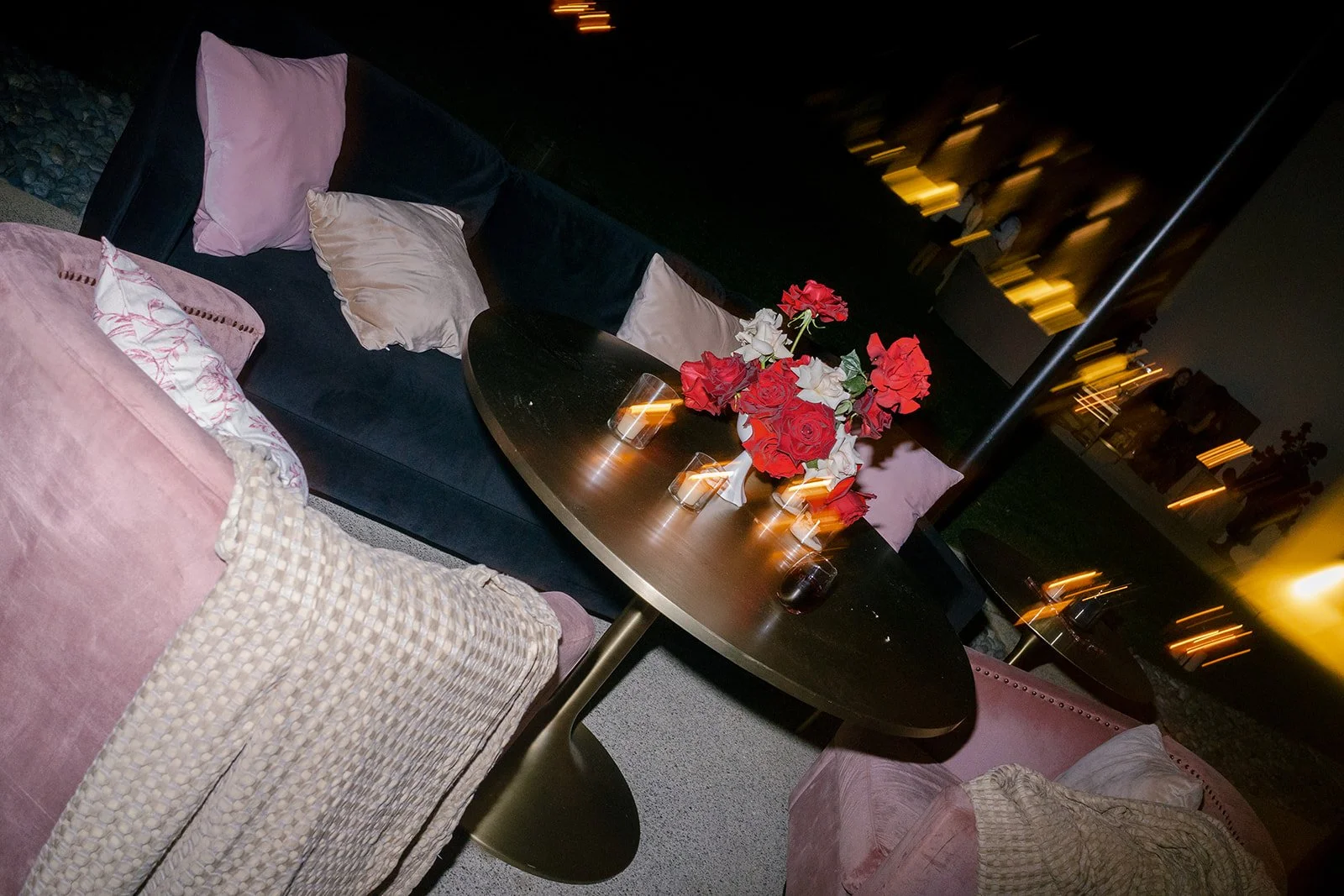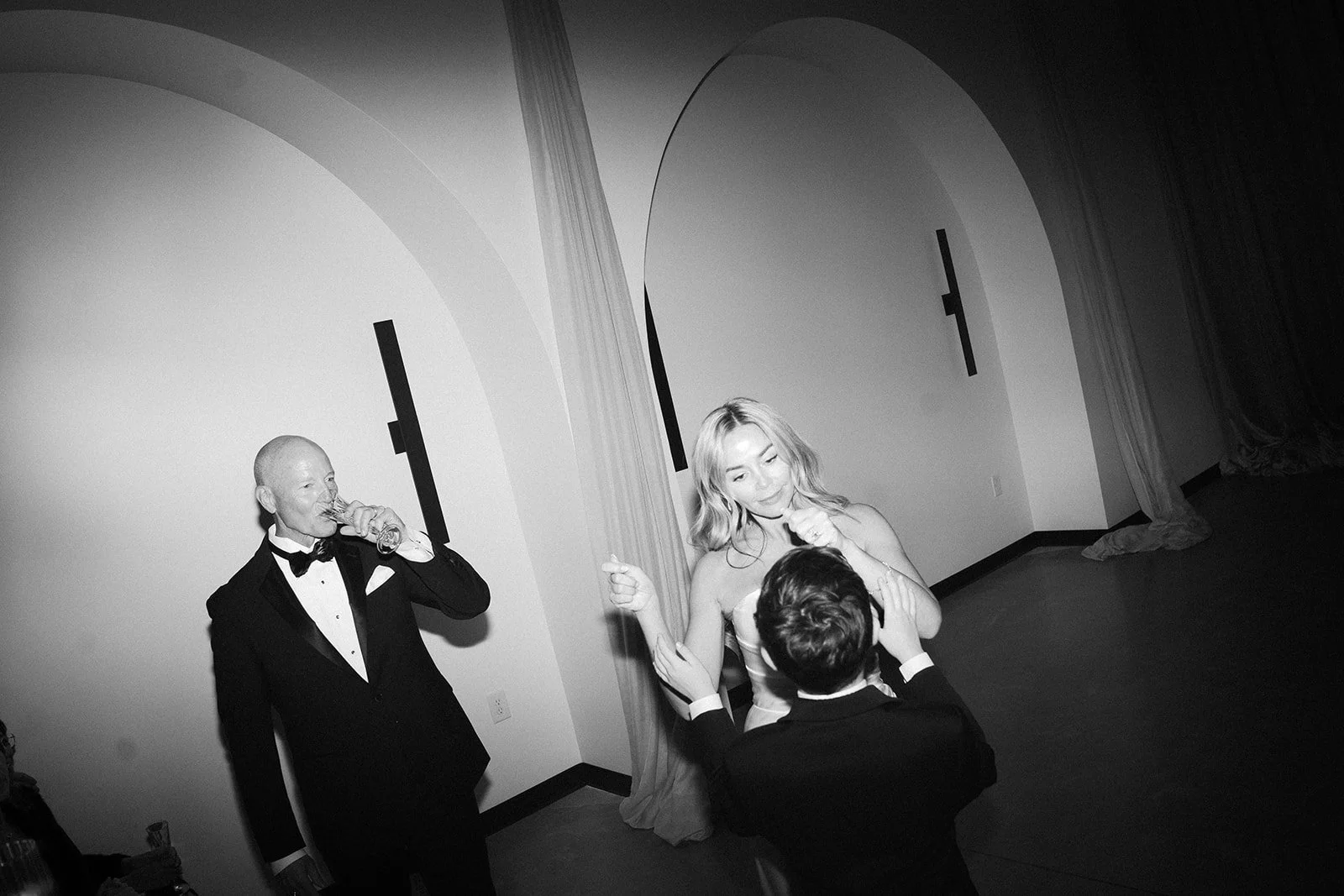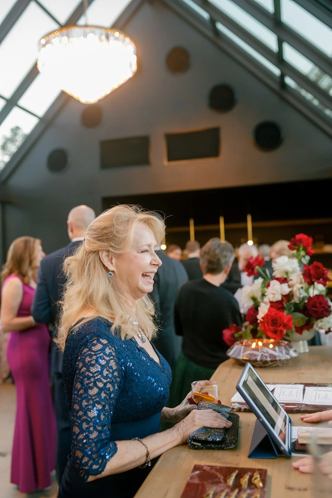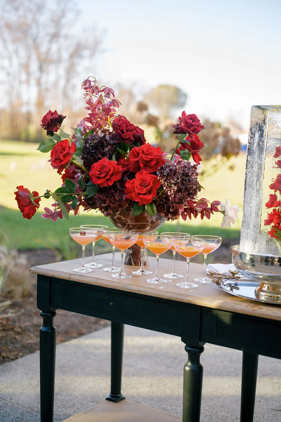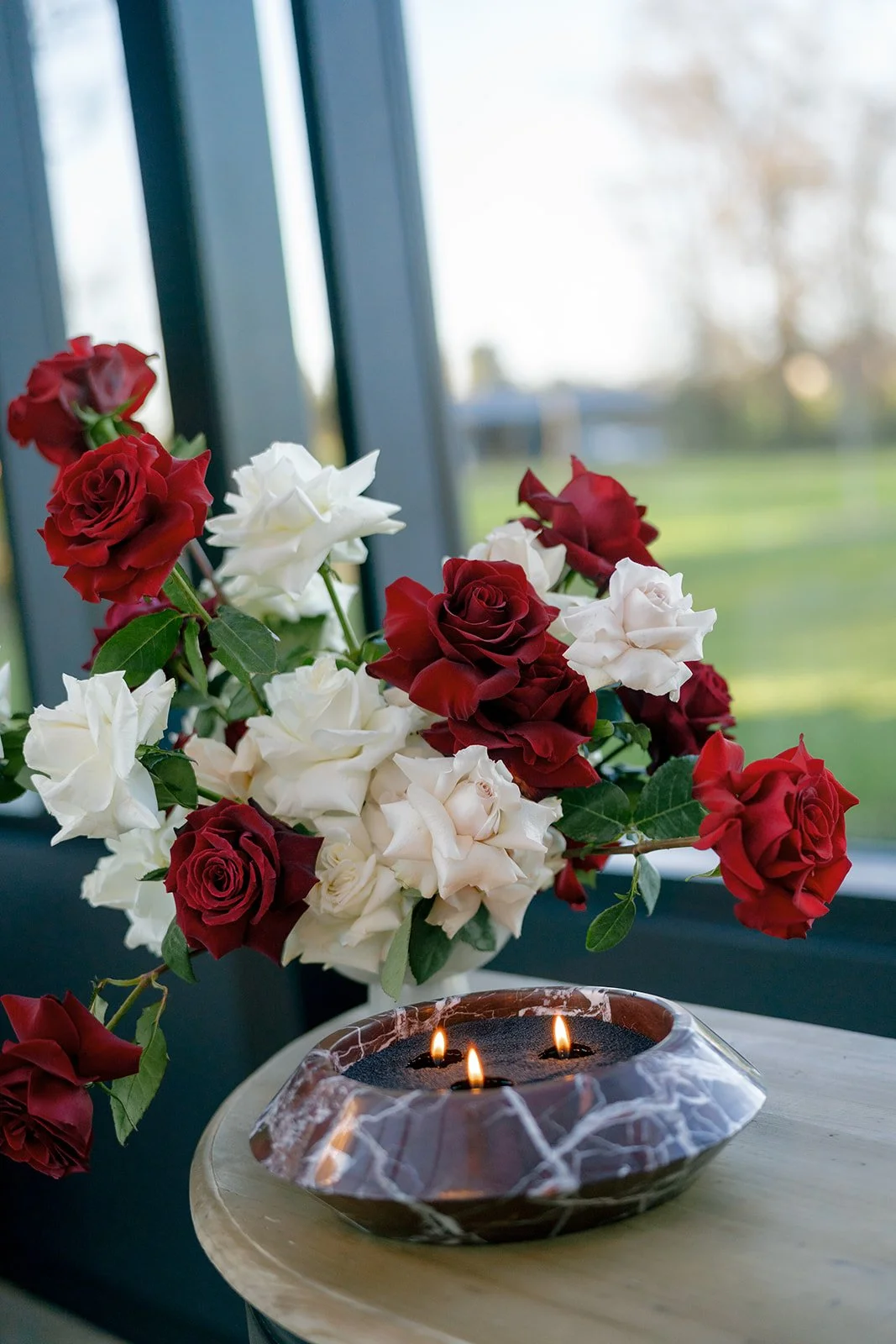 Following the ceremony guests headed to an indoor reception. Ivory fabric was draped from the ceiling that matched the ivory cushioned chairs. White and red pattern tablecloths covered tables were lined with red rose centerpieces in grey vases created by Seeded Events and Design. Tall, red taper candles in clear glass hurricane vases and silver candlelabras illuminated the space. White and black patterned dinnerware with black menus served as place settings. Guests enjoyed a meal featuring their choice of chicken, crab cakes, or filet. Signature cocktails from Family Catering Service included Toasted Pecan Old Fashioned, Star Gazer Spritz, or Blood Orange Mule. The dessert table held various choices including a three-tier white buttercream wedding cake with red floral accents. The bride changed into a long sleeve short lace dress and fur wrap for dancing to music from DJ Barkz Beats. The newlyweds got a sparkler send off from DJ Jay Rogers and all in attendance.