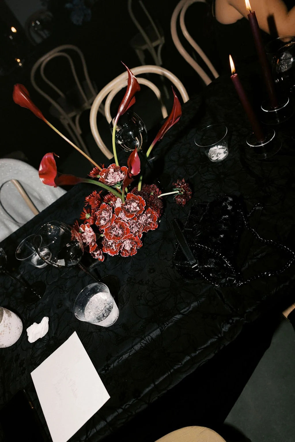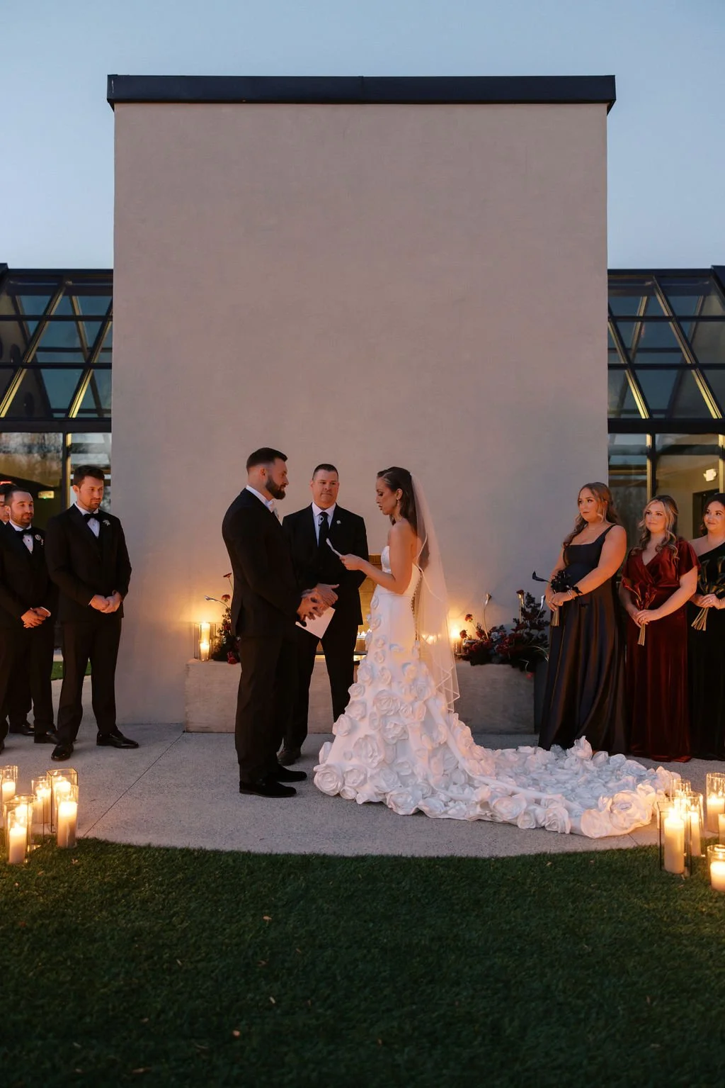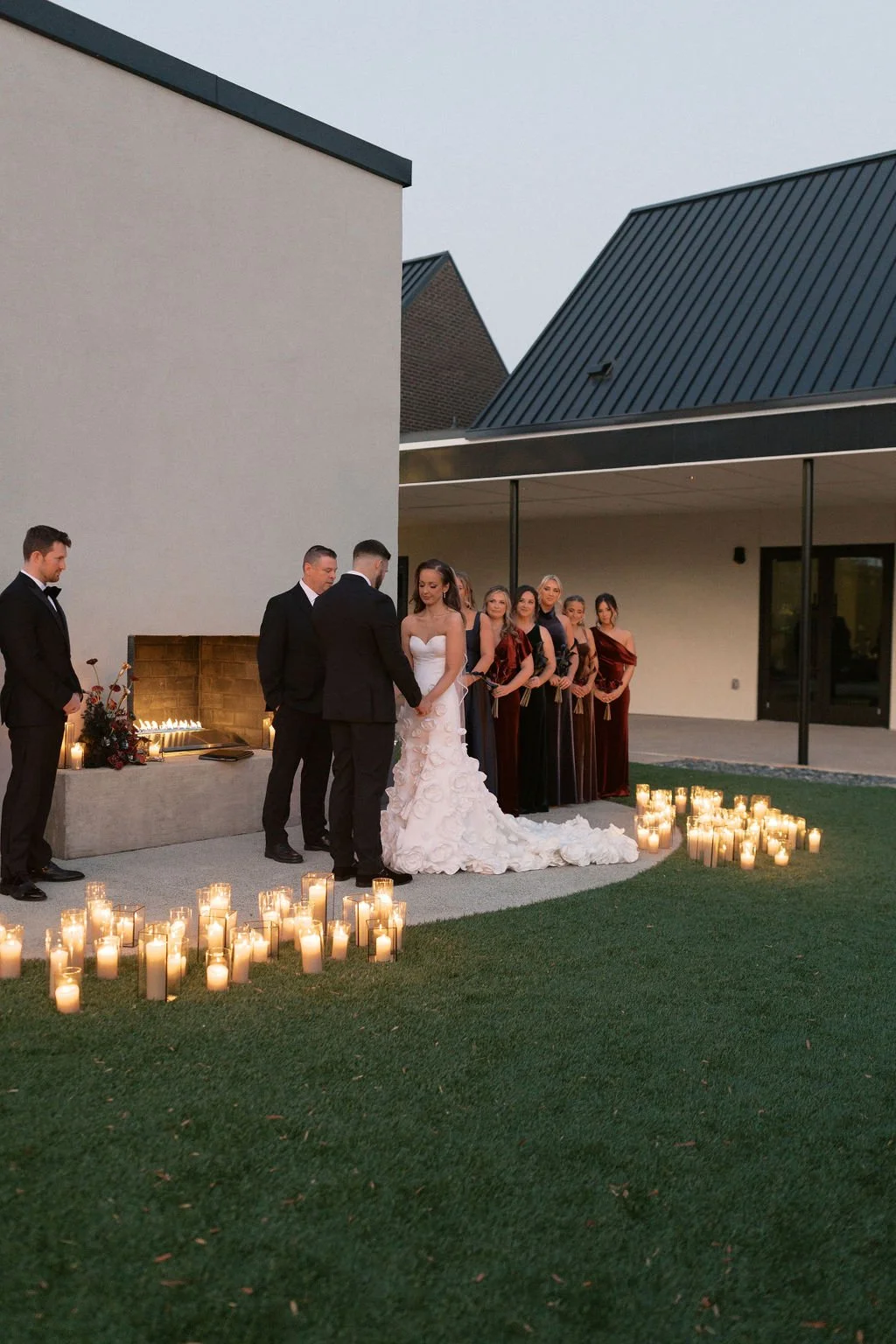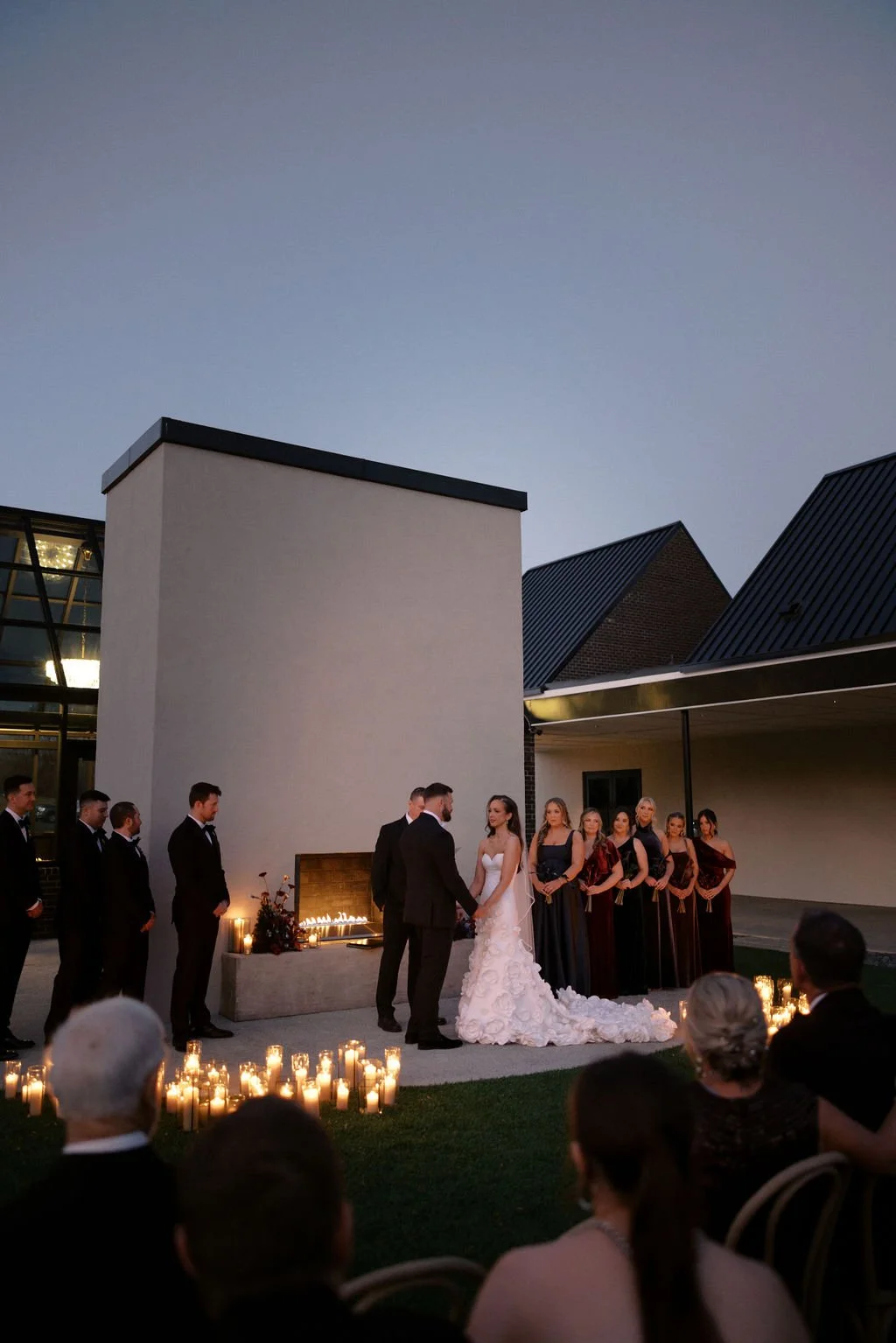 Guests gathered outside for a candlelit ceremony at the stone hearth. They said ‘I do’ surrounded by loved ones, candle flame, and beautiful floral arrangements from Seeded Events and Design. From there, guests moved inside for a seated reception illuminated by candles and decorated with moody florals, keeping on theme with the red and black color palette. Guests enjoyed dinner, drinks, and dancing as the celebration continued into the dark of night. We absolutely adored this red and black celebration for Madison & Dylan; moody in all of the right ways!