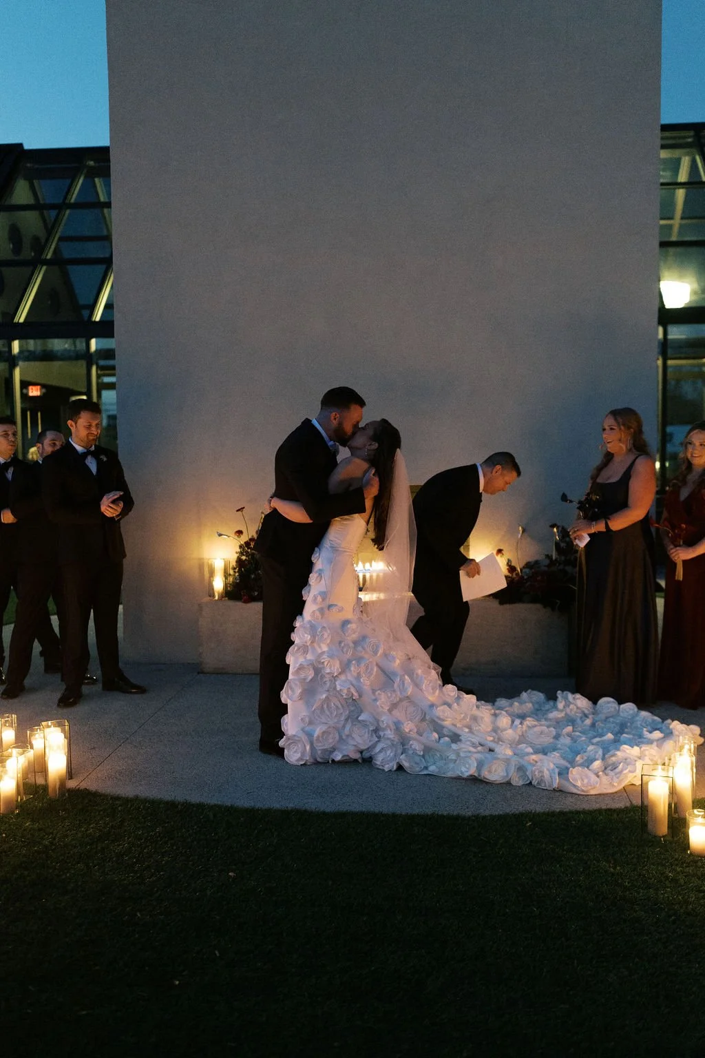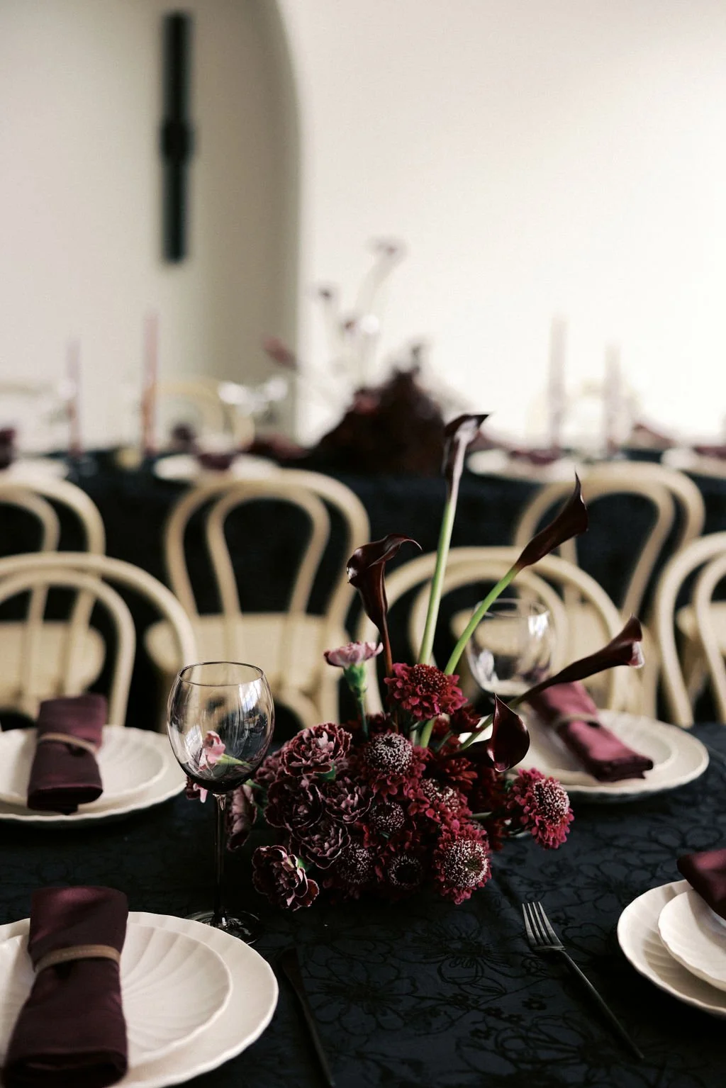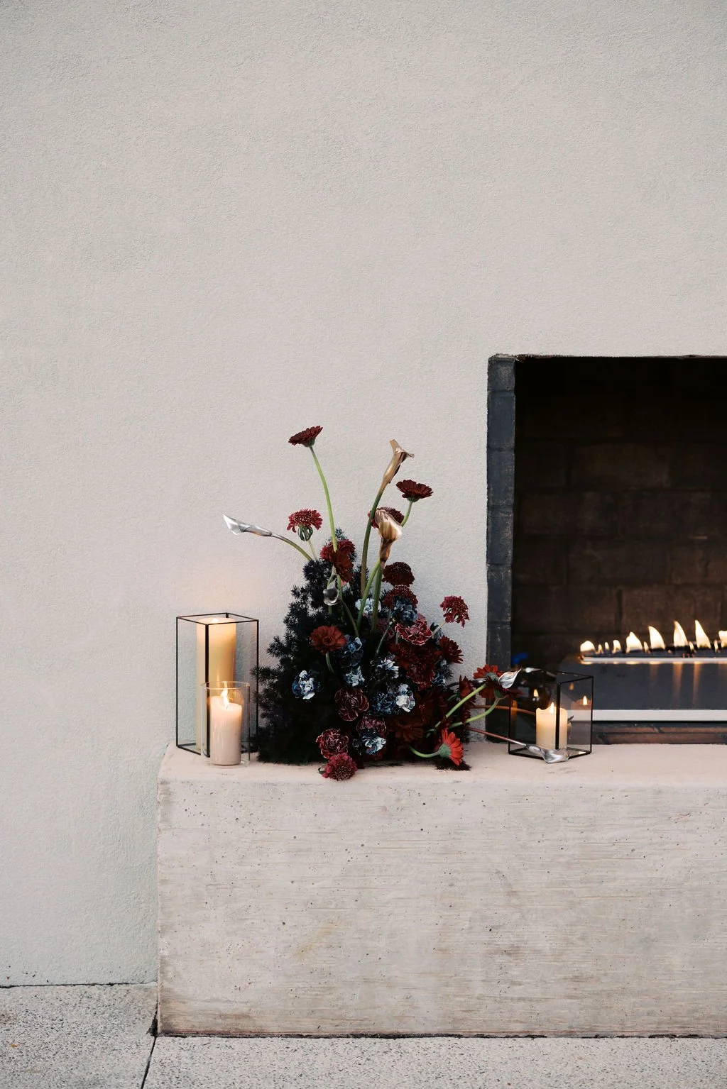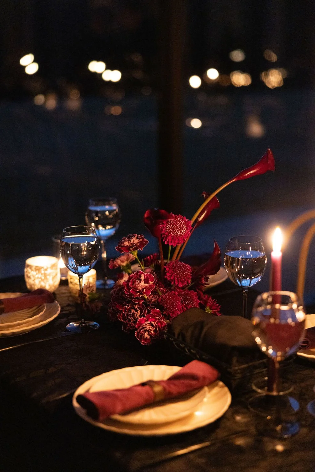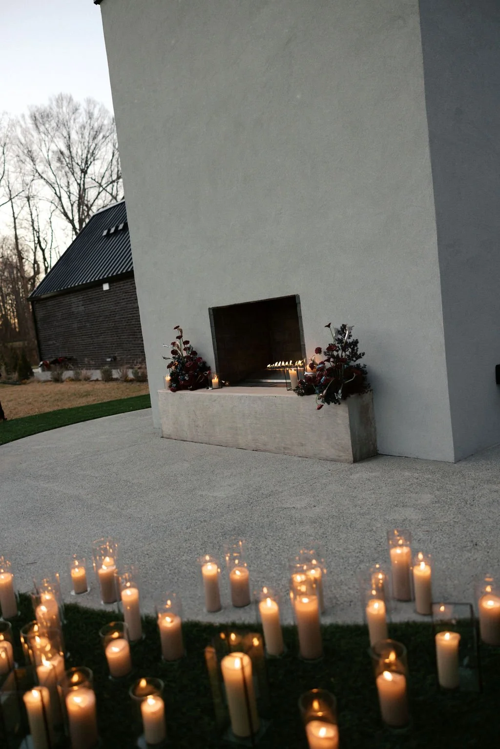 Guests gathered outside for a candlelit ceremony at the stone hearth. They said ‘I do’ surrounded by loved ones, candle flame, and beautiful floral arrangements from Seeded Events and Design. From there, guests moved inside for a seated reception illuminated by candles and decorated with moody florals, keeping on theme with the red and black color palette. Guests enjoyed dinner, drinks, and dancing as the celebration continued into the dark of night. We absolutely adored this red and black celebration for Madison & Dylan; moody in all of the right ways!