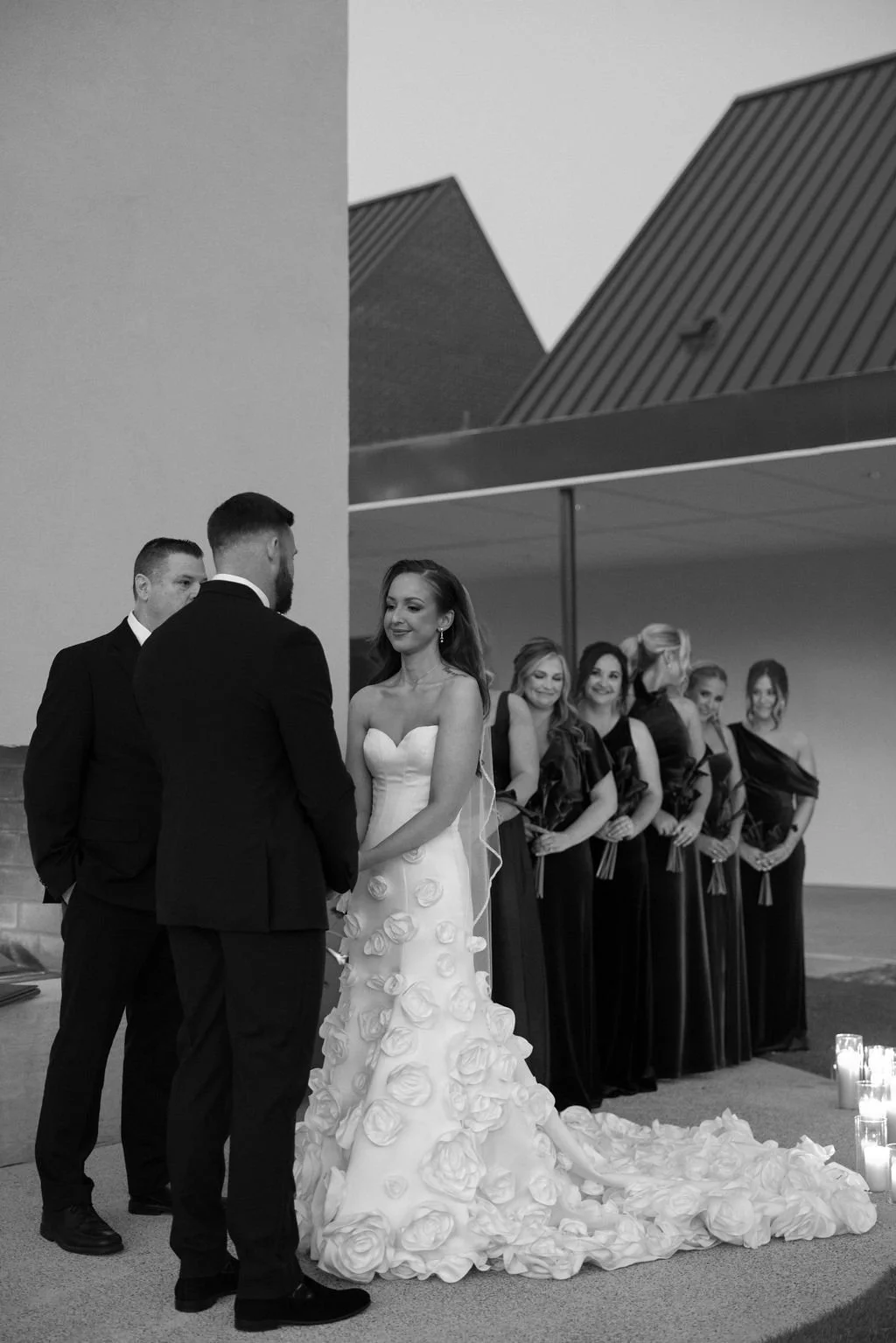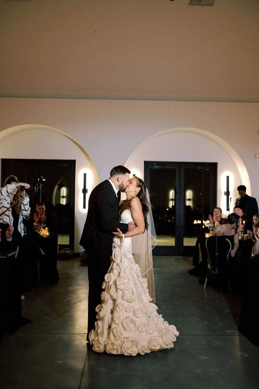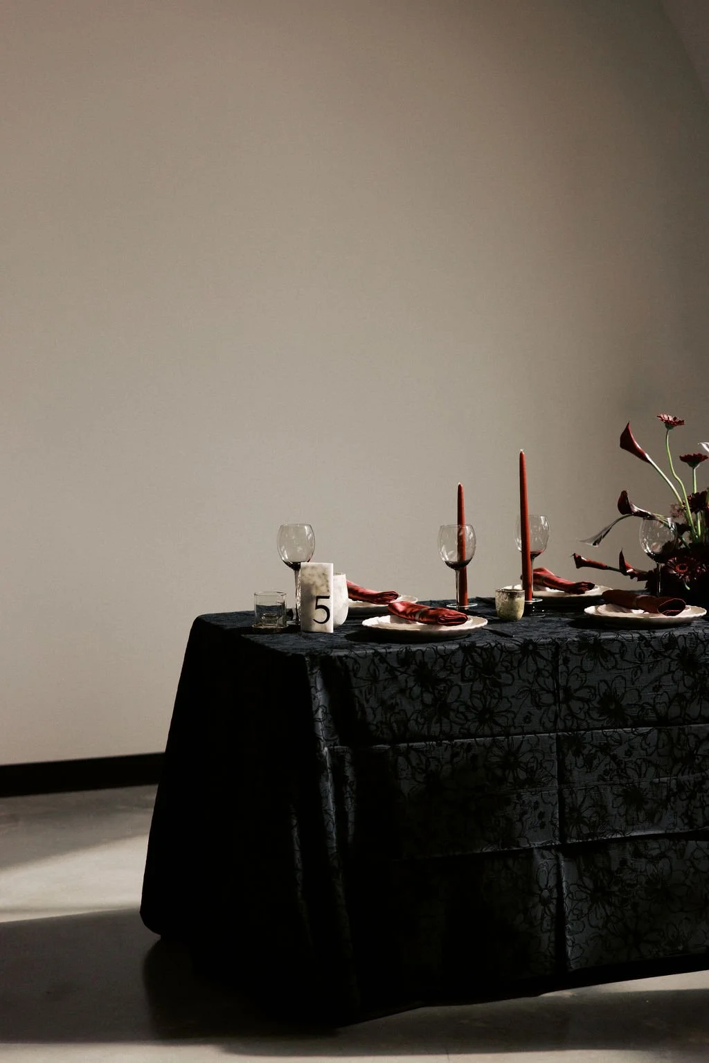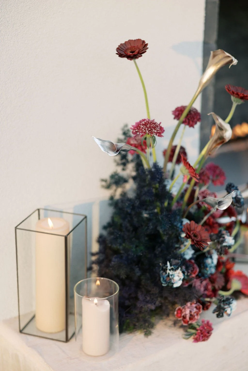 Guests gathered outside for a candlelit ceremony at the stone hearth. They said ‘I do’ surrounded by loved ones, candle flame, and beautiful floral arrangements from Seeded Events and Design. From there, guests moved inside for a seated reception illuminated by candles and decorated with moody florals, keeping on theme with the red and black color palette. Guests enjoyed dinner, drinks, and dancing as the celebration continued into the dark of night. We absolutely adored this red and black celebration for Madison & Dylan; moody in all of the right ways!
