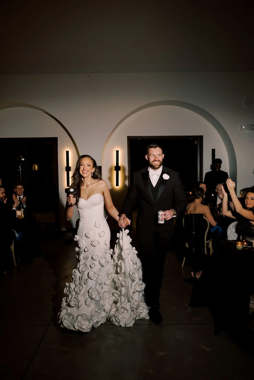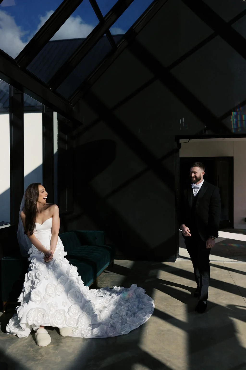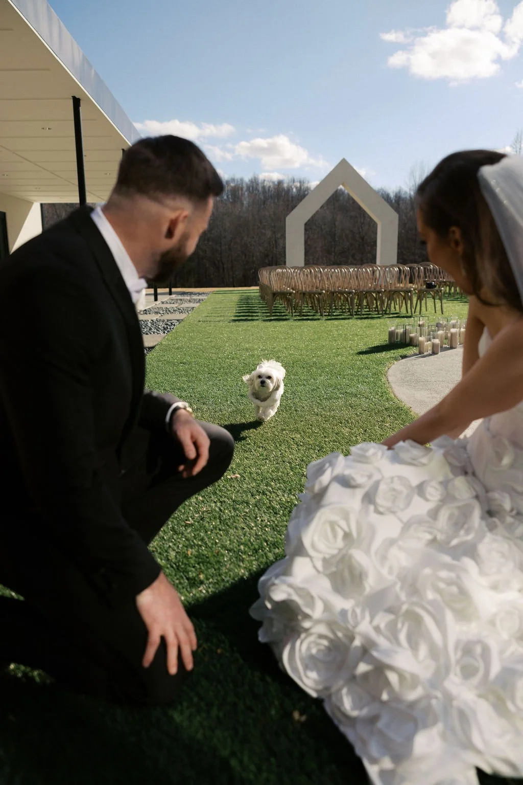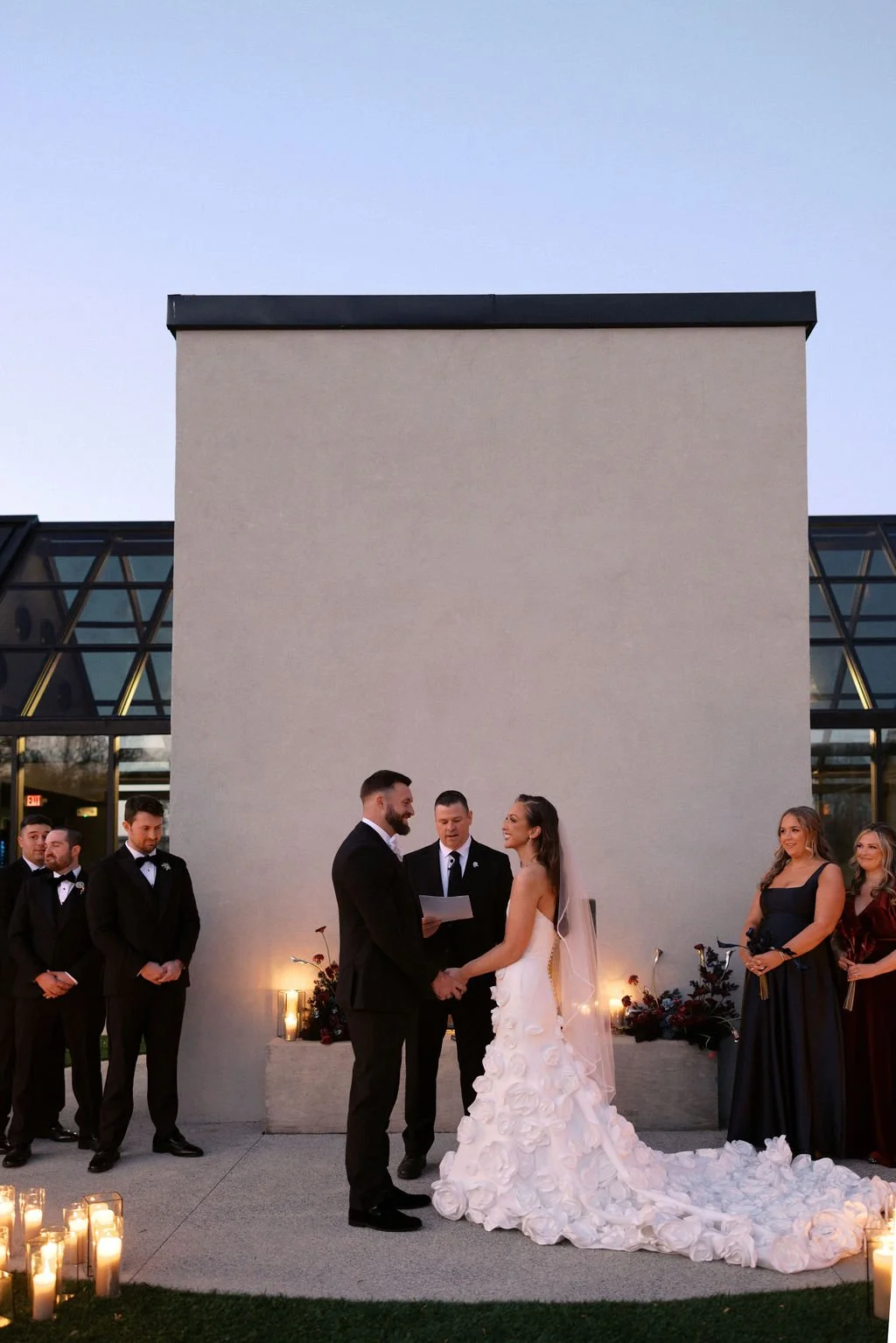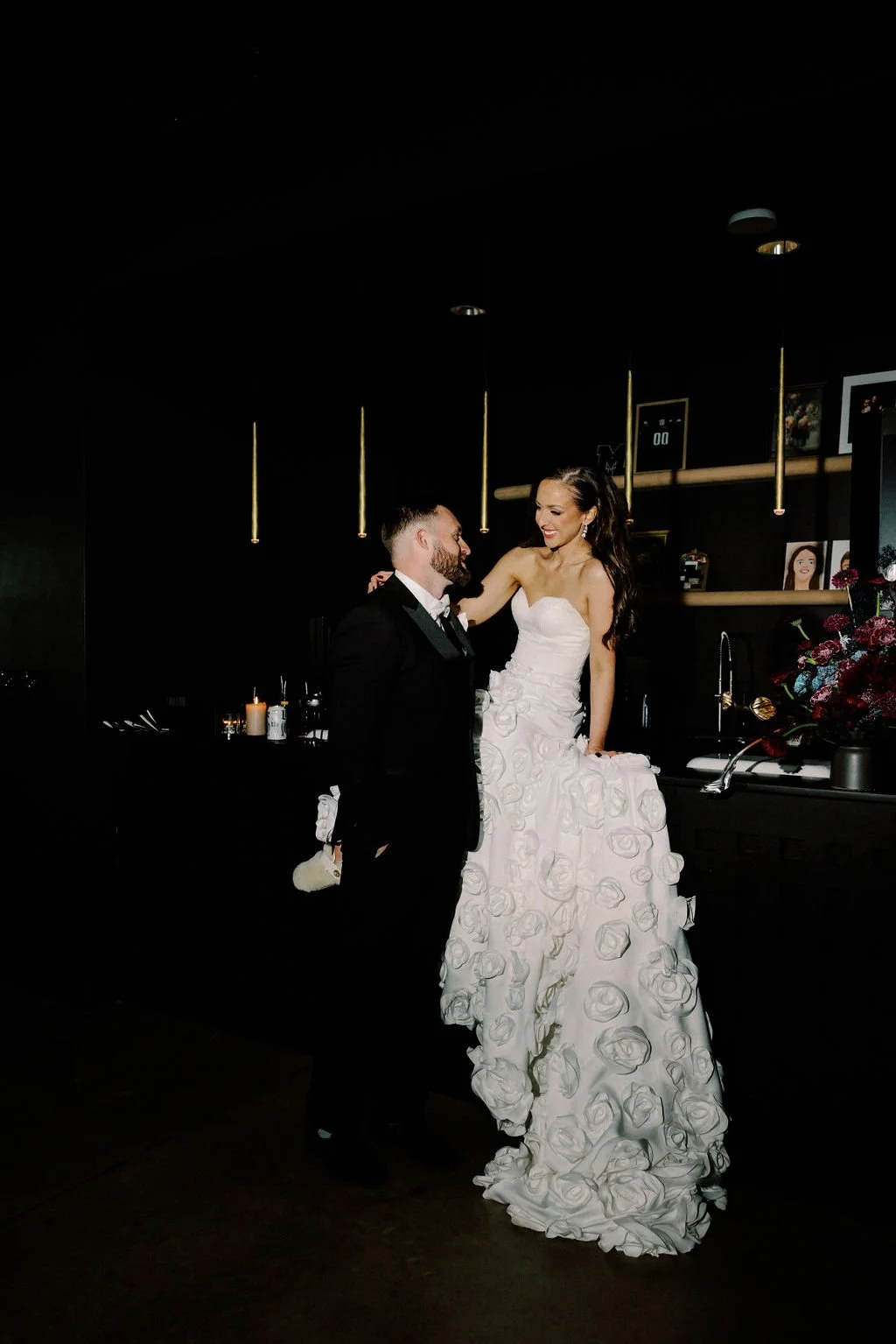 Madison and Dylan’s February wedding at The Lumen House was the perfect mix of moody and romantic, beautifully captured by Erin Michele Photo. The day started out sunny with perfect weather for portraits prior to an evening ceremony. The bride and groom to be took photos with their pup and utilized the empty reception space for more portraits. Honey + Thyme Events planned this stunning celebration with a chic red and black color palette.