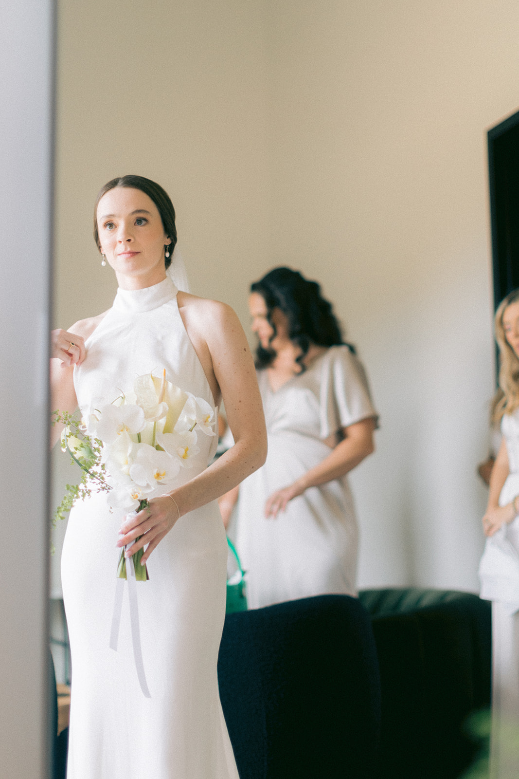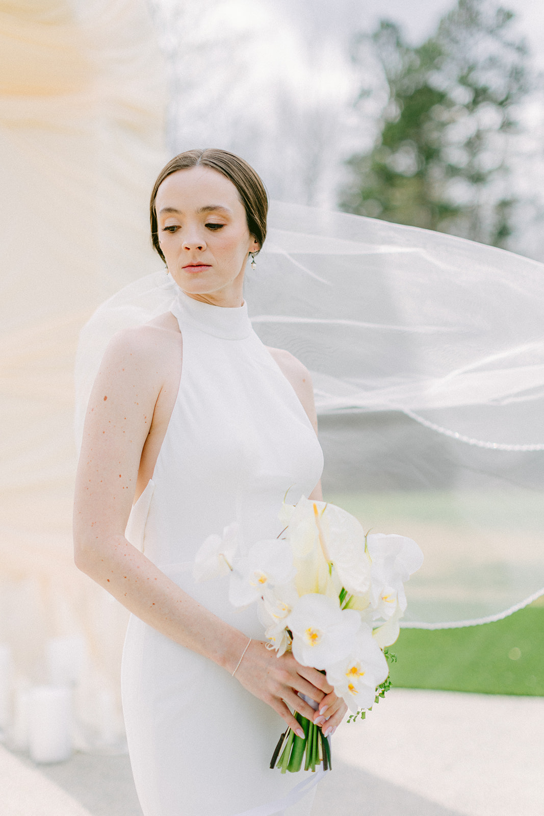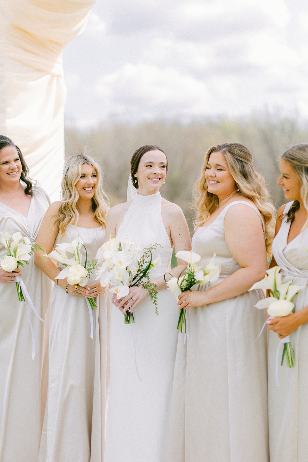 ScreenDoor Diaries planned a blissful spring wedding, in North Carolina, at The Lumen House. The bride spent the morning getting ready with her girls as Emma Harrison offered her incredible makeup services. Our bride opted for a high neck silk gown with her hair pulled back into a low bun. Her veil flowed in the wind as Phylicia Willis captured timeless outdoor portraits. She met her groom-to-be inside of the reception area for a first look and wedding portraits before the ceremony.