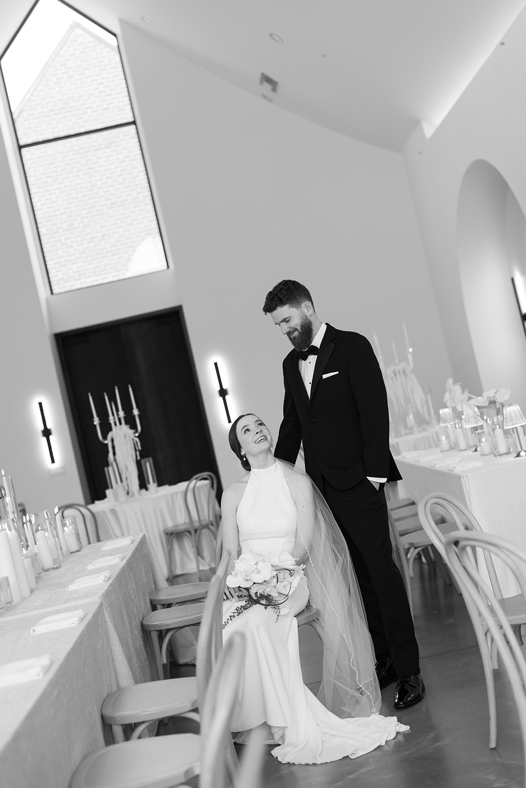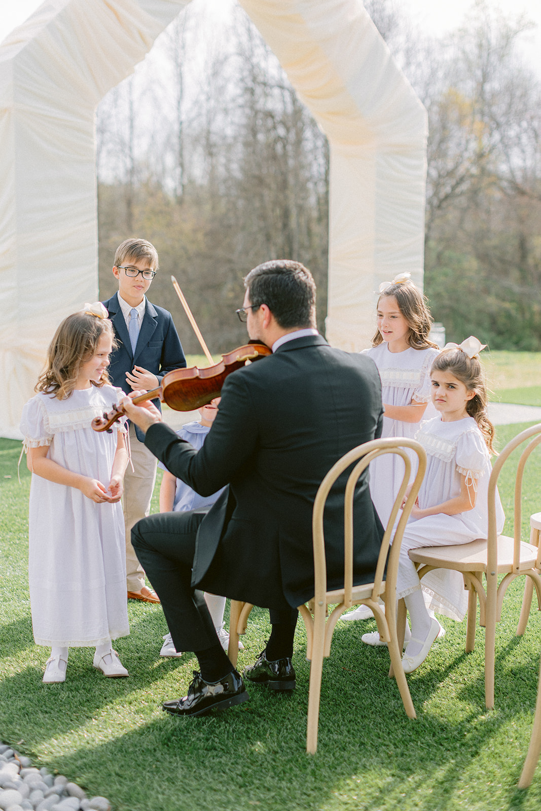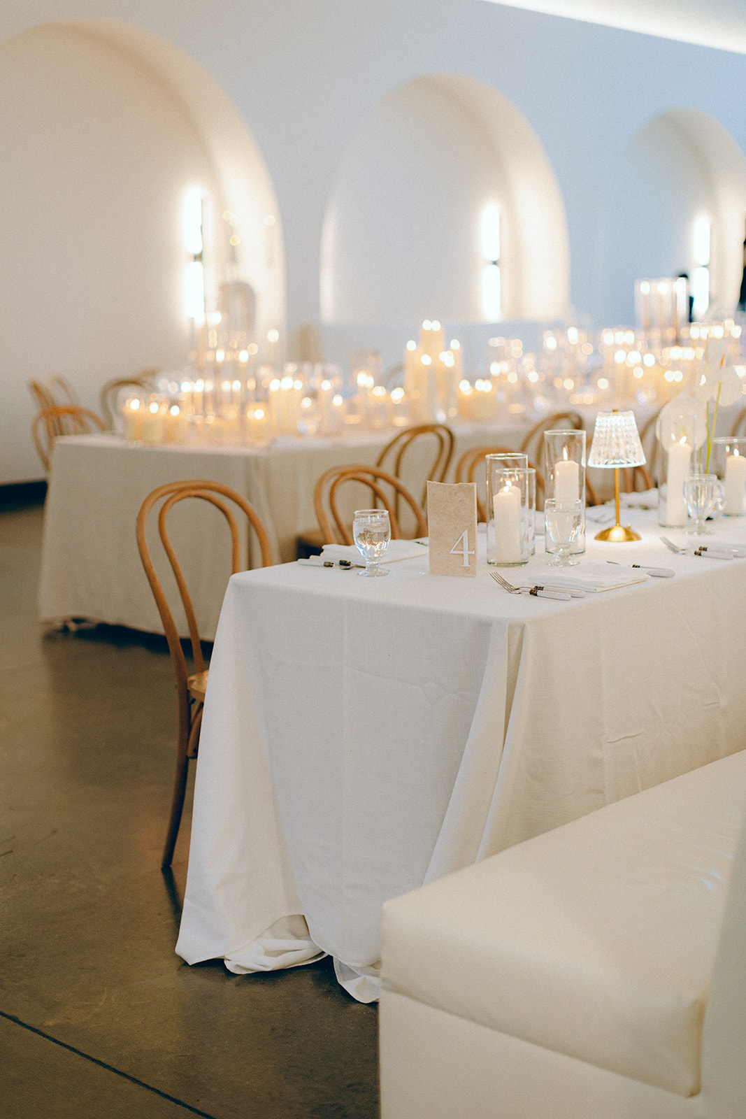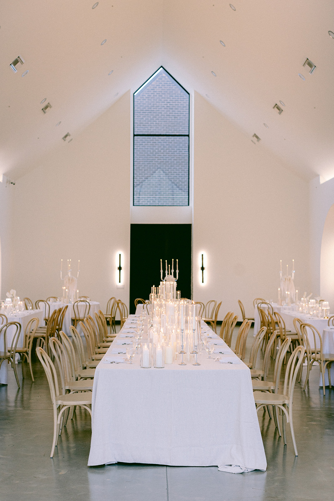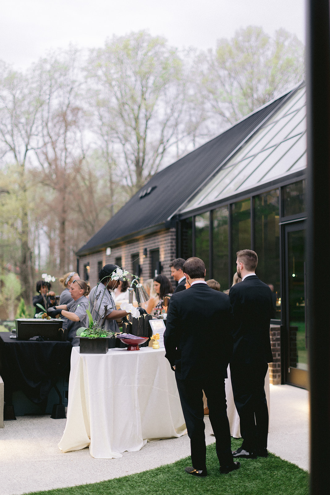 Their ceremony was held outside under the modern wedding arch. They draped fabric over the arch adding to the beautiful ambiance of the ceremony. They said ‘I do’ surrounded by loved ones on the lawn before heading into the glasshouse for a cocktail hour with bartending from QC Catering. From there guests headed into the reception area for a seated meal. The space was illuminated by the glow of candles as the tables were all lined with votives. Crisp white linens and classic white floral arrangements from Birch n’ Willow sat atop each table creating a chic, timeless look to the space. Guests headed outside for a sweet treat from the Cooling Out Ice Cream Truck, a fun way to end the night! Maye & Sadler’s wedding was the perfect spring celebration here in North Carolina and we loved hosting their big day!