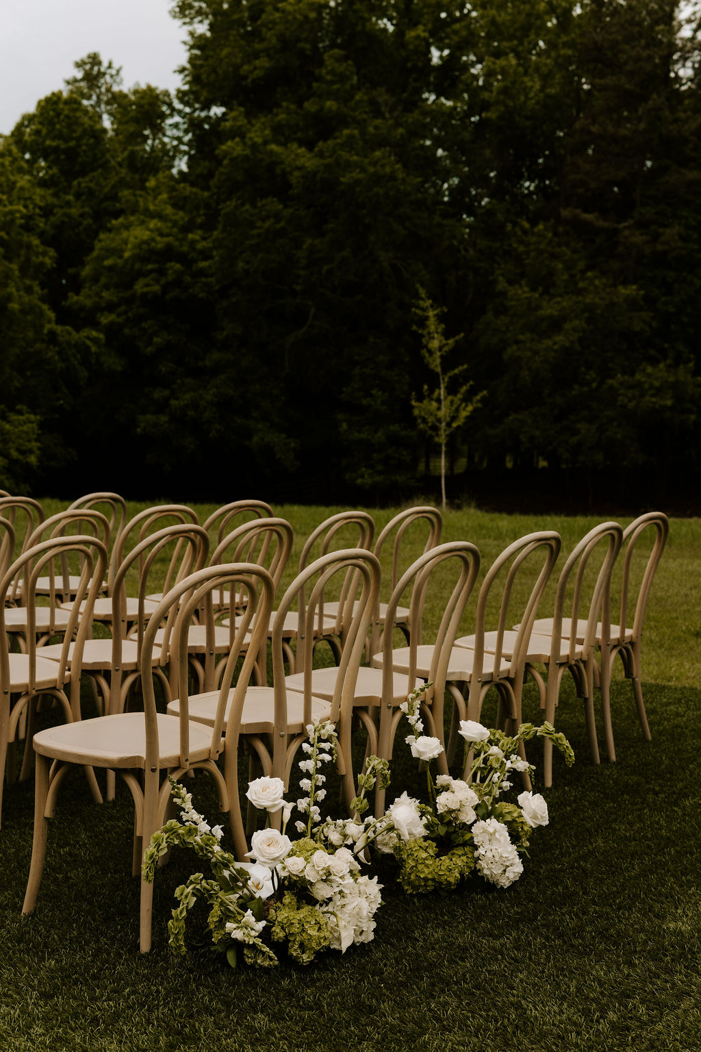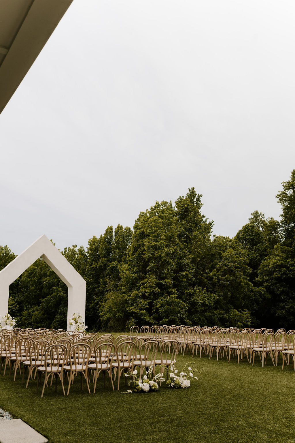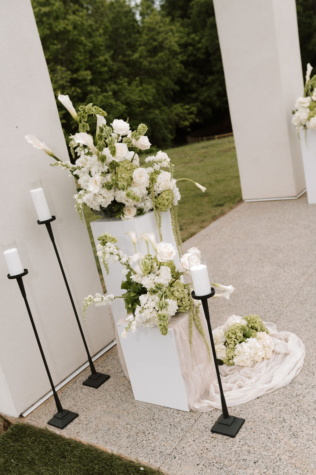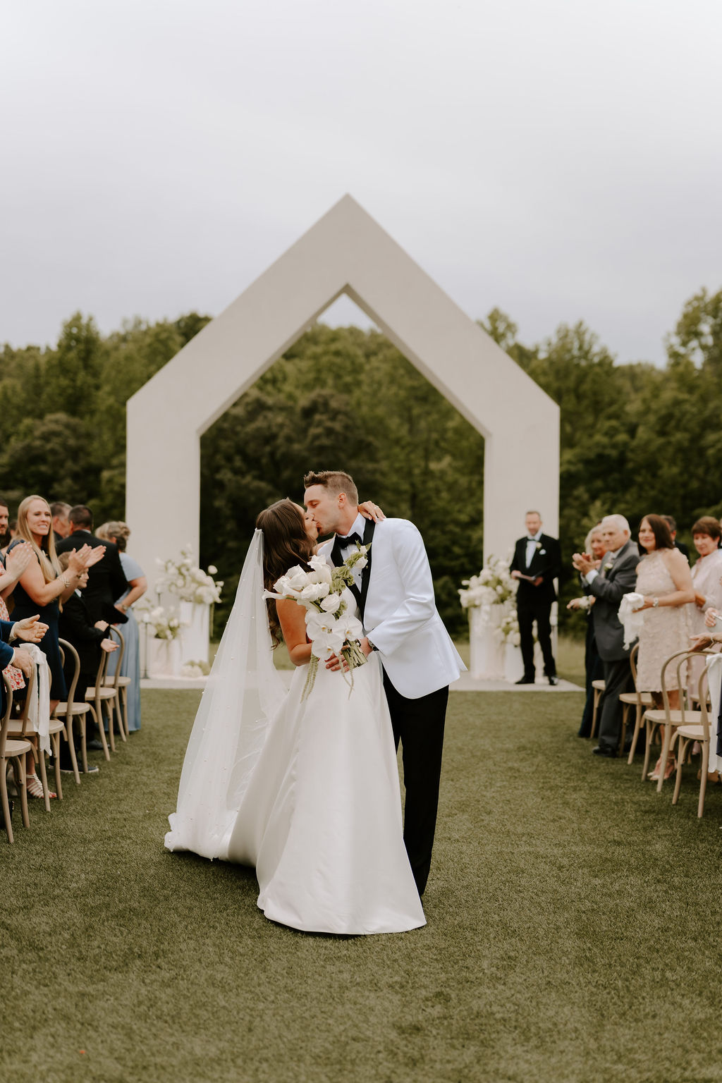 Addie Mac Events planned a stunning North Carolina wedding at The Lumen House. The day was marked with green and white accents from the beautiful floral arrangements from Flourish Wedding Designs to the tablescapes at the reception. Vines Studio effortlessly captured the day. Our bride to be got ready in the bridal suite with the help of Beauty Asylum. She chose a stunning strapless dress with a plunge waist while her groom opted for a white tuxedo. They said ‘I do’ underneath the outdoor wedding arch, surrounded by loved ones lining the lawn.