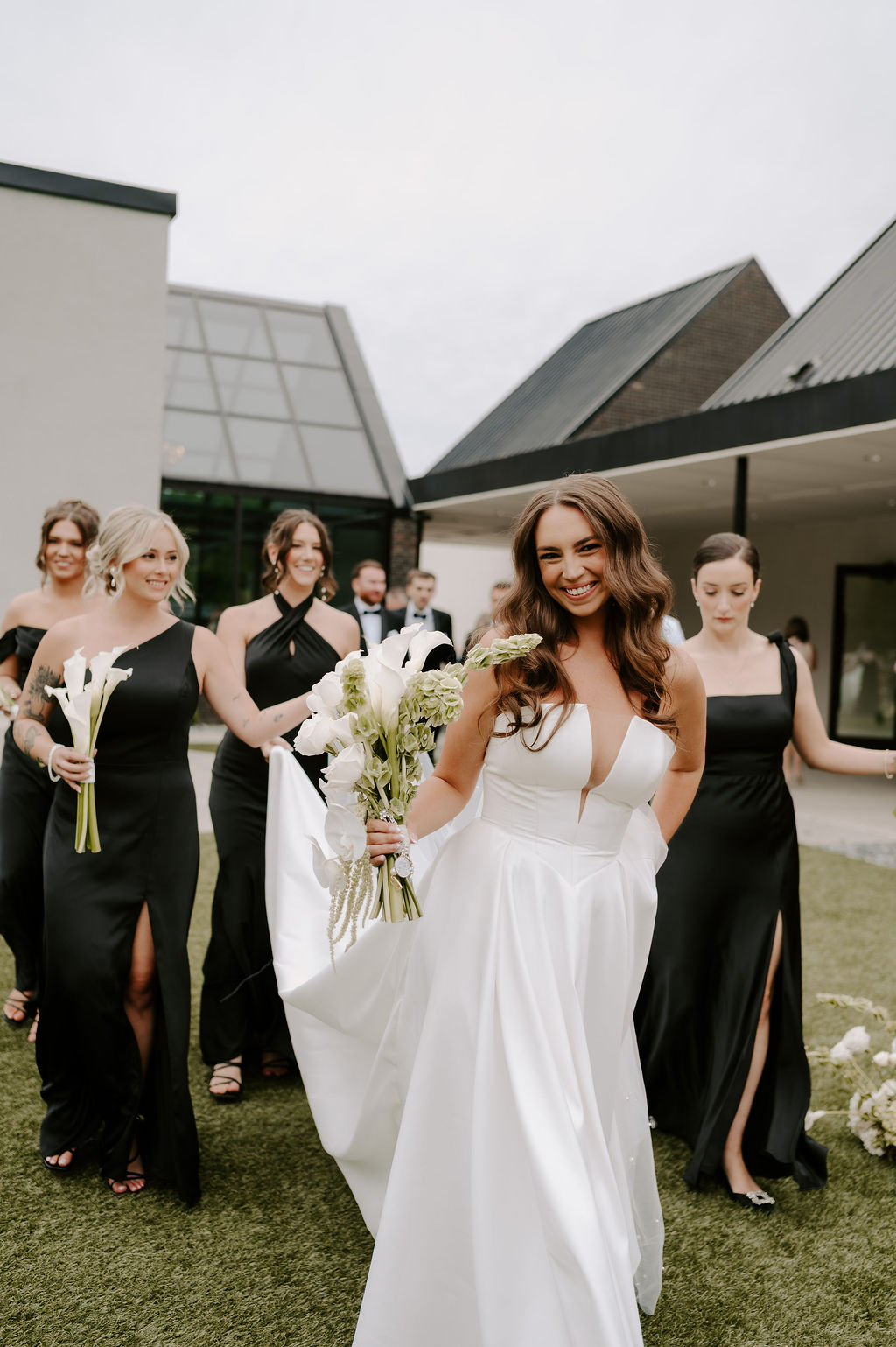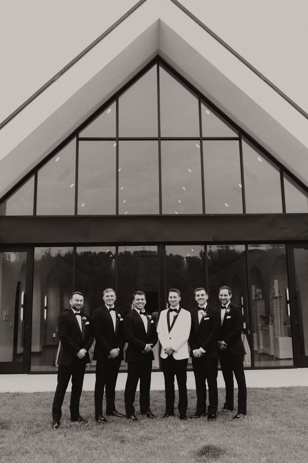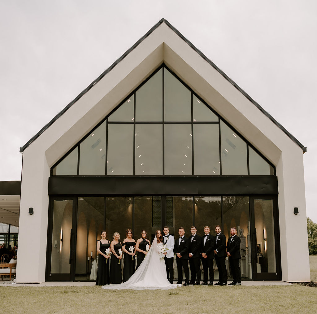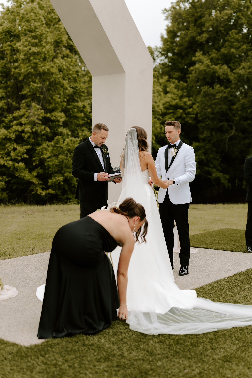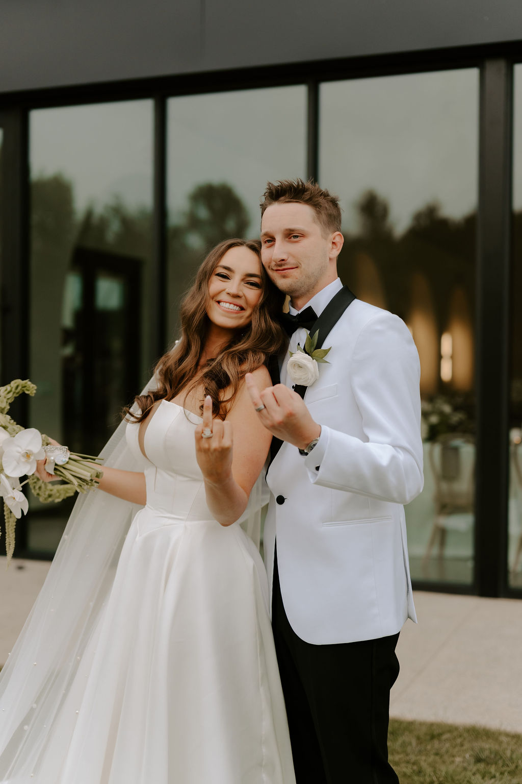 Addie Mac Events planned a stunning North Carolina wedding at The Lumen House. The day was marked with green and white accents from the beautiful floral arrangements from Flourish Wedding Designs to the tablescapes at the reception. Vines Studio effortlessly captured the day. Our bride to be got ready in the bridal suite with the help of Beauty Asylum. She chose a stunning strapless dress with a plunge waist while her groom opted for a white tuxedo. They said ‘I do’ underneath the outdoor wedding arch, surrounded by loved ones lining the lawn.