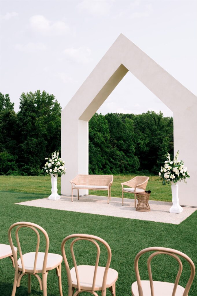 This beautiful May wedding at The Lumen House in North Carolina was marked with lush white florals, light rattan accents, and pops of green at every turn. Tailored to You Events planned every intricate detail, bringing the couple’s vision to life on our grounds. Let my People Free and The Makeup Team helped our bride look and feel her best as she and her bridesmaids got ready offsite. Once all parties arrived at The Lumen House, the ceremony was held outside on the lawn deck beneath the modern arch. Rattan lounge furniture was perfectly placed beneath the arch, beside lively floral arrangements by Carmel Florist, creating the perfect space to exchange vows. Corda Entertainment set the tone for the day with a beautiful soundtrack played on the violin. The green lawn and trees perfectly accented the outdoor space. Angela Acosta captured every beautiful moment, immortalizing the day.