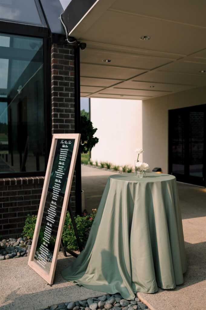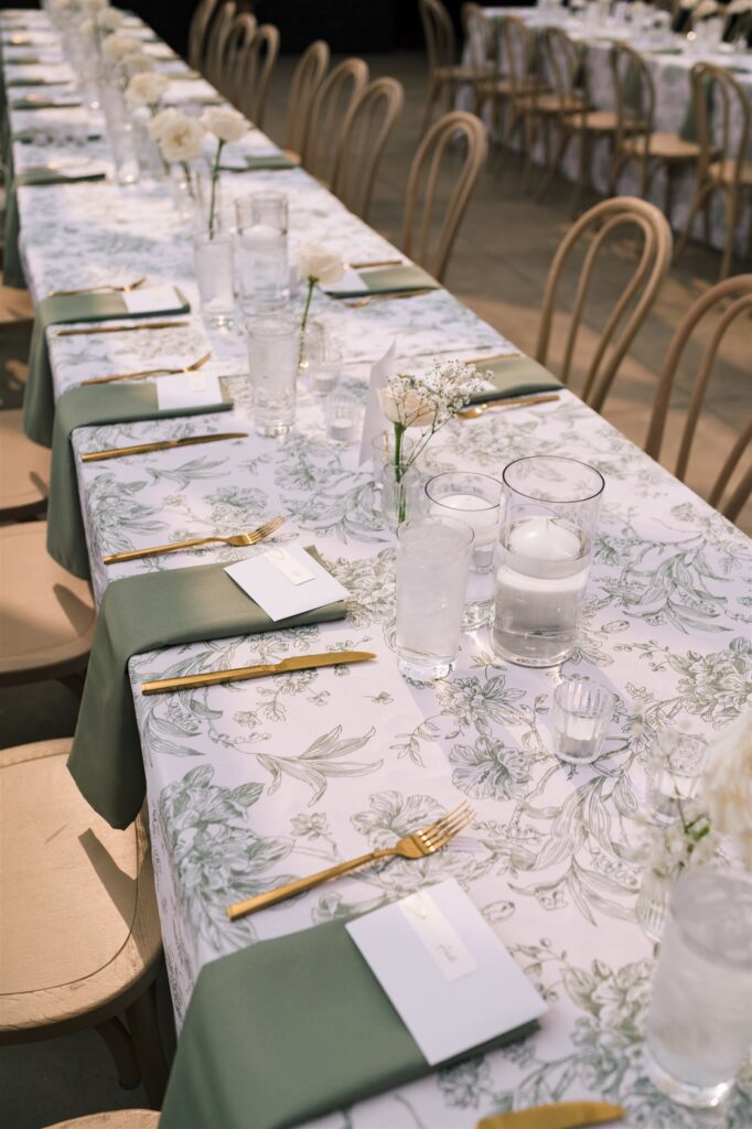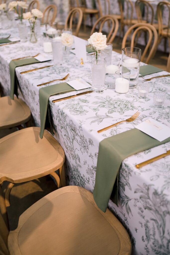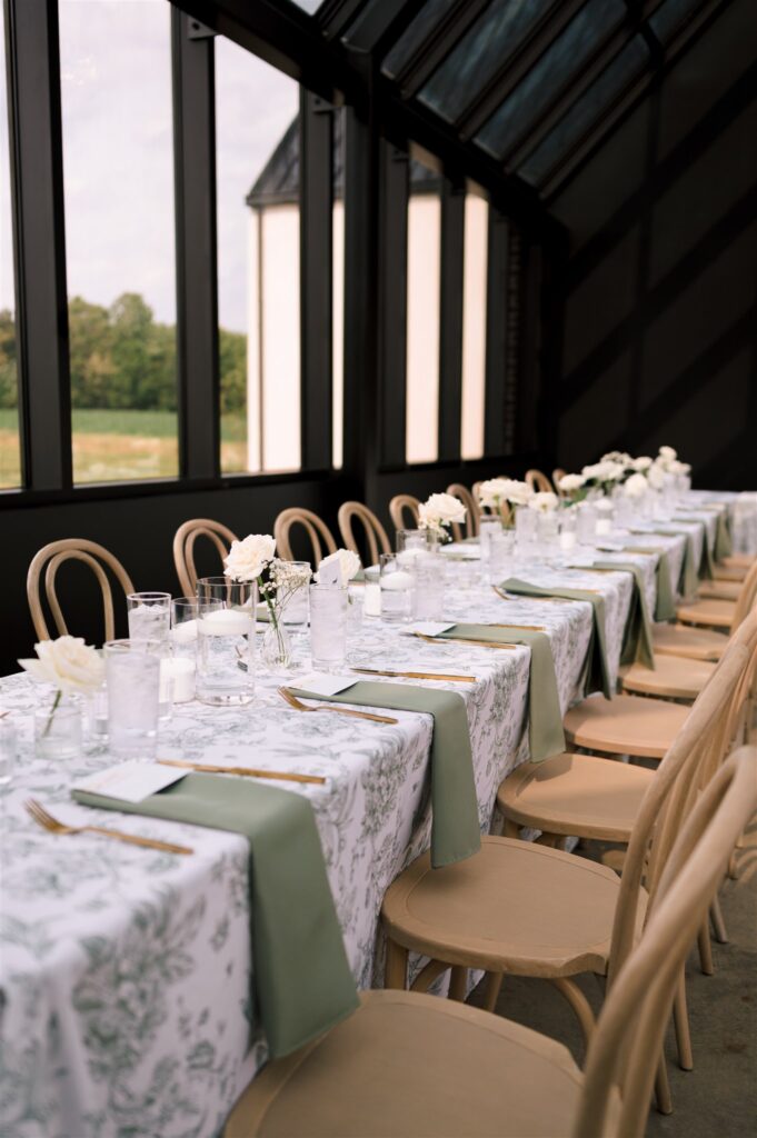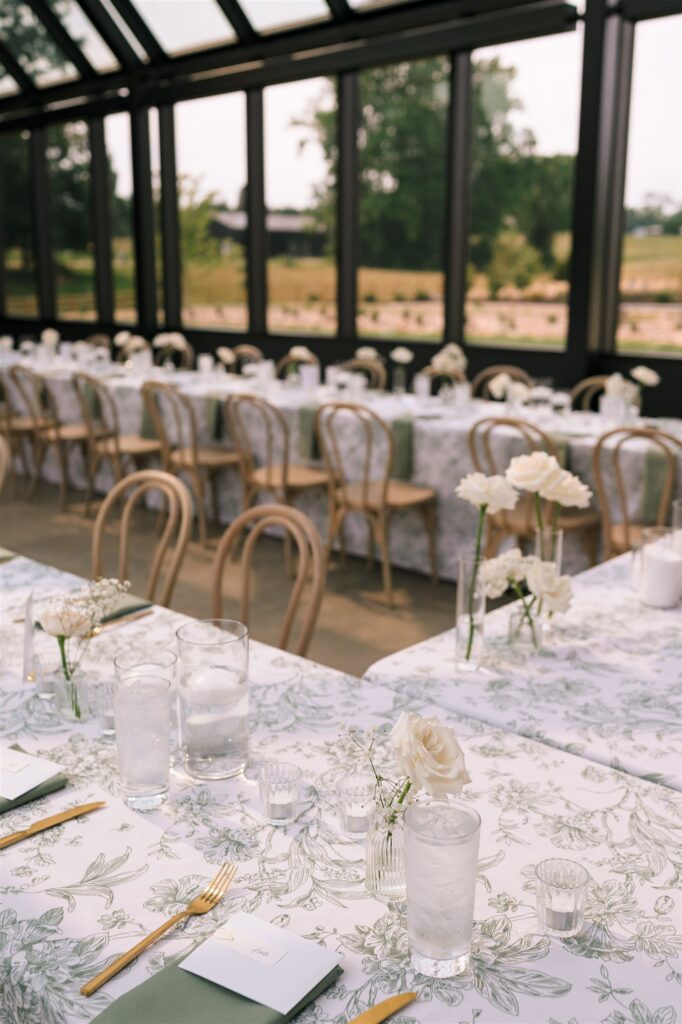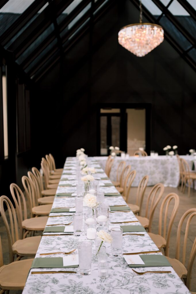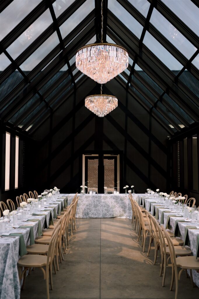 From there guests moved inside the glass house for an elegant reception celebration. The tables were topped with green printed linens and napkins, white floral bud vases, romantic candles, and gold cutlery. Rental pieces from Party Reflections helped solidify their chic green and white theme. The chandeliers twinkled overhead as the golden hour light poured in through the glass ceiling. Guests enjoyed a plated meal from Roots Catering as they mingled and enjoyed each other’s company. This May wedding in North Carolina was the perfect celebration of Shania & Armani’s marriage at The Lumen House!