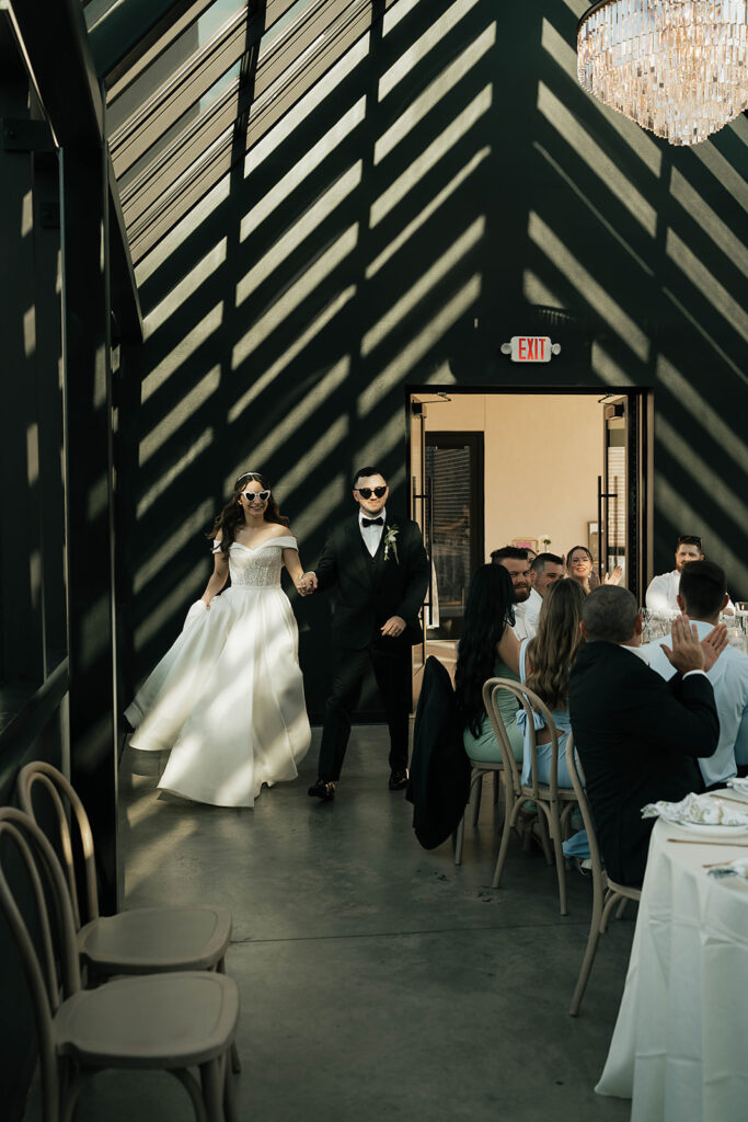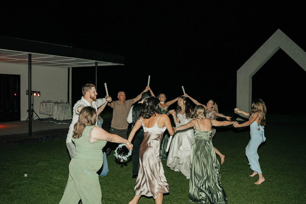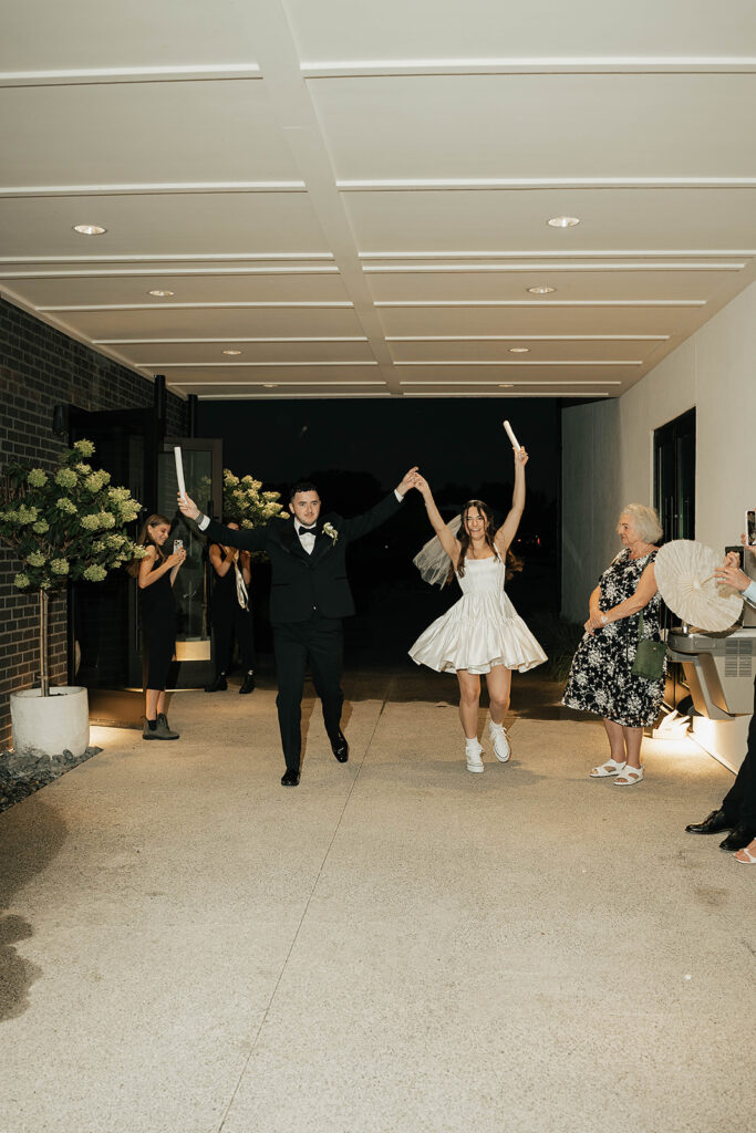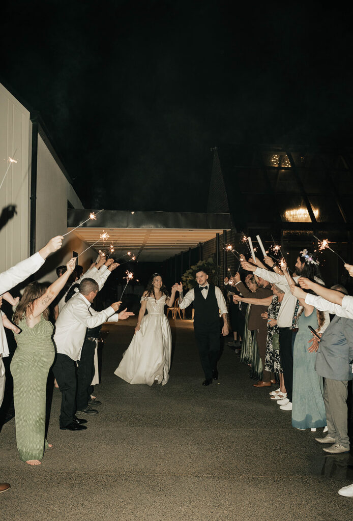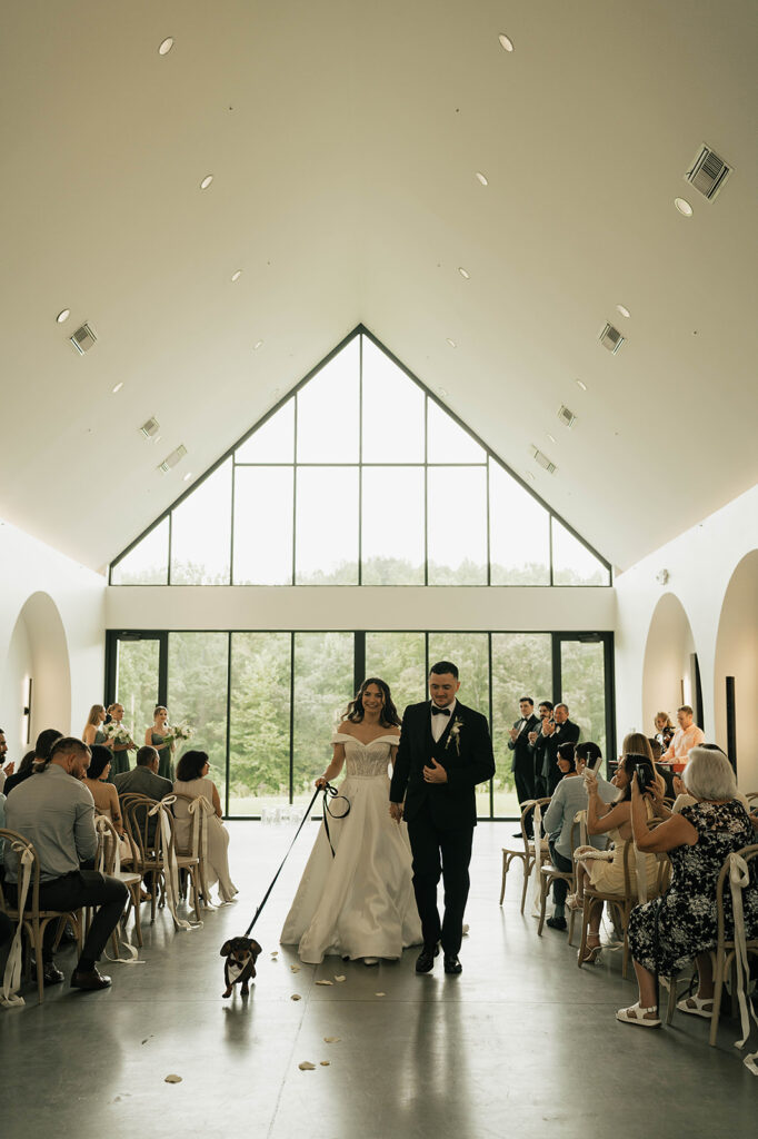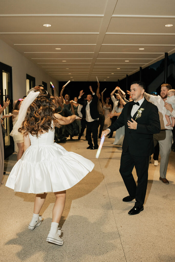 From a fun entrance with the bride and groom in sunglasses to a champagne tower toast, cake cutting, and nonstop dancing powered by Dow Oak Events, the celebration never slowed down. Guests enjoyed food and drinks by Field Pea Catering, a sweet pup walking down the aisle, and a glowing sparkler exit that wrapped up a wedding that was playful, joyful, and unforgettable.