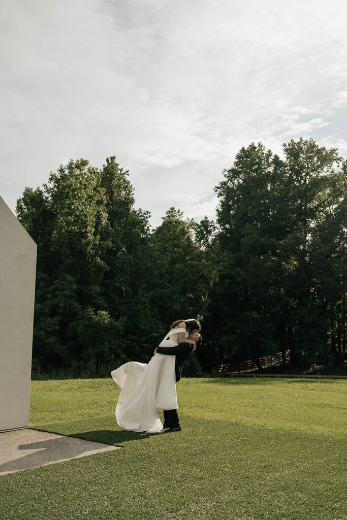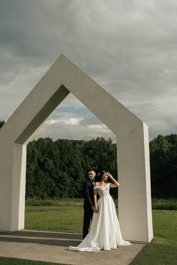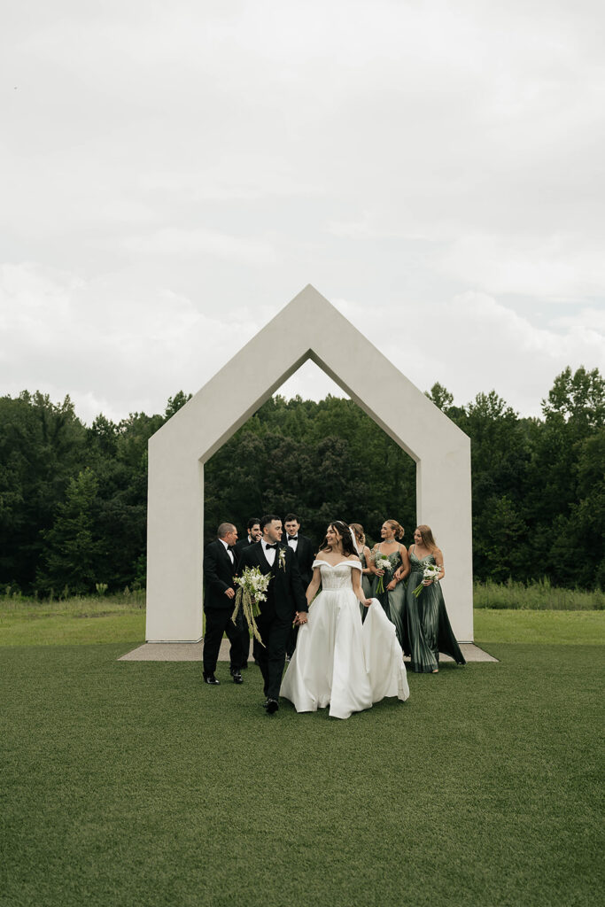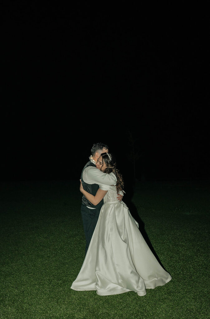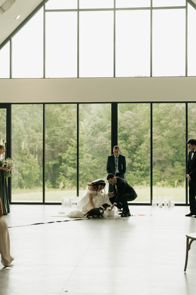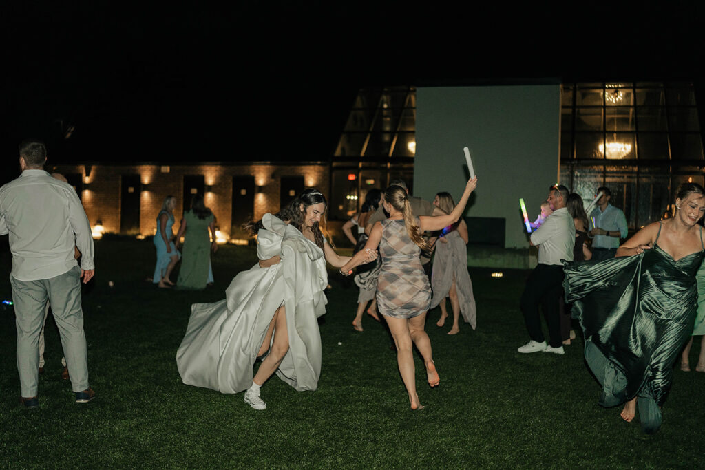 From a fun entrance with the bride and groom in sunglasses to a champagne tower toast, cake cutting, and nonstop dancing powered by Dow Oak Events, the celebration never slowed down. Guests enjoyed food and drinks by Field Pea Catering, a sweet pup walking down the aisle, and a glowing sparkler exit that wrapped up a wedding that was playful, joyful, and unforgettable.