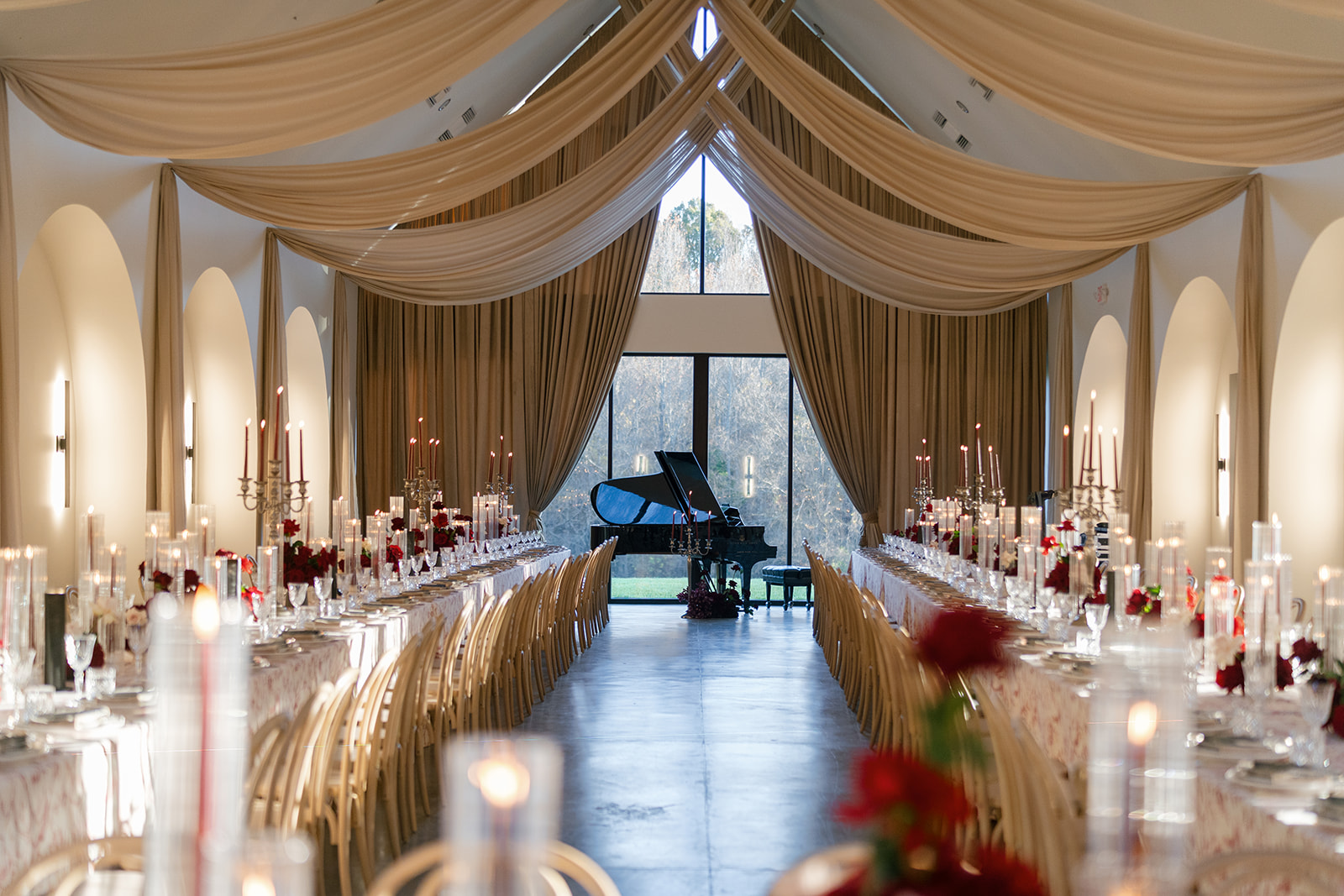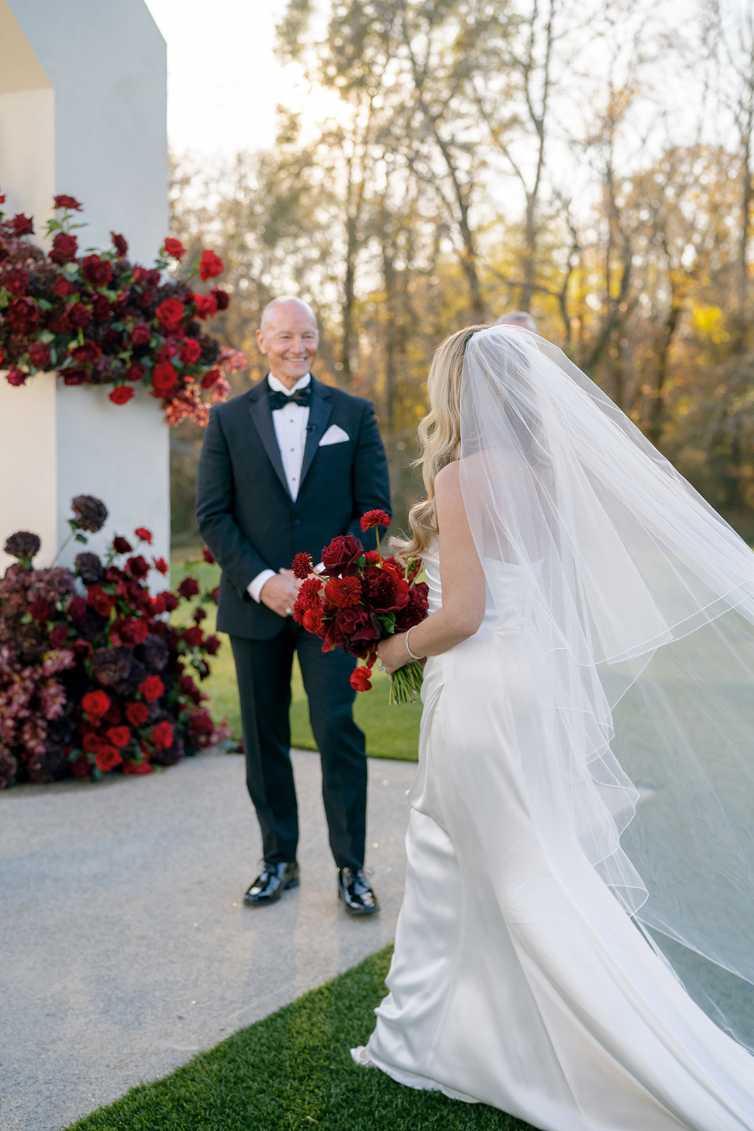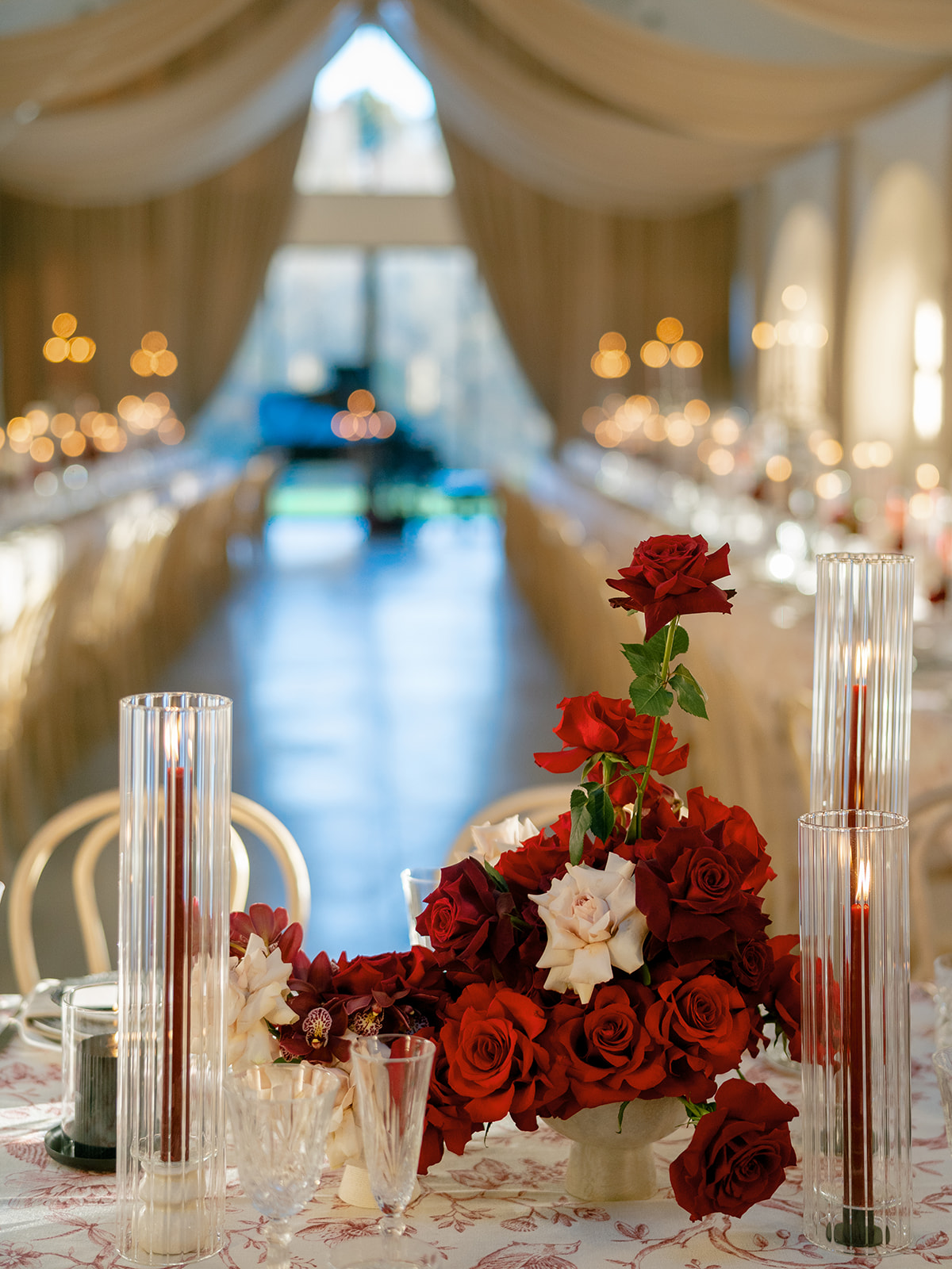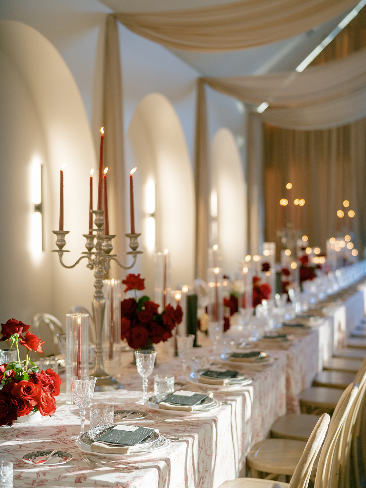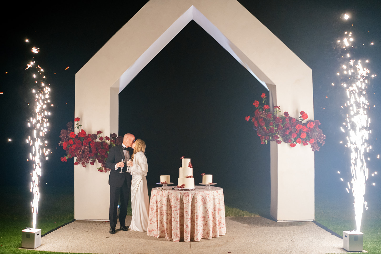 Following the ceremony guests headed to an indoor reception. Ivory fabric was draped from the ceiling that matched the ivory cushioned chairs. White and red pattern tablecloths covered tables were lined with red rose centerpieces in grey vases created by Seeded Events and Design. Tall, red taper candles in clear glass hurricane vases and silver candlelabras illuminated the space. White and black patterned dinnerware with black menus served as place settings. Guests enjoyed a meal featuring their choice of chicken, crab cakes, or filet. Signature cocktails from Family Catering Service included Toasted Pecan Old Fashioned, Star Gazer Spritz, or Blood Orange Mule. The dessert table held various choices including a three-tier white buttercream wedding cake with red floral accents. The bride changed into a long sleeve short lace dress and fur wrap for dancing to music from DJ Barkz Beats. The newlyweds got a sparkler send off from DJ Jay Rogers and all in attendance.
