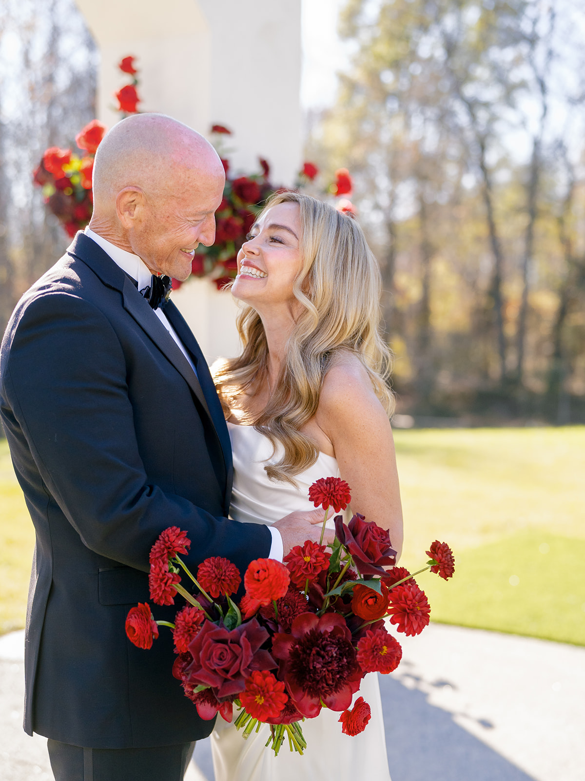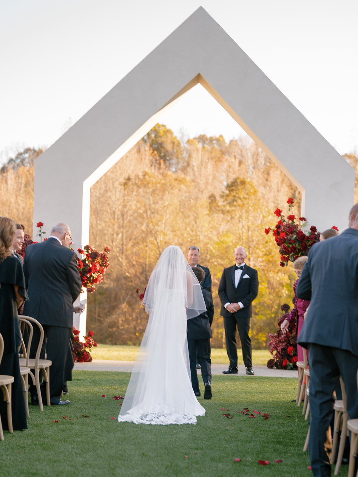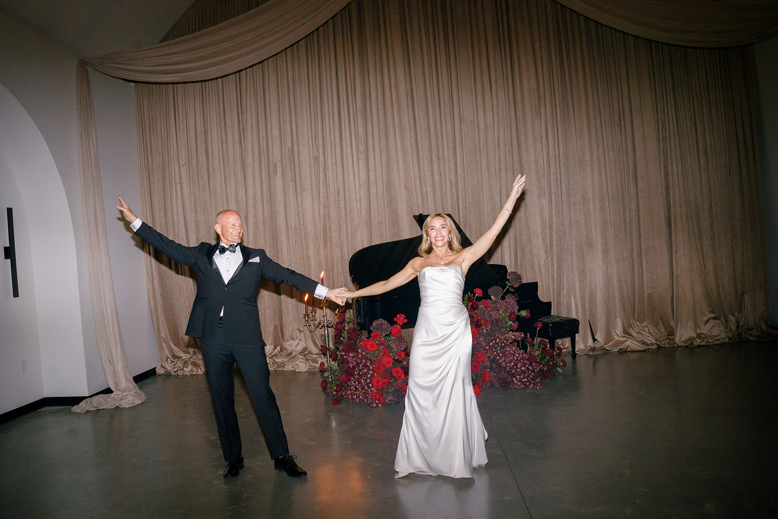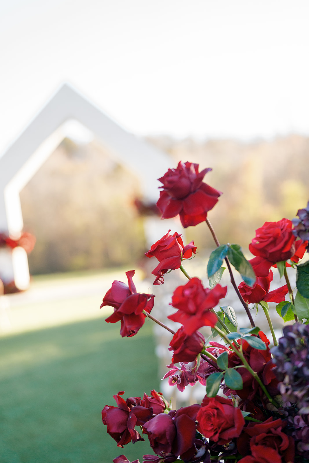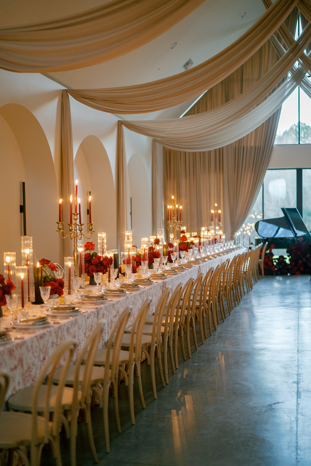 Following the ceremony guests headed to an indoor reception. Ivory fabric was draped from the ceiling that matched the ivory cushioned chairs. White and red pattern tablecloths covered tables were lined with red rose centerpieces in grey vases created by Seeded Events and Design. Tall, red taper candles in clear glass hurricane vases and silver candlelabras illuminated the space. White and black patterned dinnerware with black menus served as place settings. Guests enjoyed a meal featuring their choice of chicken, crab cakes, or filet. Signature cocktails from Family Catering Service included Toasted Pecan Old Fashioned, Star Gazer Spritz, or Blood Orange Mule. The dessert table held various choices including a three-tier white buttercream wedding cake with red floral accents. The bride changed into a long sleeve short lace dress and fur wrap for dancing to music from DJ Barkz Beats. The newlyweds got a sparkler send off from DJ Jay Rogers and all in attendance.