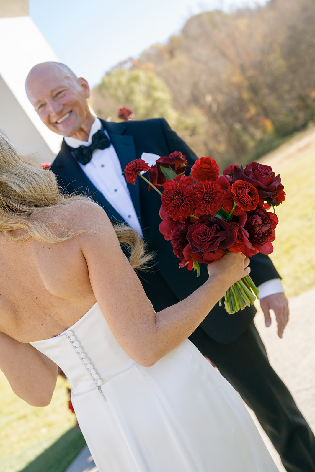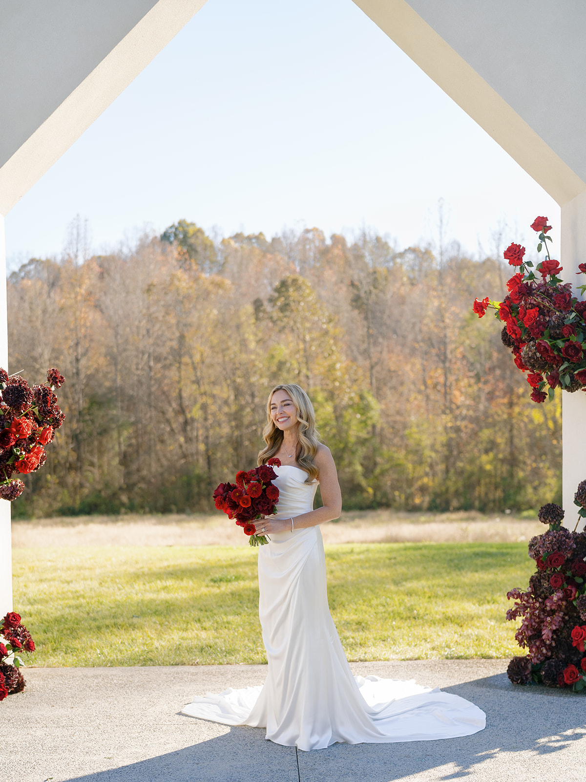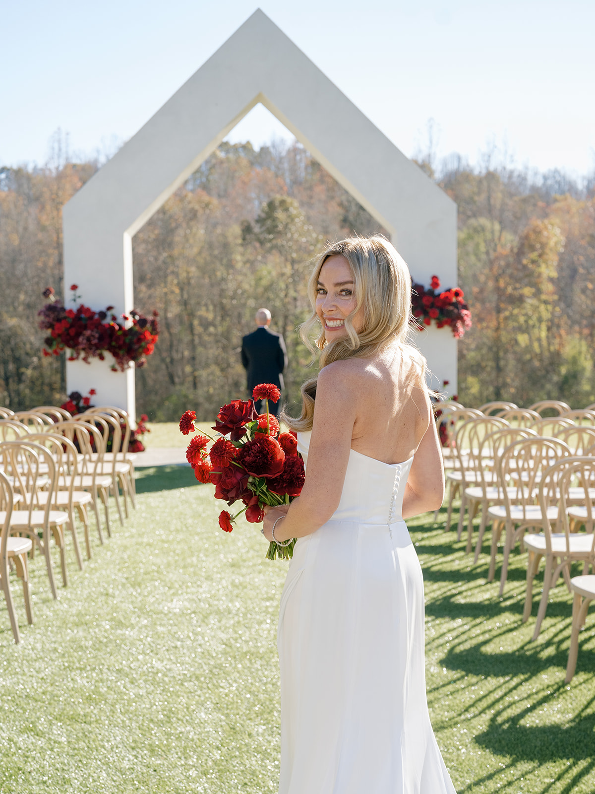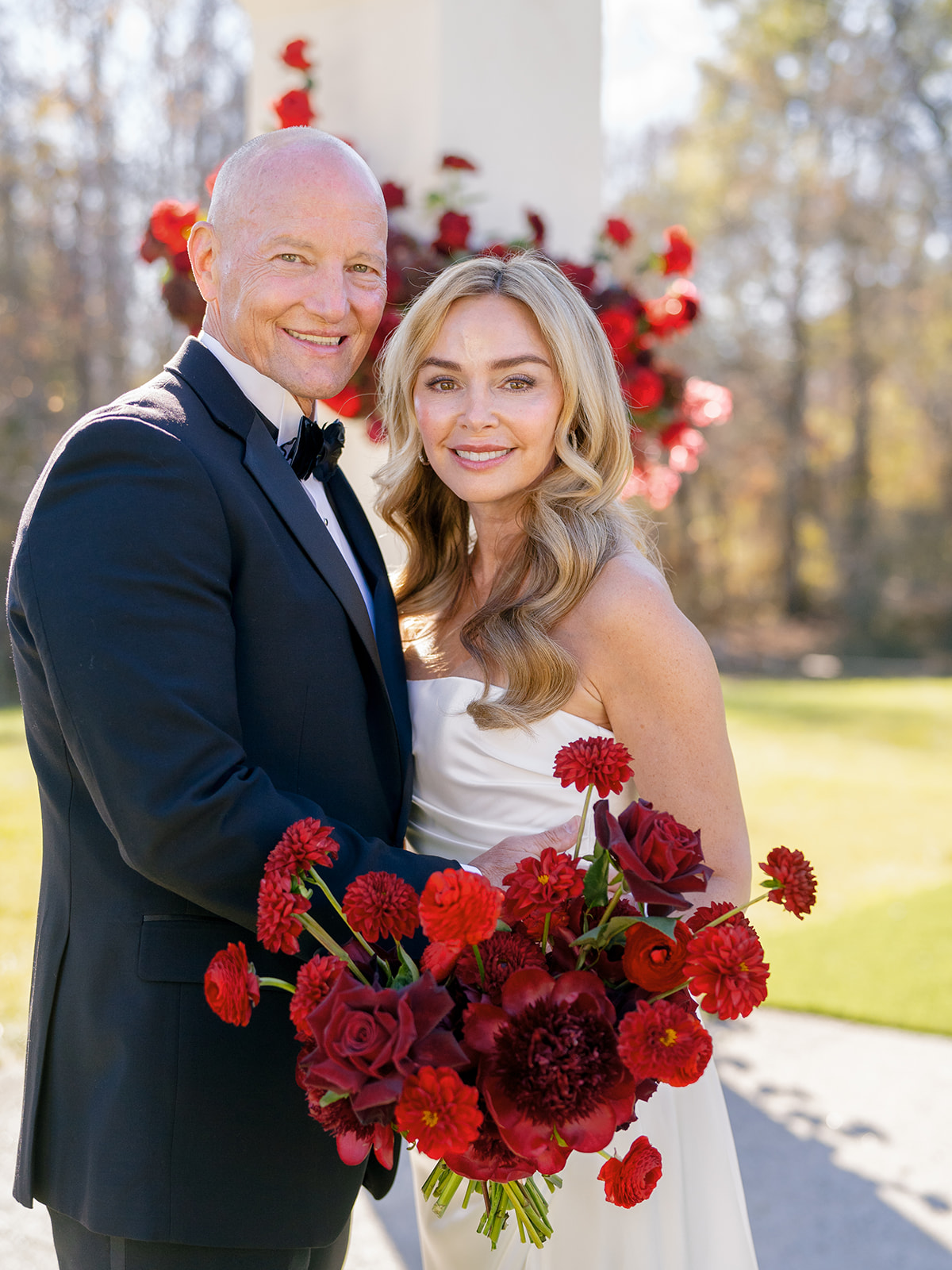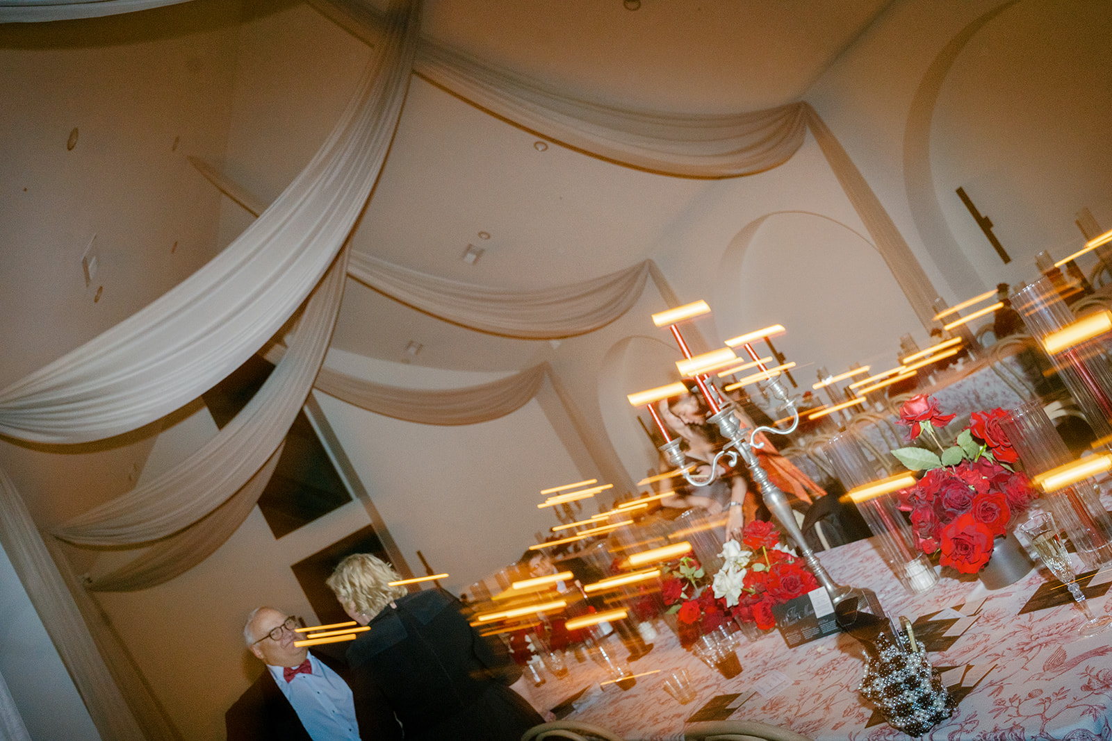 Following the ceremony guests headed to an indoor reception. Ivory fabric was draped from the ceiling that matched the ivory cushioned chairs. White and red pattern tablecloths covered tables were lined with red rose centerpieces in grey vases created by Seeded Events and Design. Tall, red taper candles in clear glass hurricane vases and silver candlelabras illuminated the space. White and black patterned dinnerware with black menus served as place settings. Guests enjoyed a meal featuring their choice of chicken, crab cakes, or filet. Signature cocktails from Family Catering Service included Toasted Pecan Old Fashioned, Star Gazer Spritz, or Blood Orange Mule. The dessert table held various choices including a three-tier white buttercream wedding cake with red floral accents. The bride changed into a long sleeve short lace dress and fur wrap for dancing to music from DJ Barkz Beats. The newlyweds got a sparkler send off from DJ Jay Rogers and all in attendance.