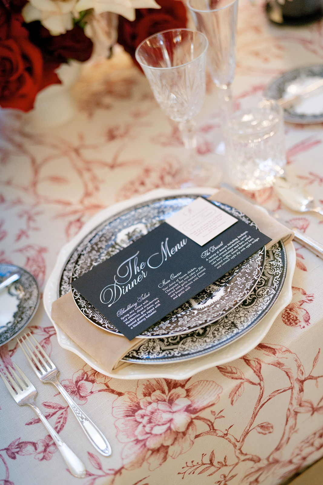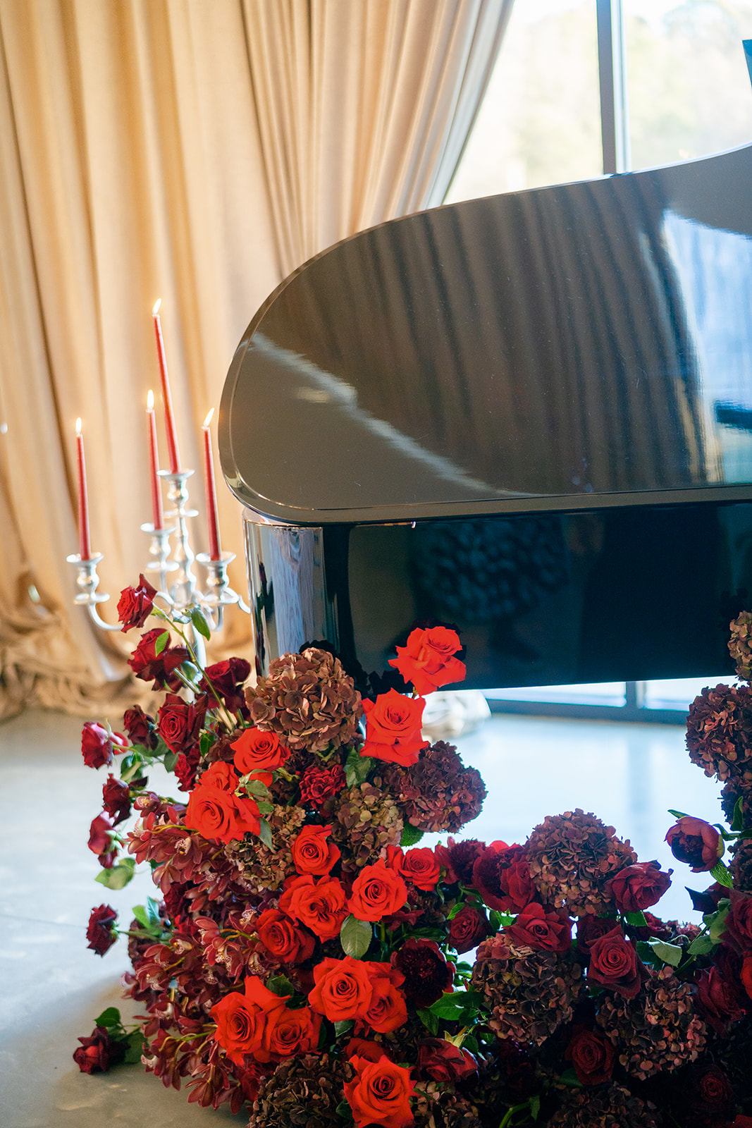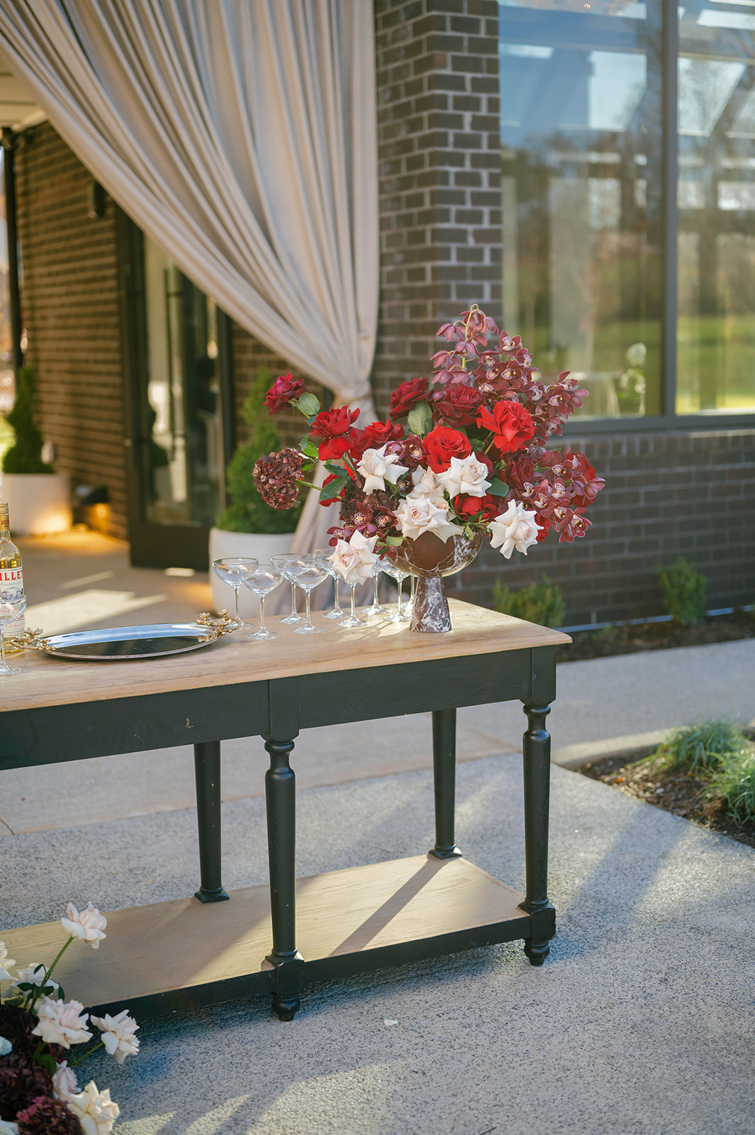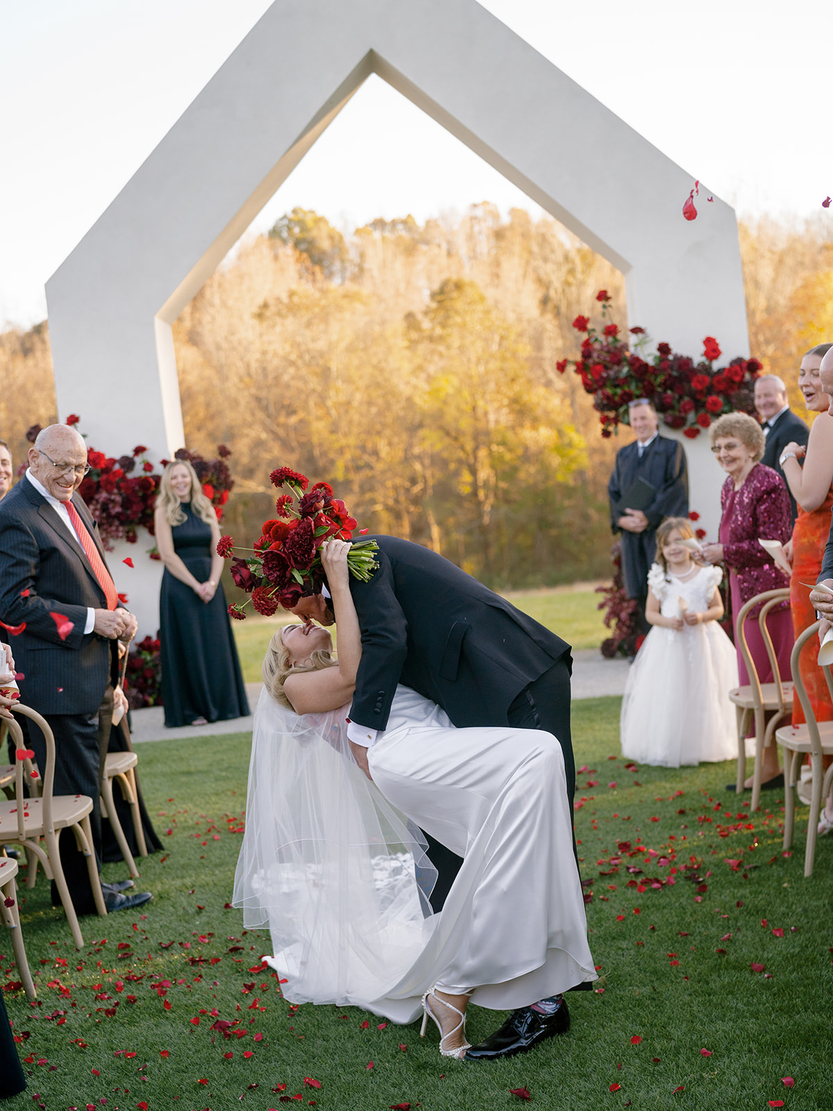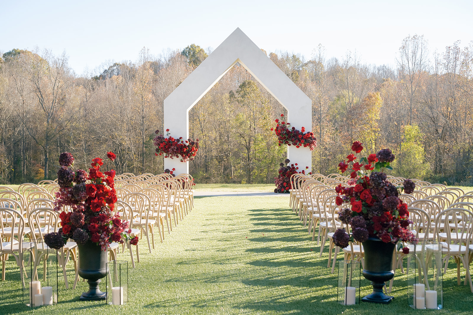 Following the ceremony guests headed to an indoor reception. Ivory fabric was draped from the ceiling that matched the ivory cushioned chairs. White and red pattern tablecloths covered tables were lined with red rose centerpieces in grey vases created by Seeded Events and Design. Tall, red taper candles in clear glass hurricane vases and silver candlelabras illuminated the space. White and black patterned dinnerware with black menus served as place settings. Guests enjoyed a meal featuring their choice of chicken, crab cakes, or filet. Signature cocktails from Family Catering Service included Toasted Pecan Old Fashioned, Star Gazer Spritz, or Blood Orange Mule. The dessert table held various choices including a three-tier white buttercream wedding cake with red floral accents. The bride changed into a long sleeve short lace dress and fur wrap for dancing to music from DJ Barkz Beats. The newlyweds got a sparkler send off from DJ Jay Rogers and all in attendance.