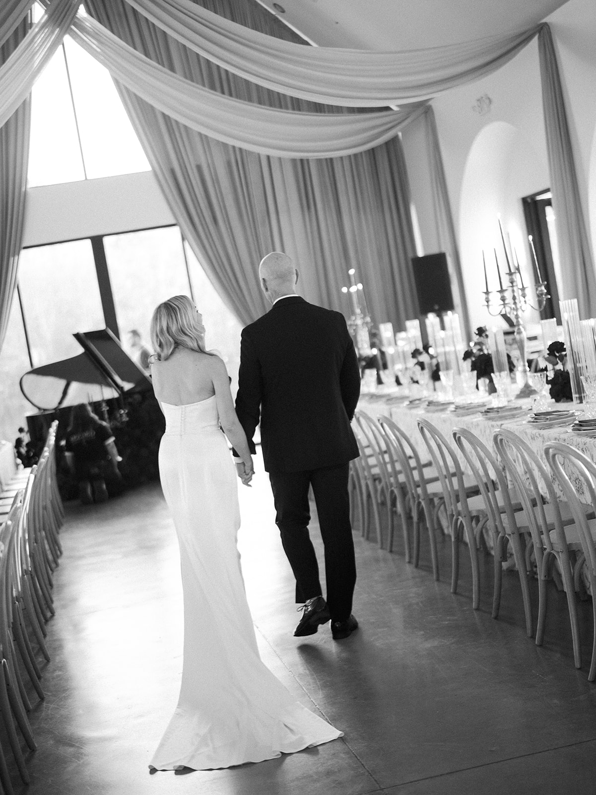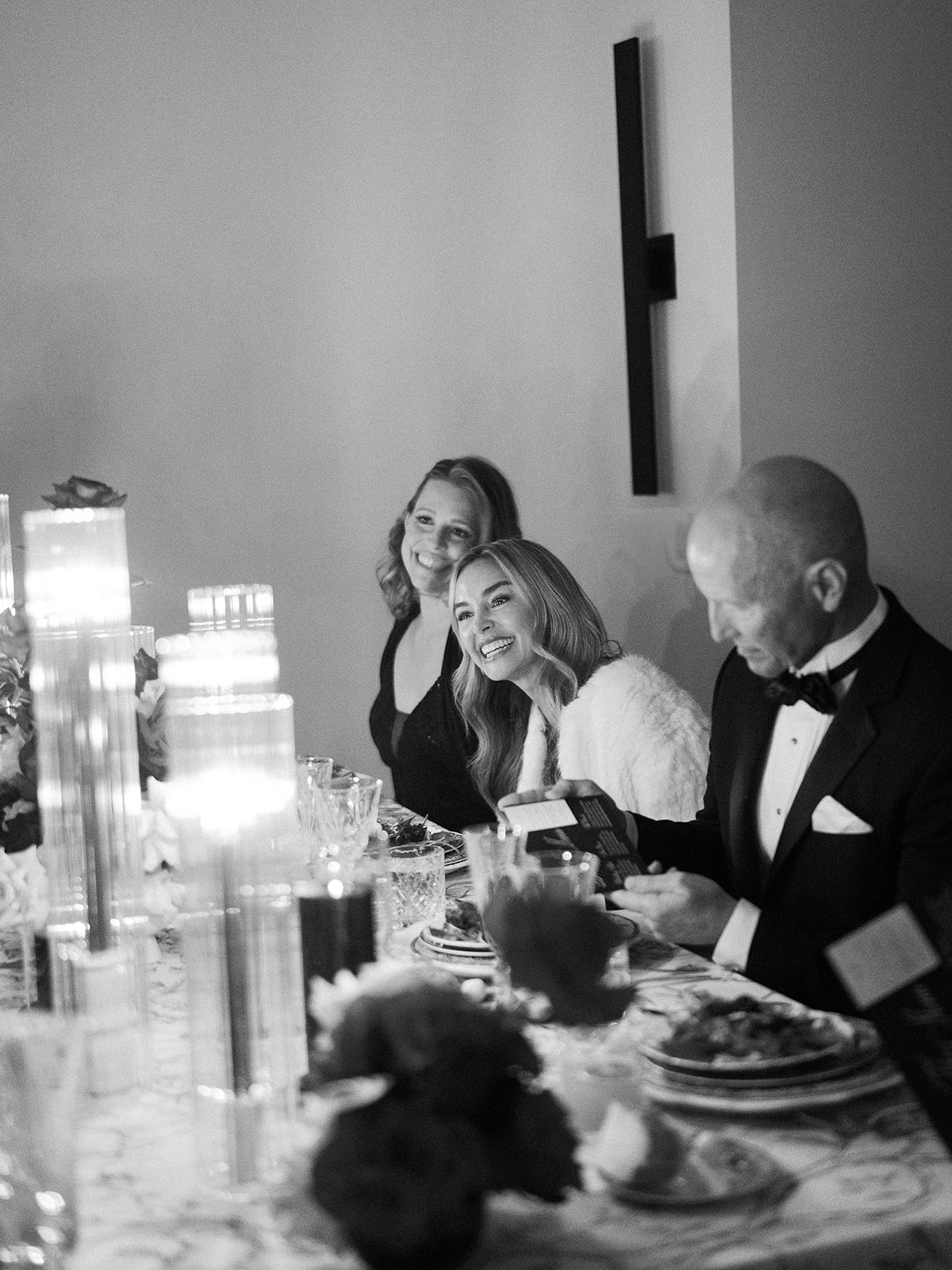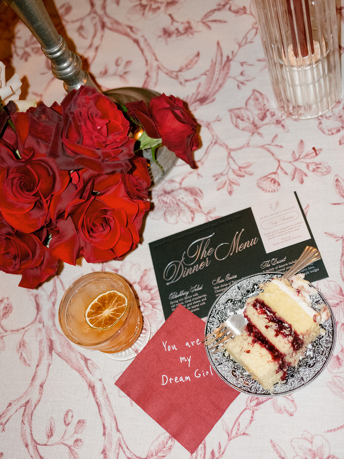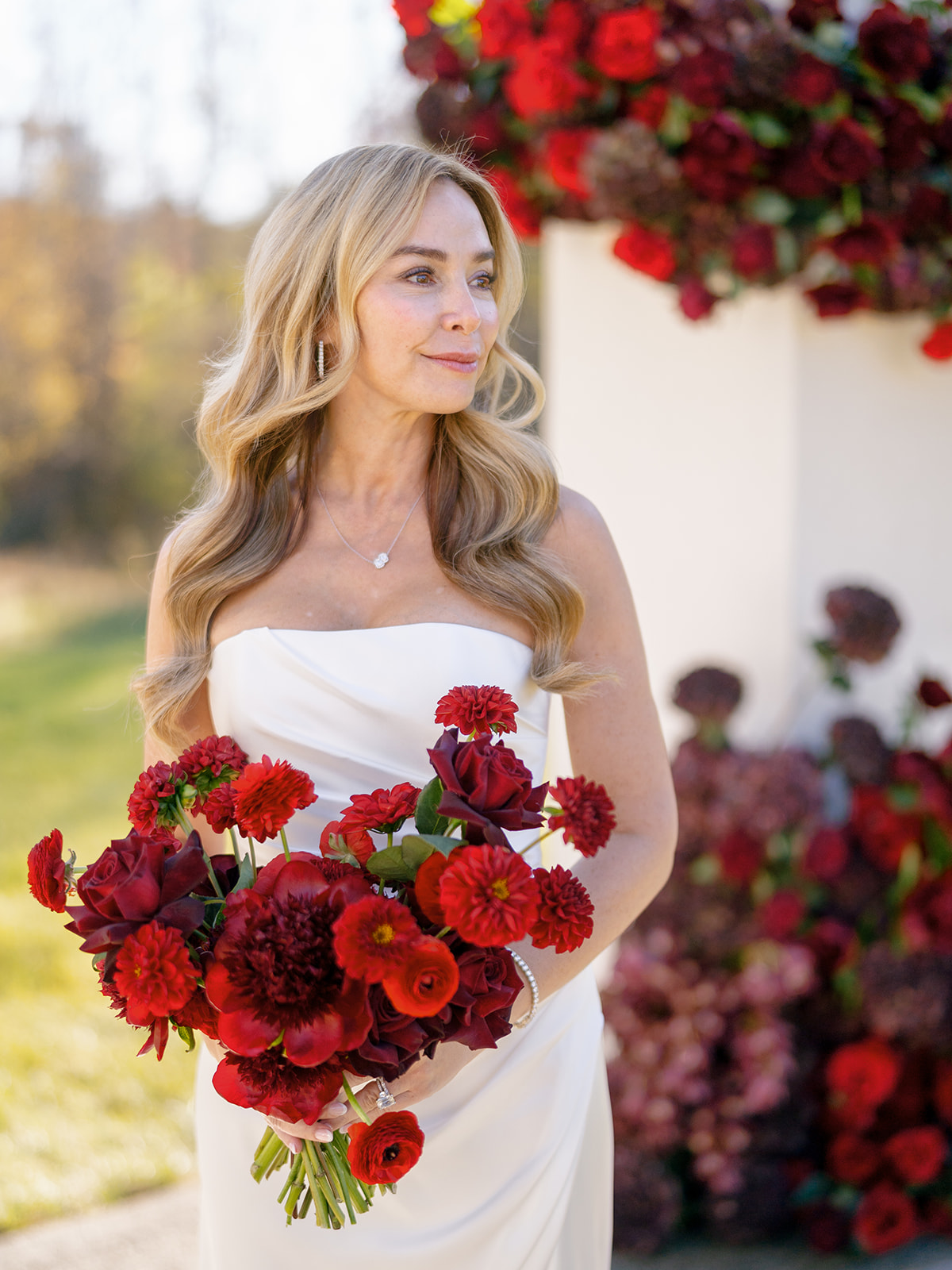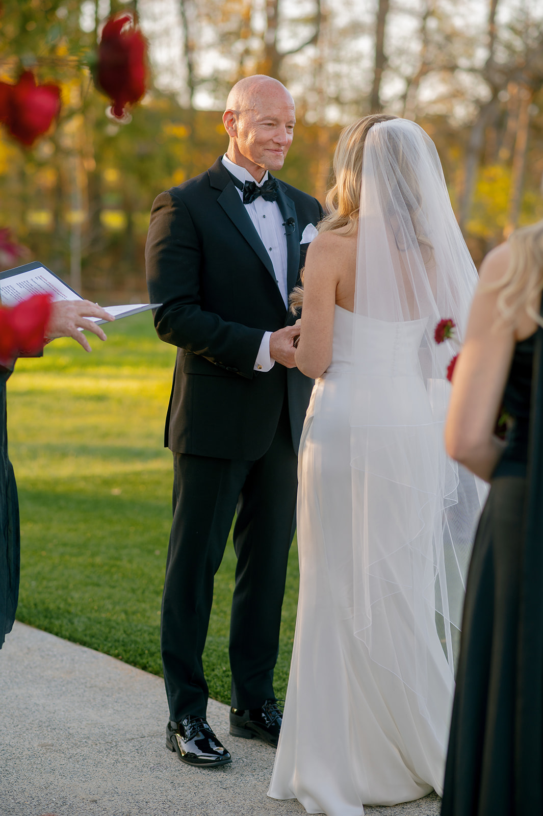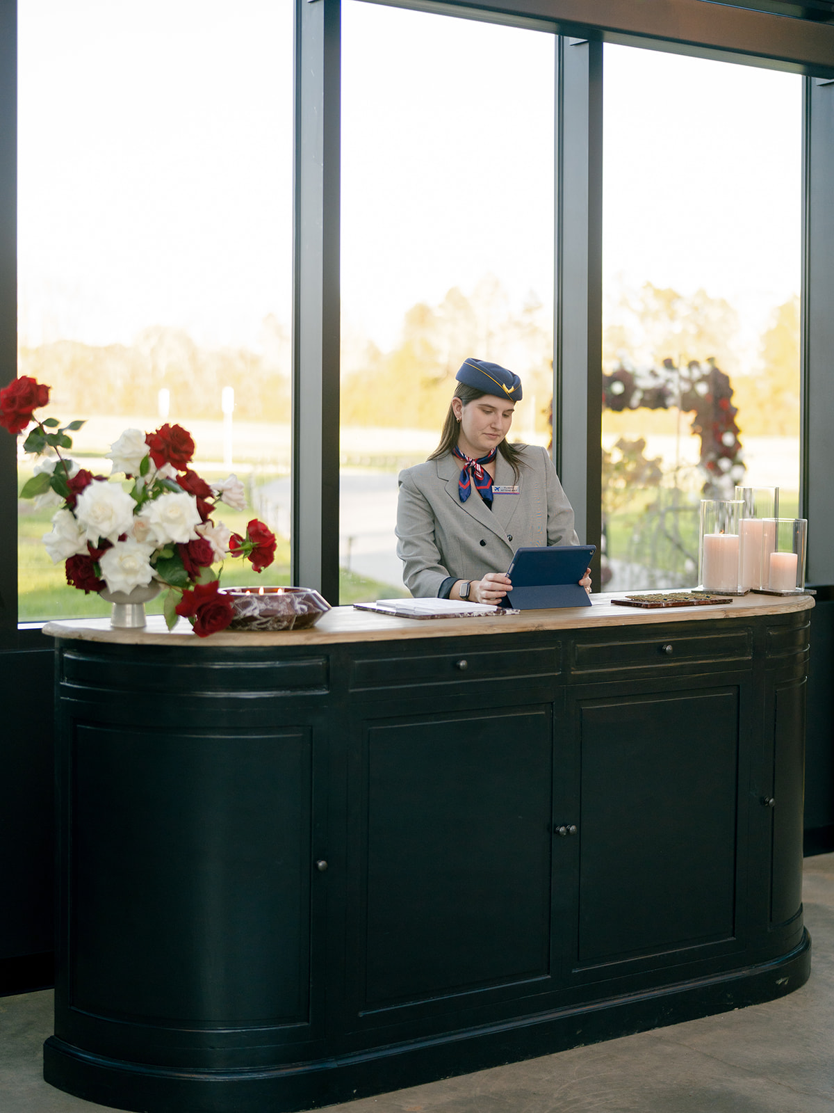 Following the ceremony guests headed to an indoor reception. Ivory fabric was draped from the ceiling that matched the ivory cushioned chairs. White and red pattern tablecloths covered tables were lined with red rose centerpieces in grey vases created by Seeded Events and Design. Tall, red taper candles in clear glass hurricane vases and silver candlelabras illuminated the space. White and black patterned dinnerware with black menus served as place settings. Guests enjoyed a meal featuring their choice of chicken, crab cakes, or filet. Signature cocktails from Family Catering Service included Toasted Pecan Old Fashioned, Star Gazer Spritz, or Blood Orange Mule. The dessert table held various choices including a three-tier white buttercream wedding cake with red floral accents. The bride changed into a long sleeve short lace dress and fur wrap for dancing to music from DJ Barkz Beats. The newlyweds got a sparkler send off from DJ Jay Rogers and all in attendance.