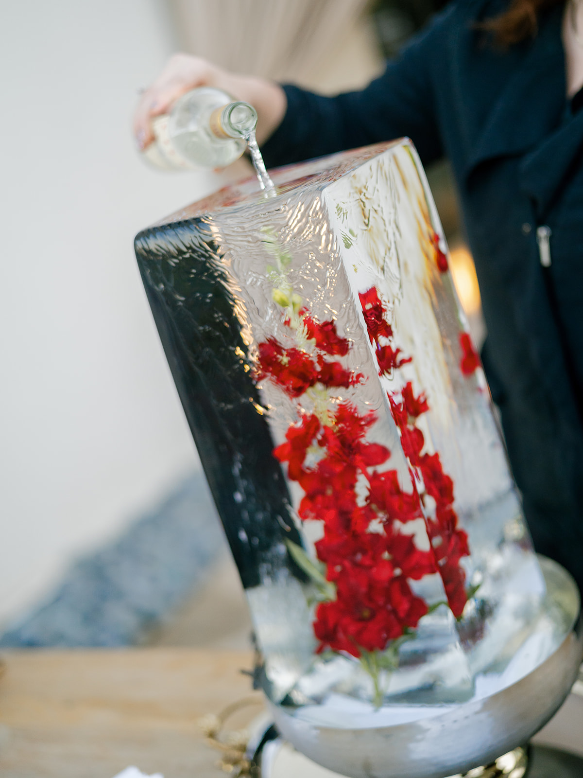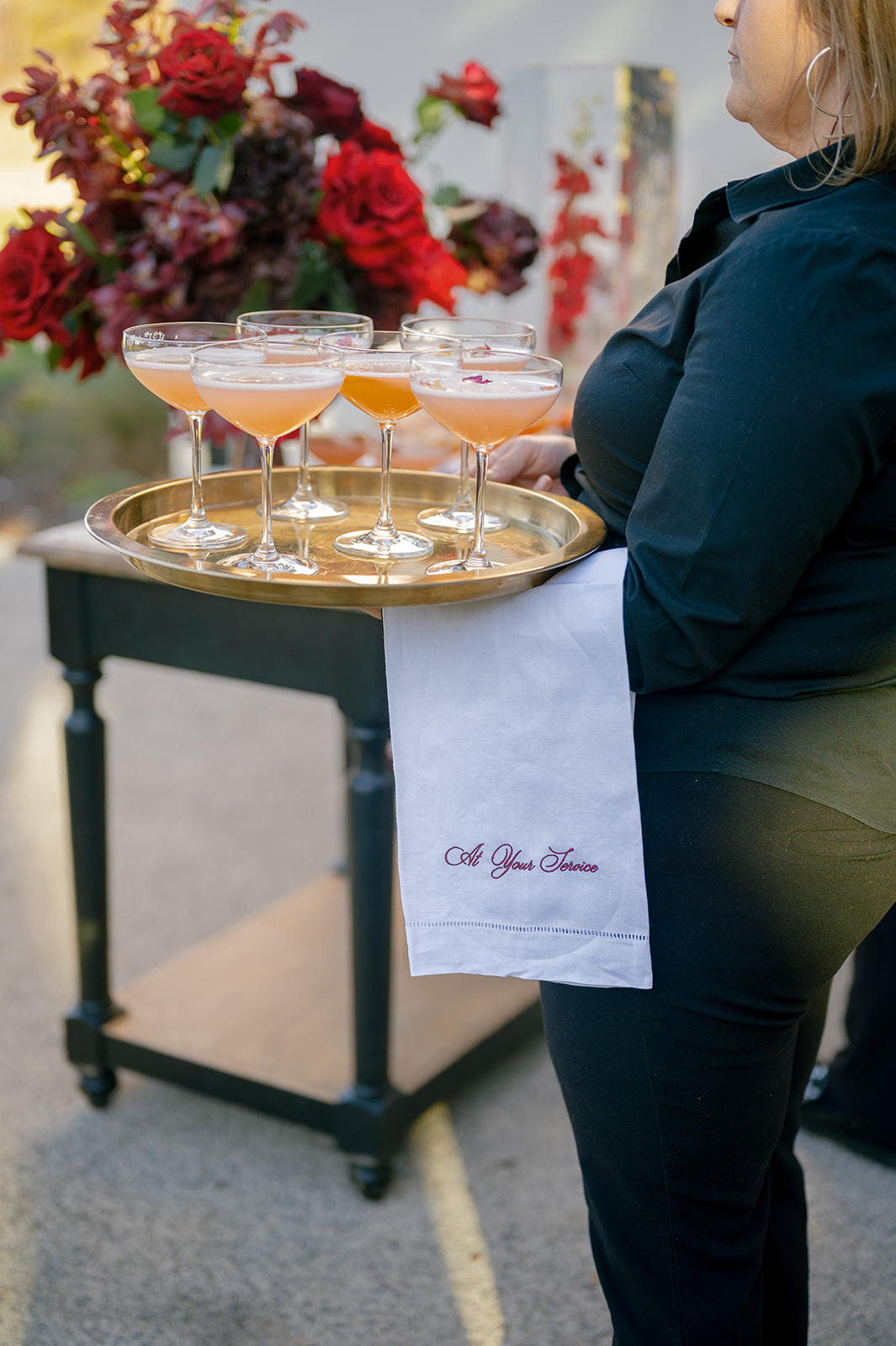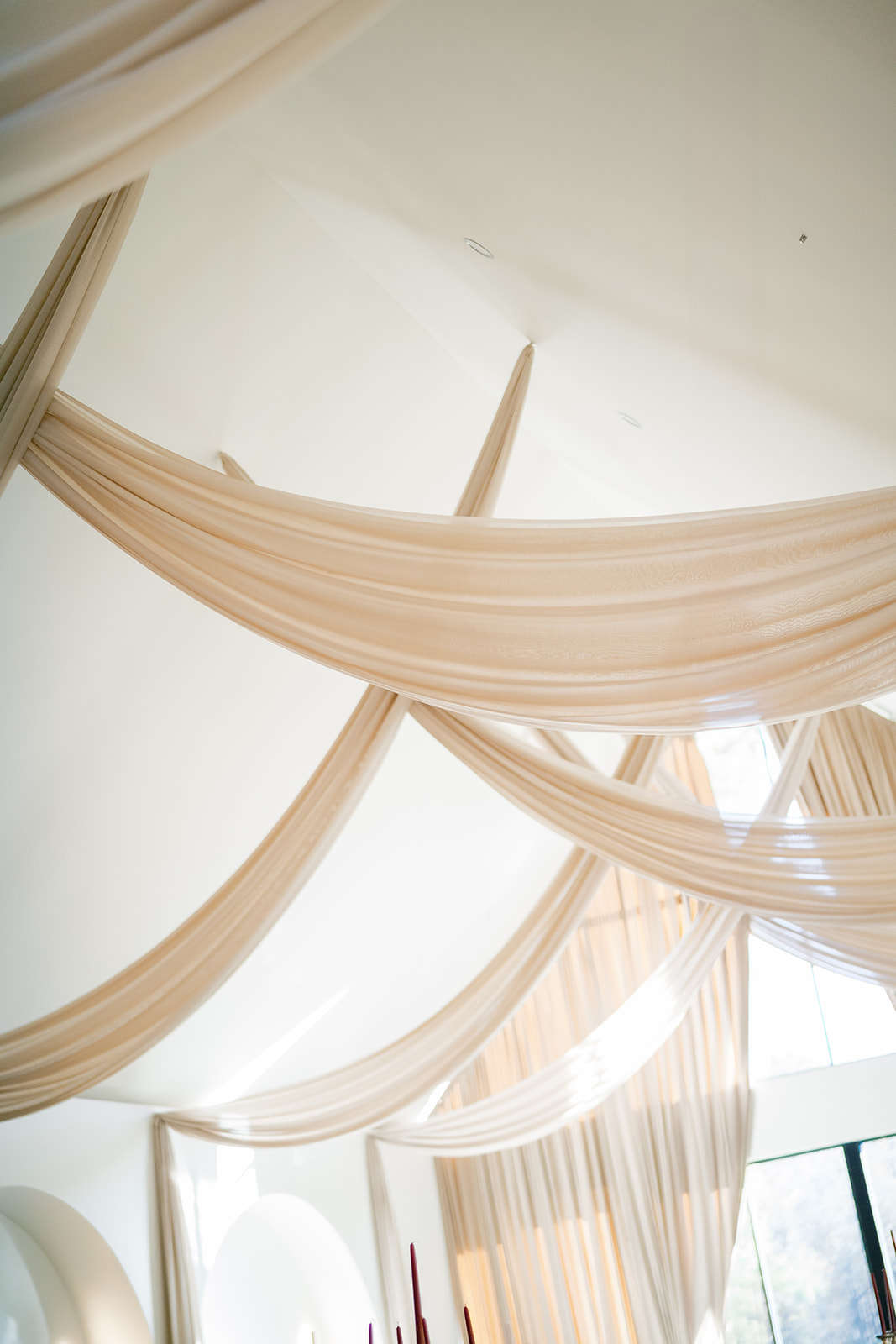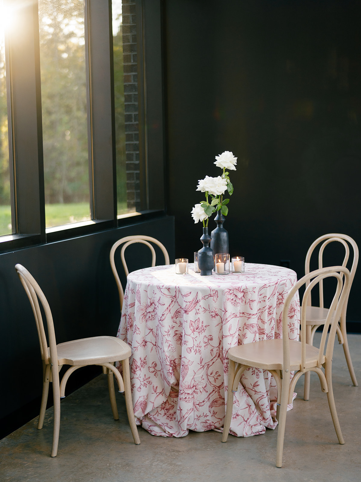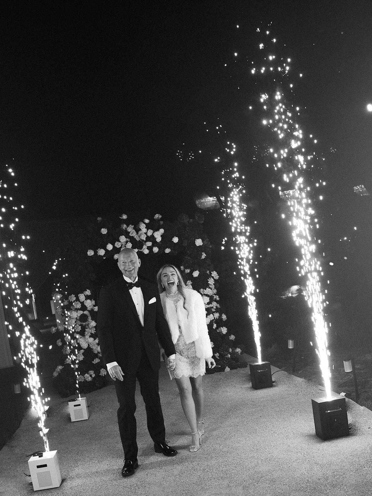Following the ceremony guests headed to an indoor reception. Ivory fabric was draped from the ceiling that matched the ivory cushioned chairs. White and red pattern tablecloths covered tables were lined with red rose centerpieces in grey vases created by Seeded Events and Design. Tall, red taper candles in clear glass hurricane vases and silver candlelabras illuminated the space. White and black patterned dinnerware with black menus served as place settings. Guests enjoyed a meal featuring their choice of chicken, crab cakes, or filet. Signature cocktails from Family Catering Service included Toasted Pecan Old Fashioned, Star Gazer Spritz, or Blood Orange Mule. The dessert table held various choices including a three-tier white buttercream wedding cake with red floral accents. The bride changed into a long sleeve short lace dress and fur wrap for dancing to music from DJ Barkz Beats. The newlyweds got a sparkler send off from DJ Jay Rogers and all in attendance.
