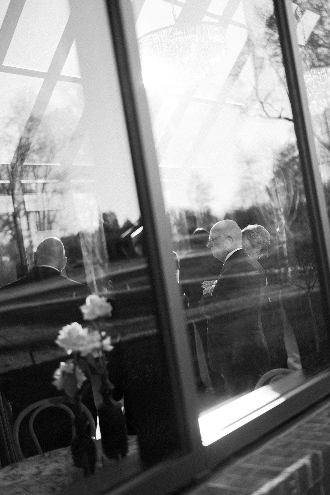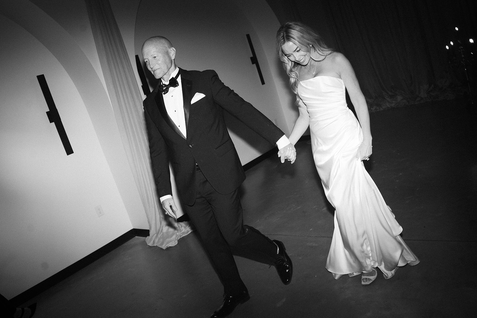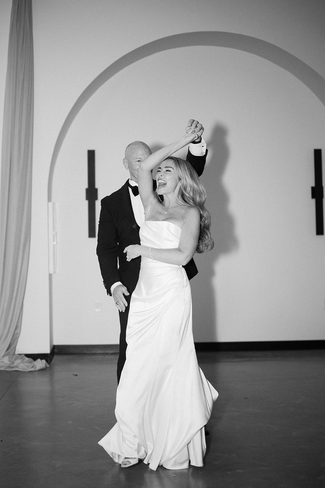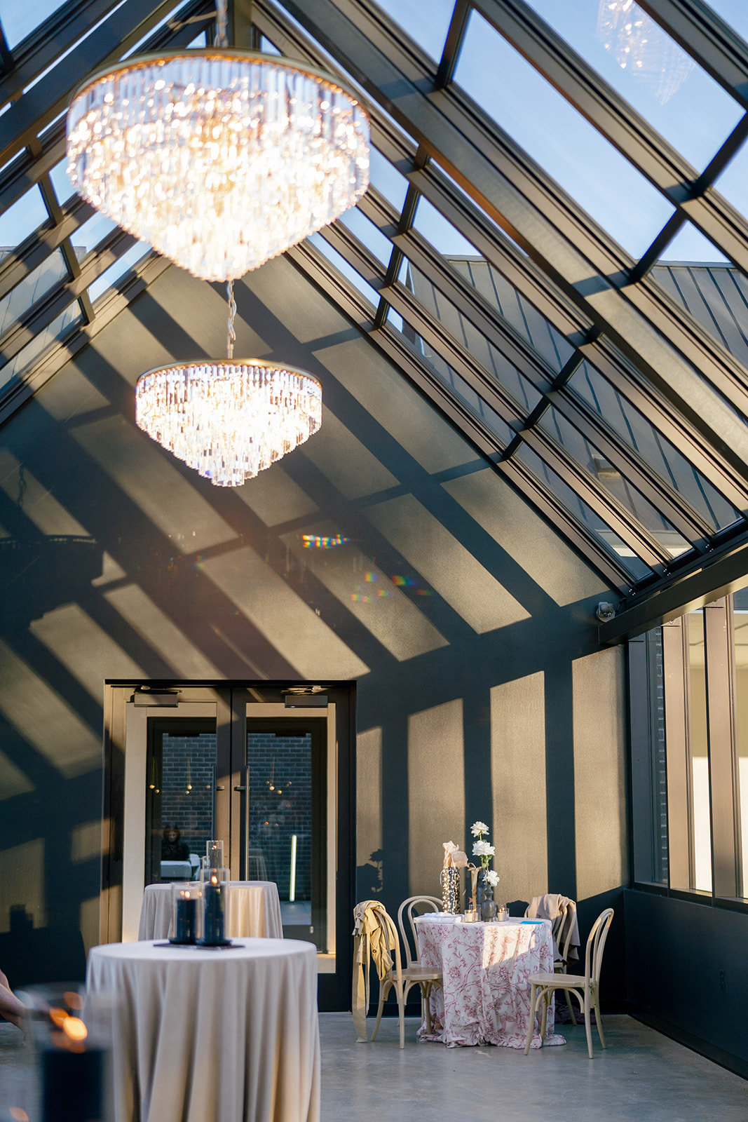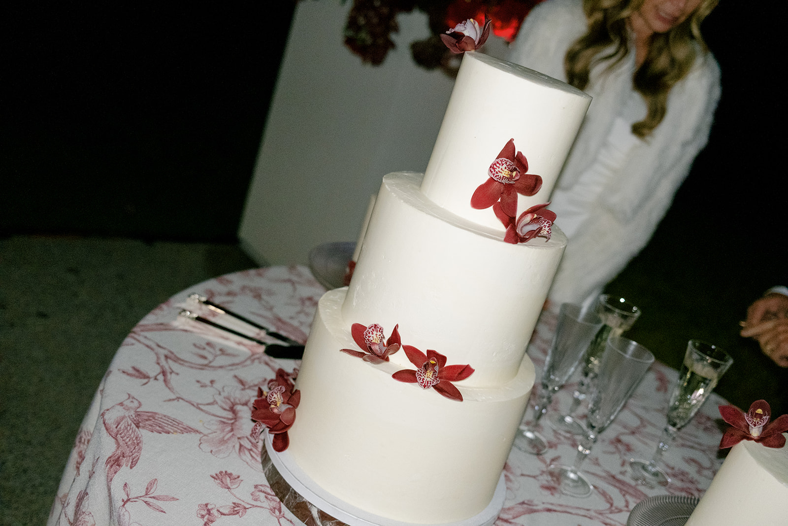 Following the ceremony guests headed to an indoor reception. Ivory fabric was draped from the ceiling that matched the ivory cushioned chairs. White and red pattern tablecloths covered tables were lined with red rose centerpieces in grey vases created by Seeded Events and Design. Tall, red taper candles in clear glass hurricane vases and silver candlelabras illuminated the space. White and black patterned dinnerware with black menus served as place settings. Guests enjoyed a meal featuring their choice of chicken, crab cakes, or filet. Signature cocktails from Family Catering Service included Toasted Pecan Old Fashioned, Star Gazer Spritz, or Blood Orange Mule. The dessert table held various choices including a three-tier white buttercream wedding cake with red floral accents. The bride changed into a long sleeve short lace dress and fur wrap for dancing to music from DJ Barkz Beats. The newlyweds got a sparkler send off from DJ Jay Rogers and all in attendance.