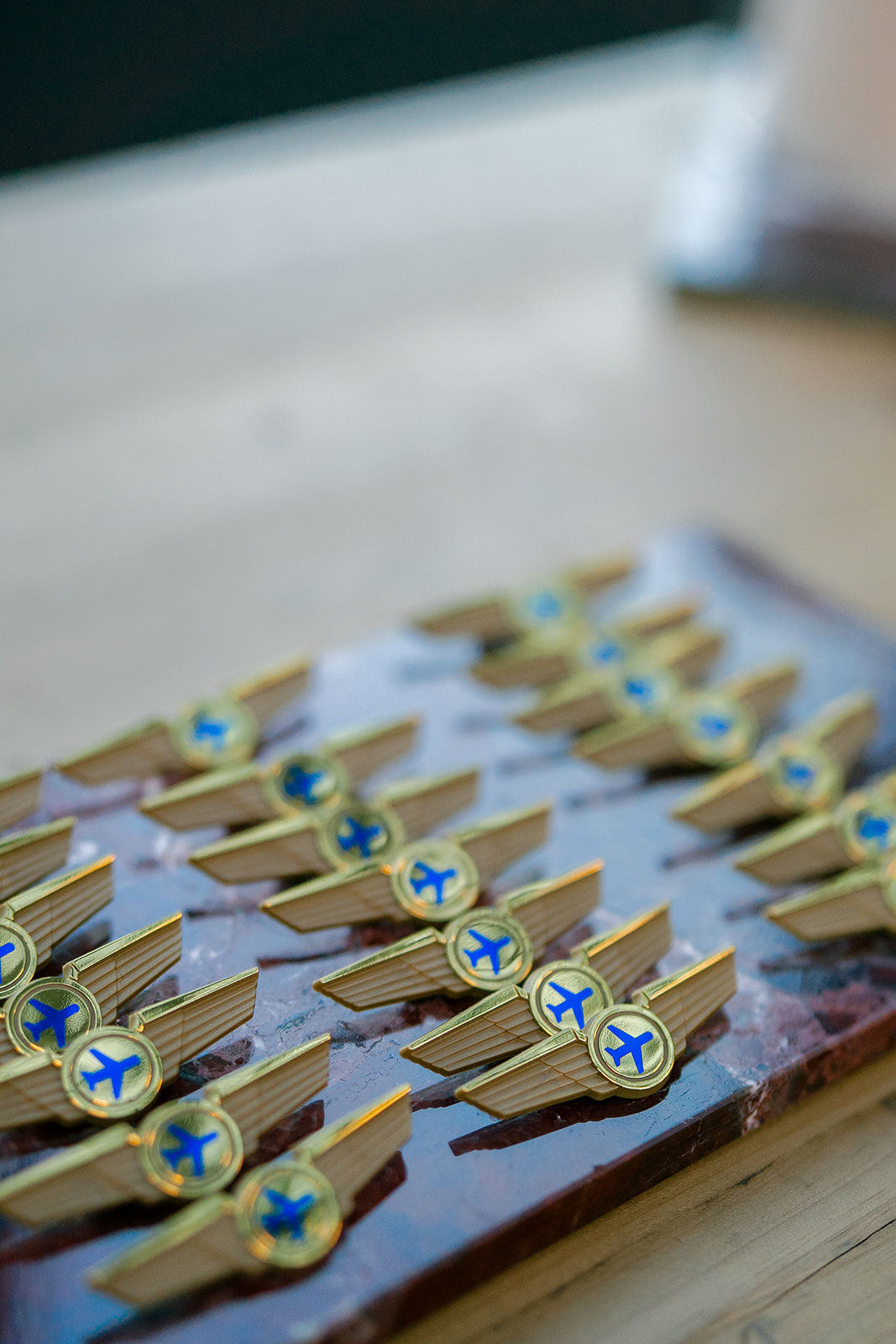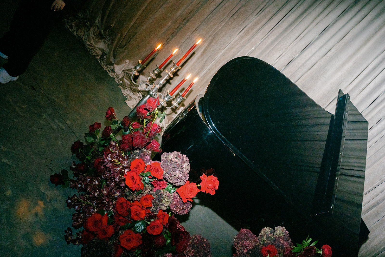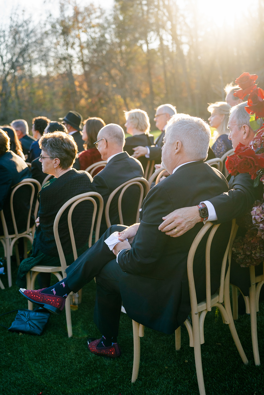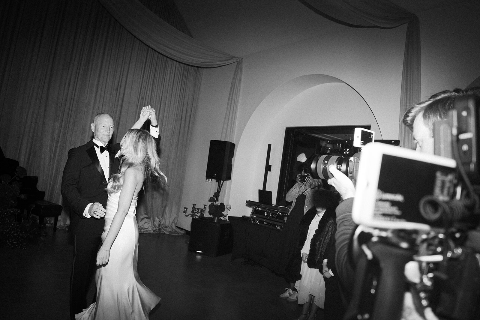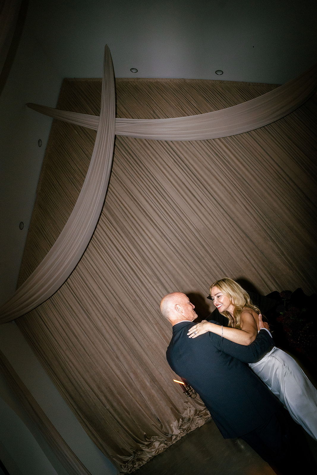 Following the ceremony guests headed to an indoor reception. Ivory fabric was draped from the ceiling that matched the ivory cushioned chairs. White and red pattern tablecloths covered tables were lined with red rose centerpieces in grey vases created by Seeded Events and Design. Tall, red taper candles in clear glass hurricane vases and silver candlelabras illuminated the space. White and black patterned dinnerware with black menus served as place settings. Guests enjoyed a meal featuring their choice of chicken, crab cakes, or filet. Signature cocktails from Family Catering Service included Toasted Pecan Old Fashioned, Star Gazer Spritz, or Blood Orange Mule. The dessert table held various choices including a three-tier white buttercream wedding cake with red floral accents. The bride changed into a long sleeve short lace dress and fur wrap for dancing to music from DJ Barkz Beats. The newlyweds got a sparkler send off from DJ Jay Rogers and all in attendance.