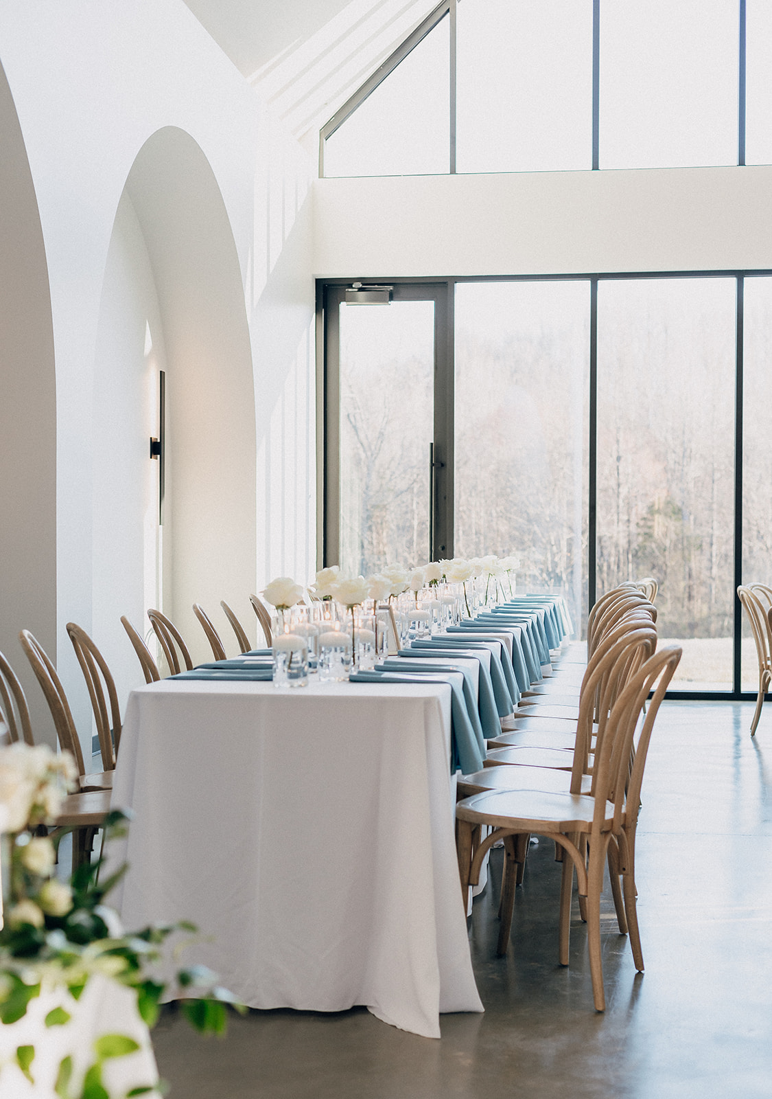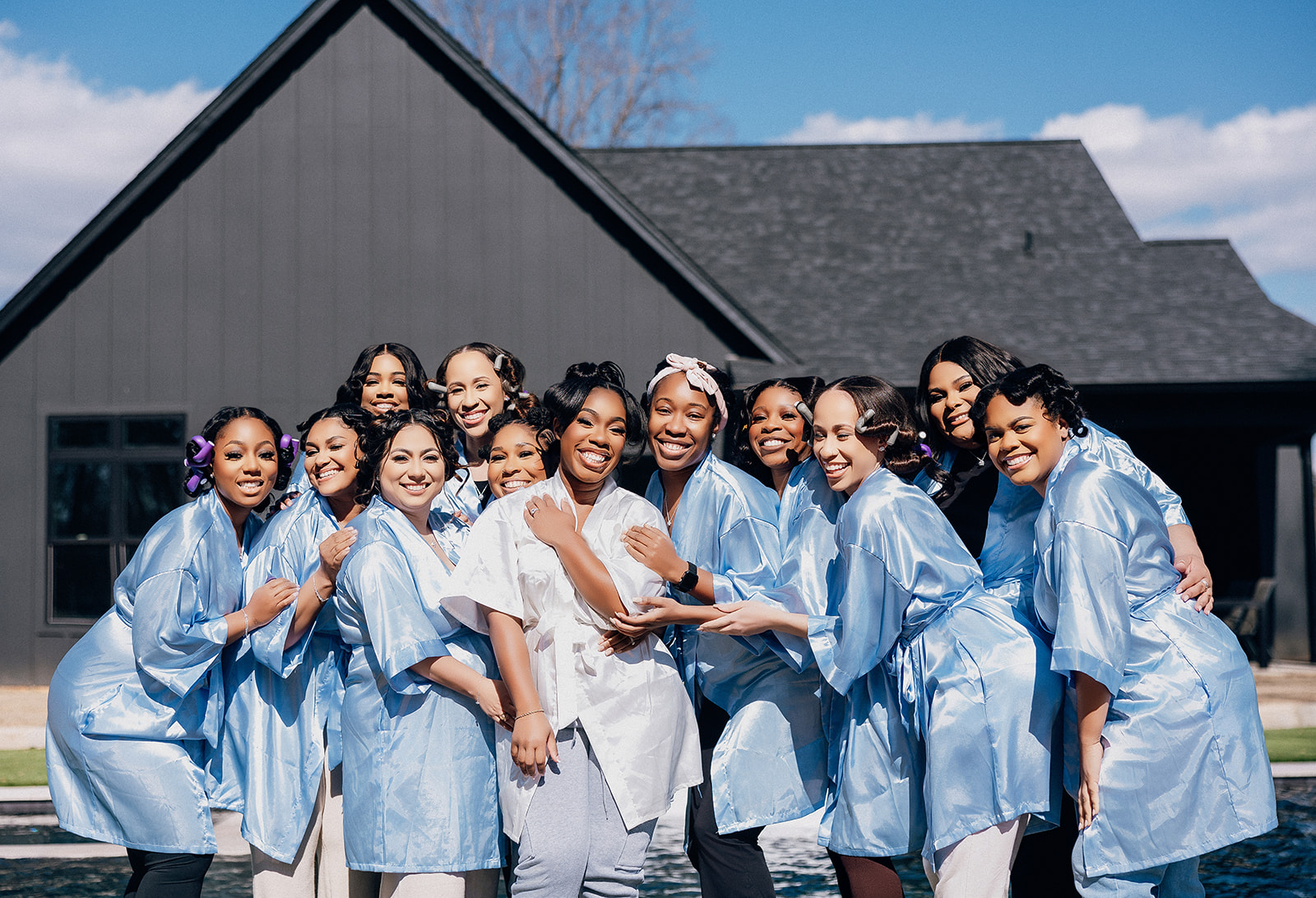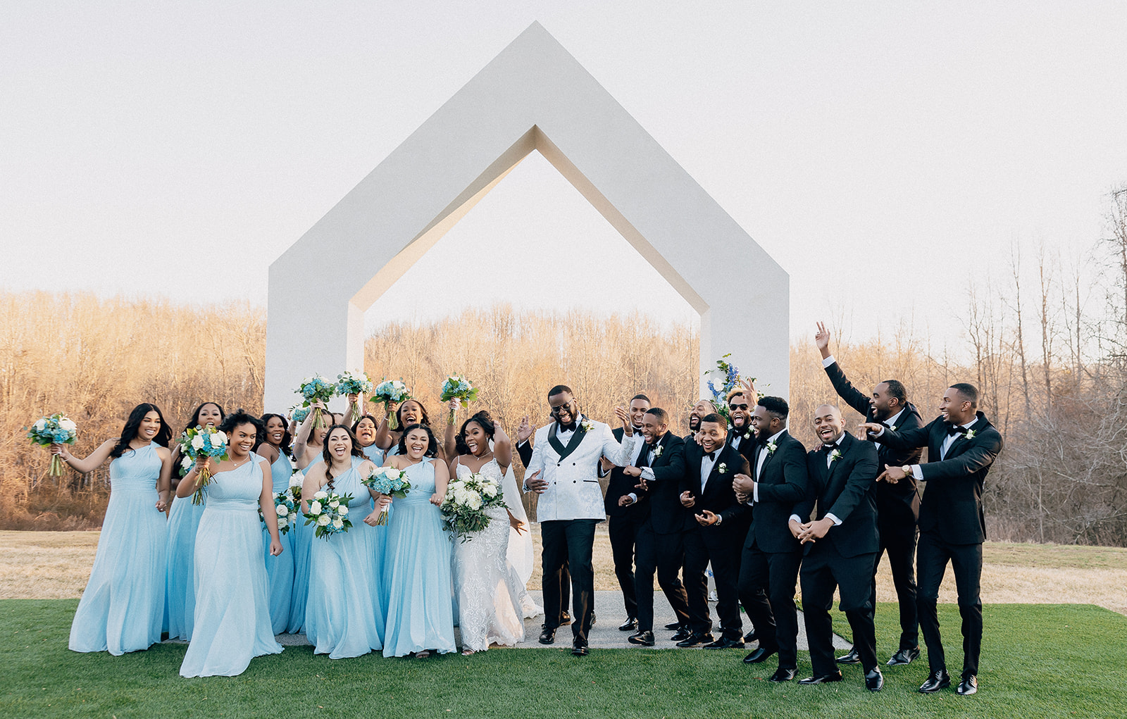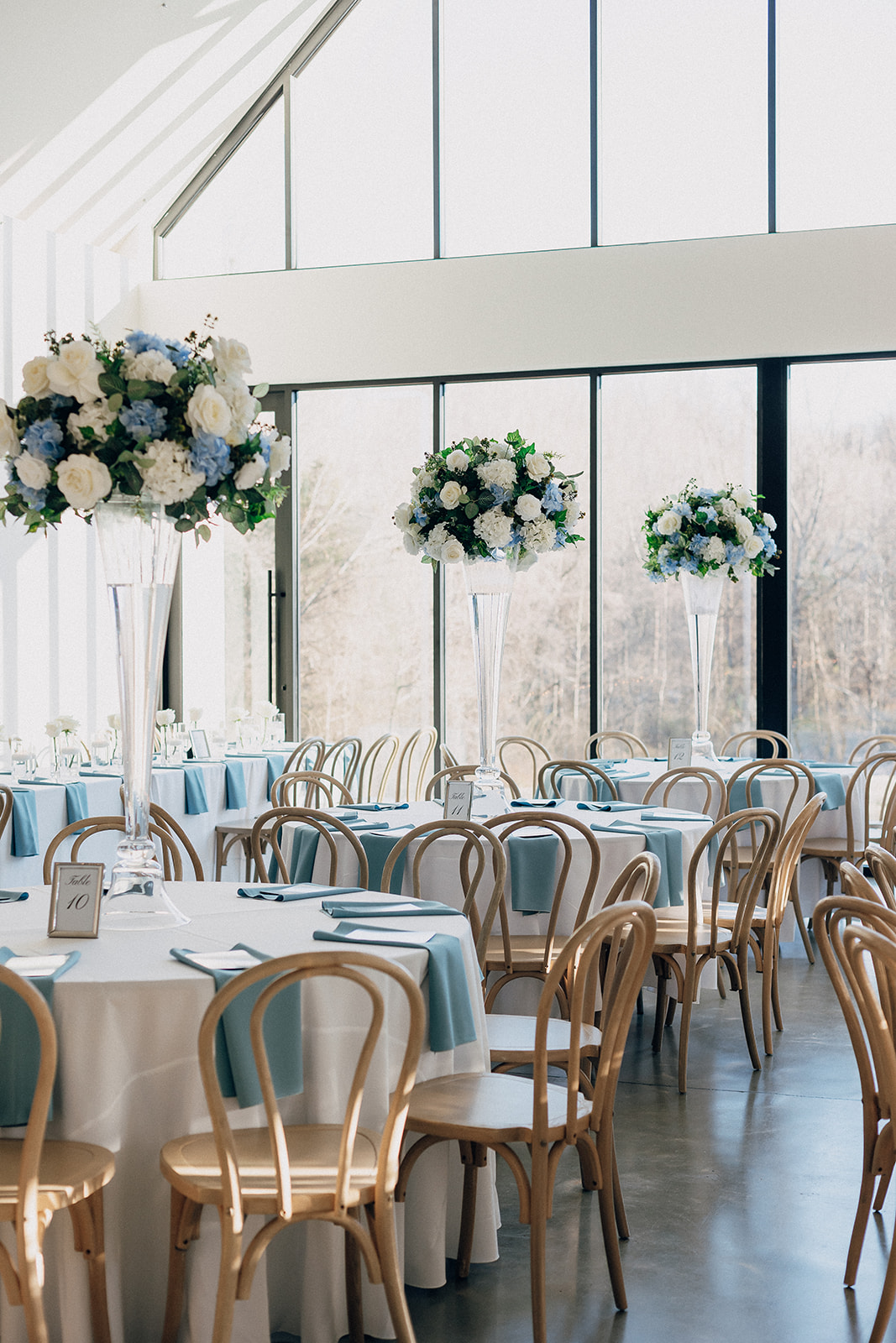 Core Creations planned this beautiful in blue wedding celebration at The Lumen House, a modern wedding venue, in North Carolina. Hues of baby blue marked the day’s celebrations starting with the bridesmaids in blue satin robes. Amber Lynne Beauty and Chosen 1 Studio provided the glam for our gorgeous bride and her girls as they got read yin the bridal suite. She opted for a stunning beaded dress with straps and a dramatic chapel length veil to compliment the look. Her groom chose a sharp satin paisley tuxedo jacket with black bow tie and pants. SB Photography and J Alex Films flawlessly captured the day, in tandem, for the couple to relive again and again.