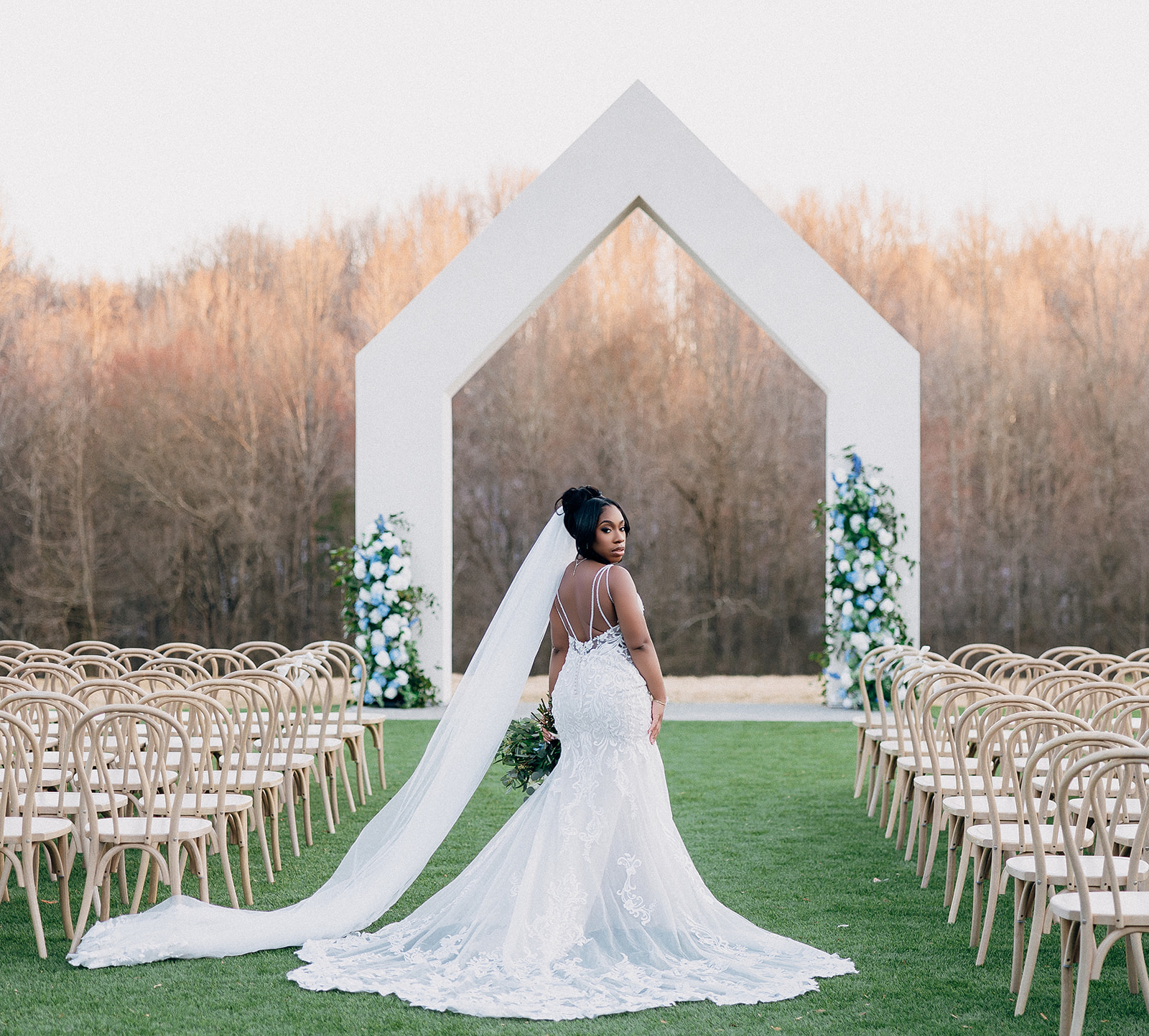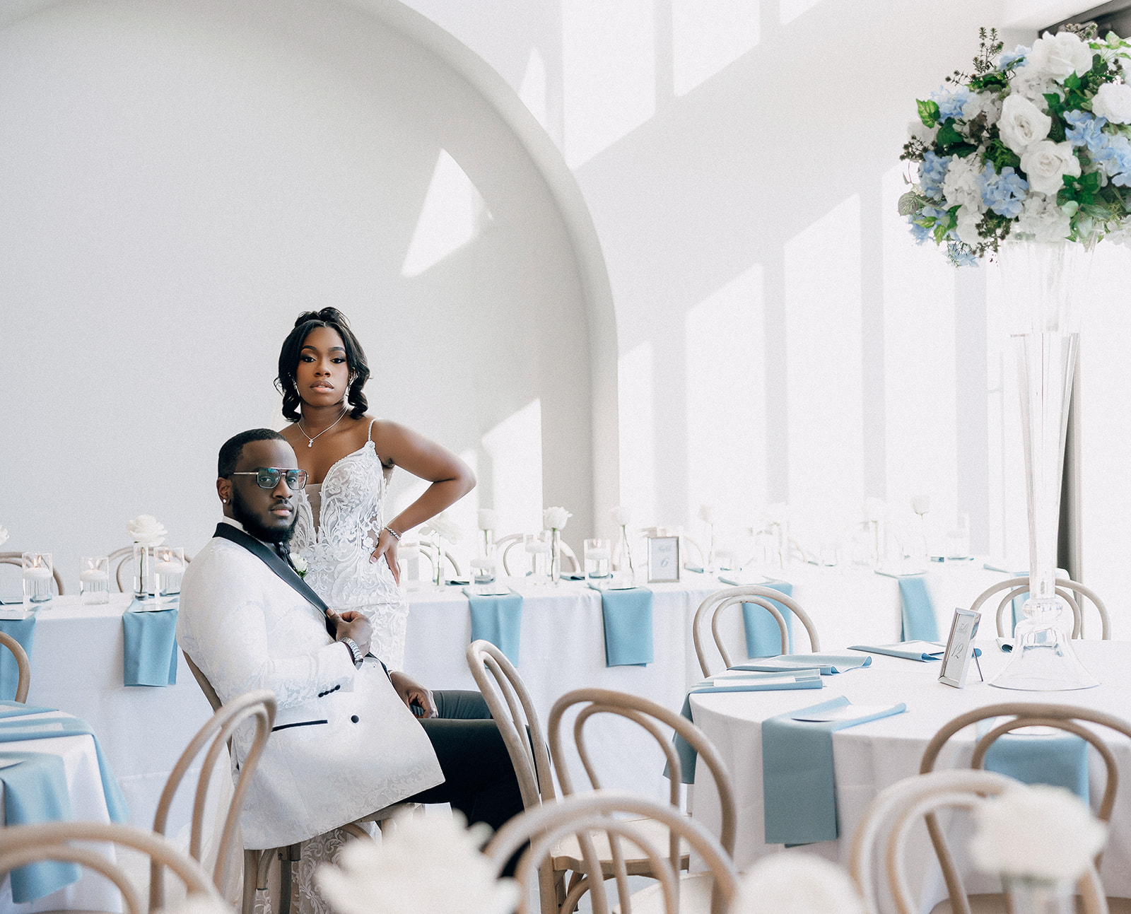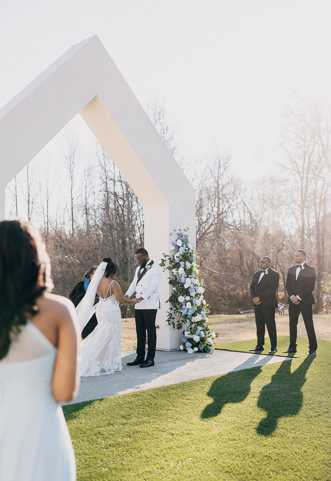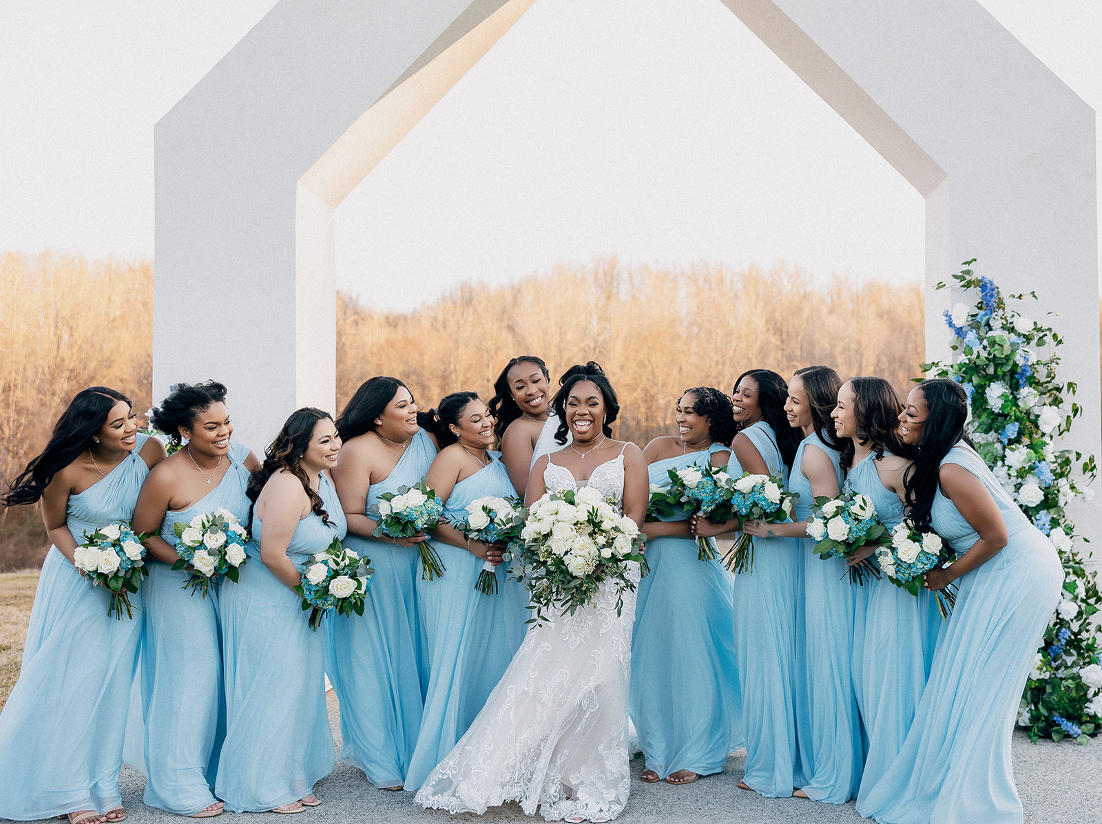 Core Creations planned this beautiful in blue wedding celebration at The Lumen House, a modern wedding venue, in North Carolina. Hues of baby blue marked the day’s celebrations starting with the bridesmaids in blue satin robes. Amber Lynne Beauty and Chosen 1 Studio provided the glam for our gorgeous bride and her girls as they got read yin the bridal suite. She opted for a stunning beaded dress with straps and a dramatic chapel length veil to compliment the look. Her groom chose a sharp satin paisley tuxedo jacket with black bow tie and pants. SB Photography and J Alex Films flawlessly captured the day, in tandem, for the couple to relive again and again.