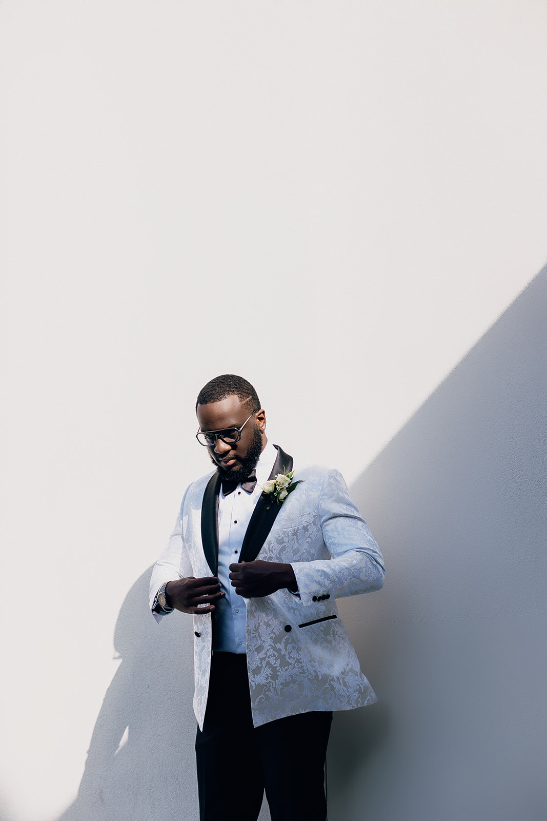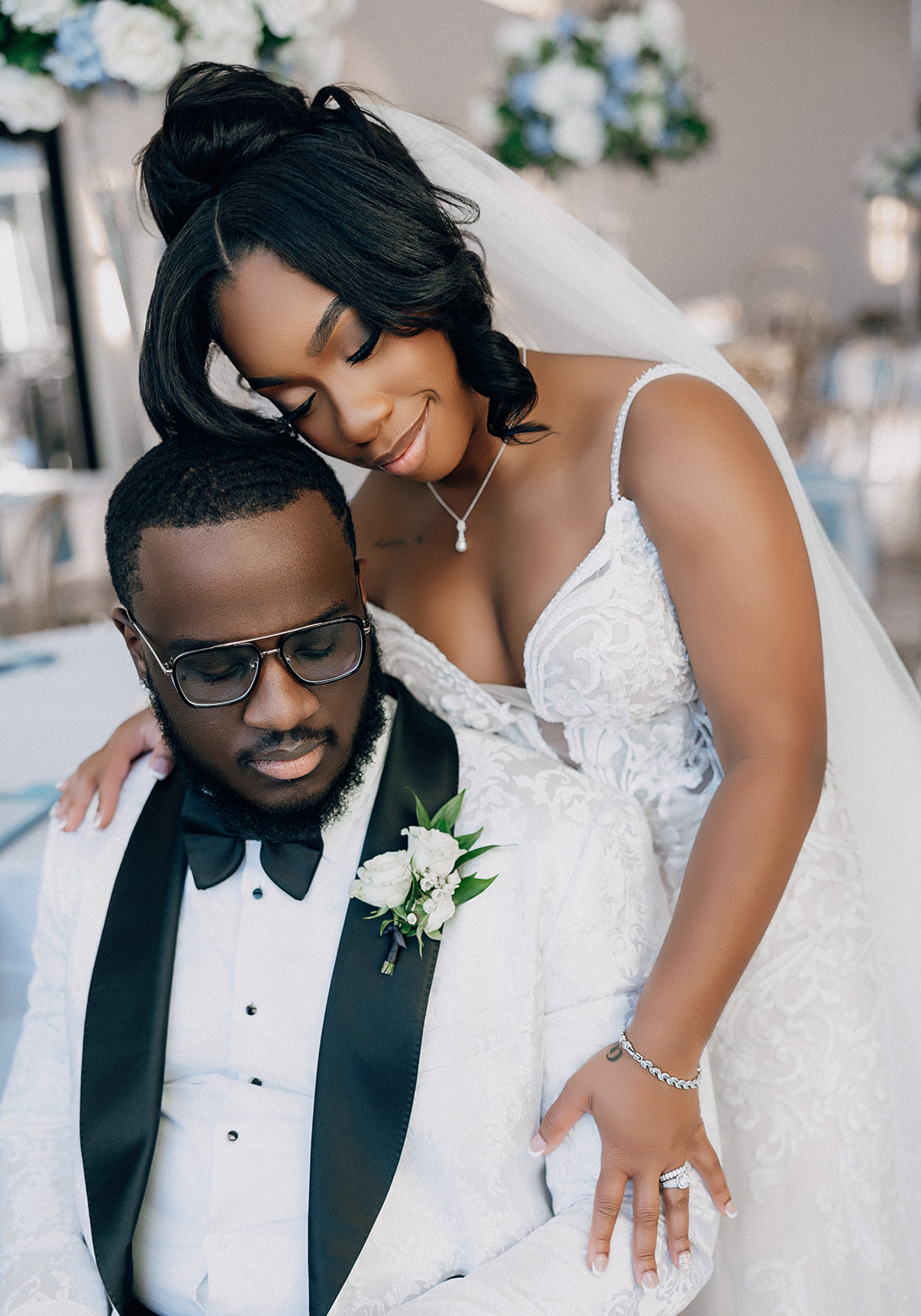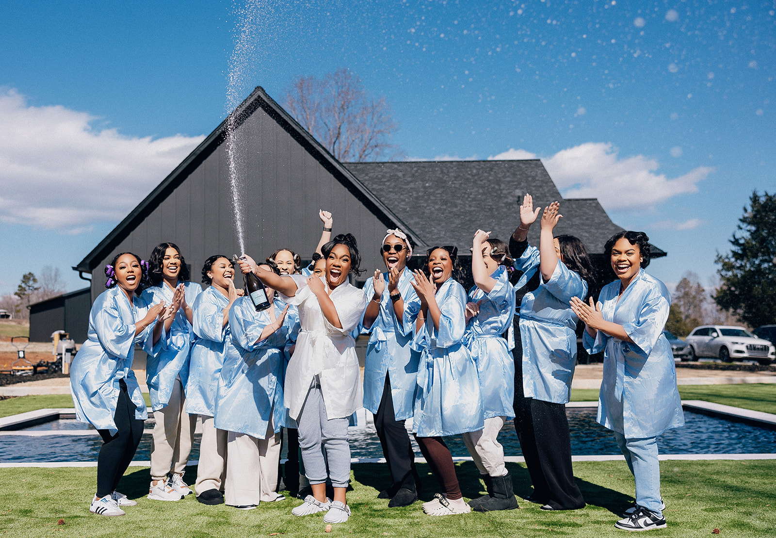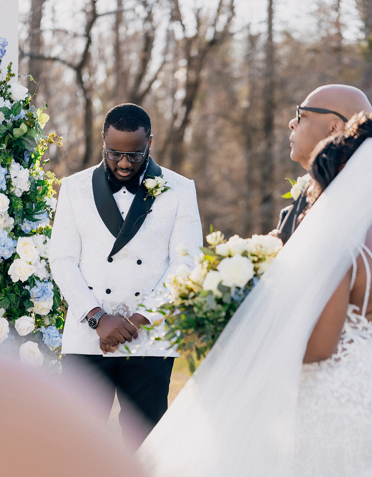 Core Creations planned this beautiful in blue wedding celebration at The Lumen House, a modern wedding venue, in North Carolina. Hues of baby blue marked the day’s celebrations starting with the bridesmaids in blue satin robes. Amber Lynne Beauty and Chosen 1 Studio provided the glam for our gorgeous bride and her girls as they got read yin the bridal suite. She opted for a stunning beaded dress with straps and a dramatic chapel length veil to compliment the look. Her groom chose a sharp satin paisley tuxedo jacket with black bow tie and pants. SB Photography and J Alex Films flawlessly captured the day, in tandem, for the couple to relive again and again.