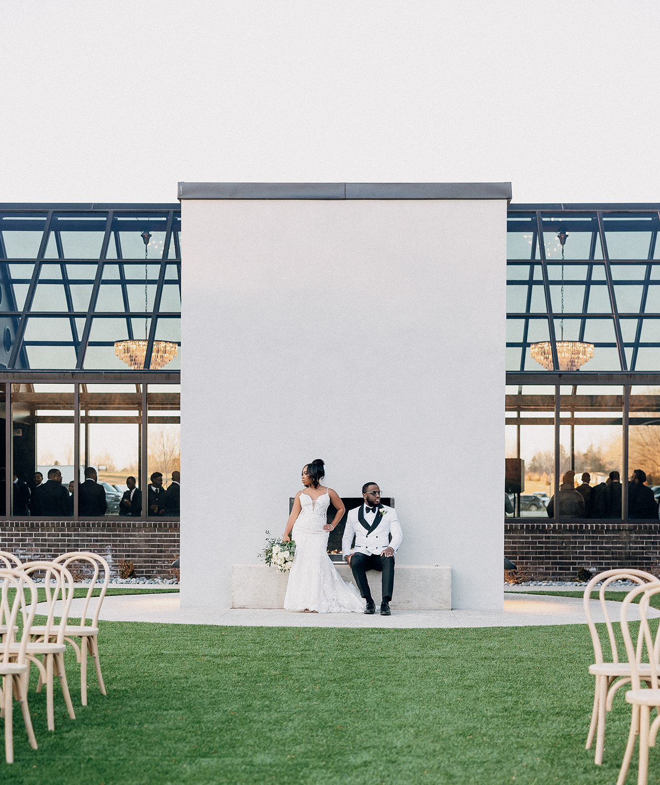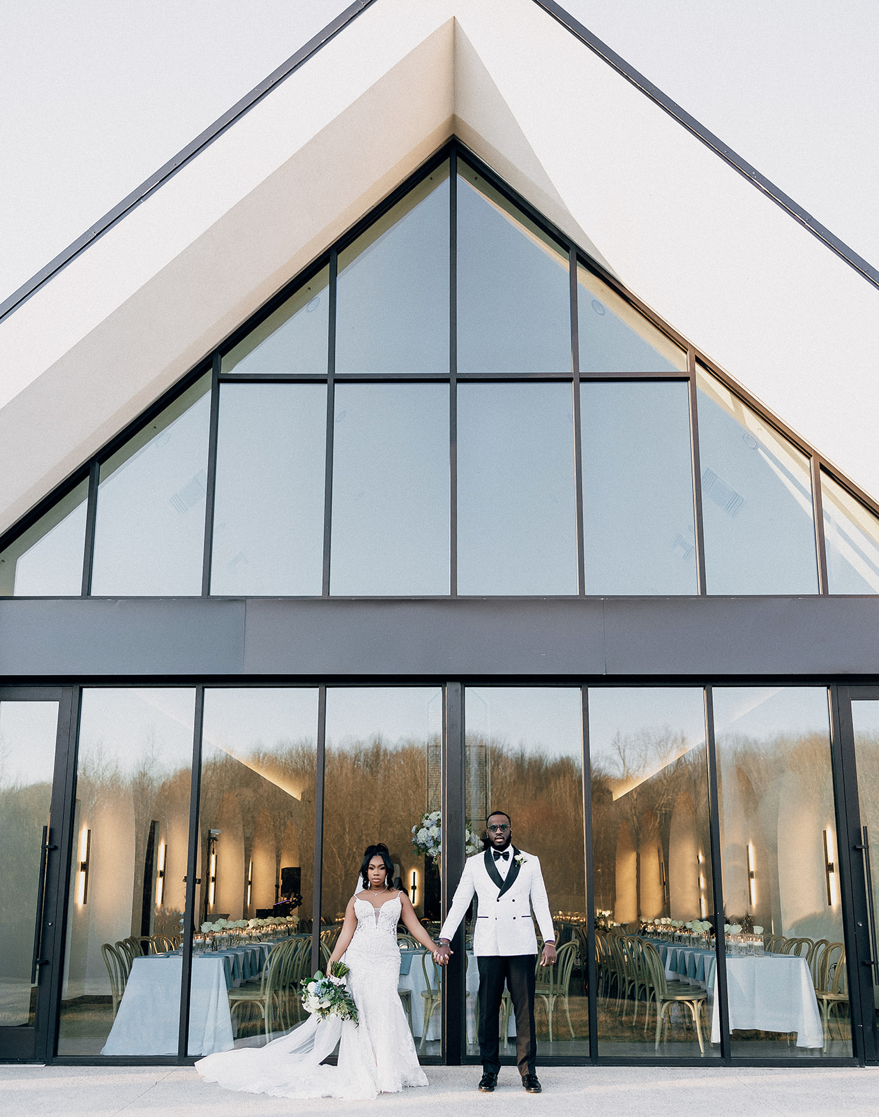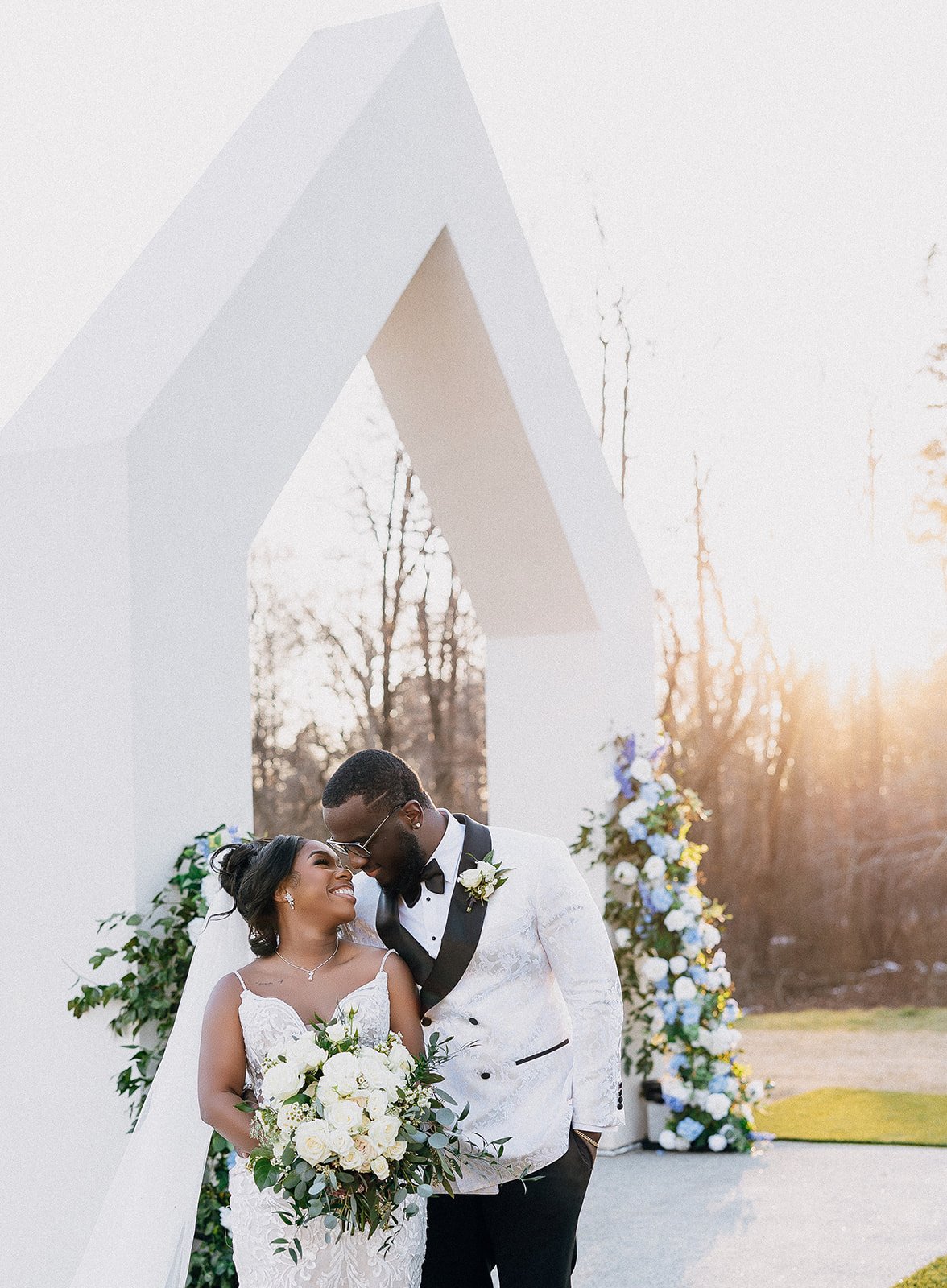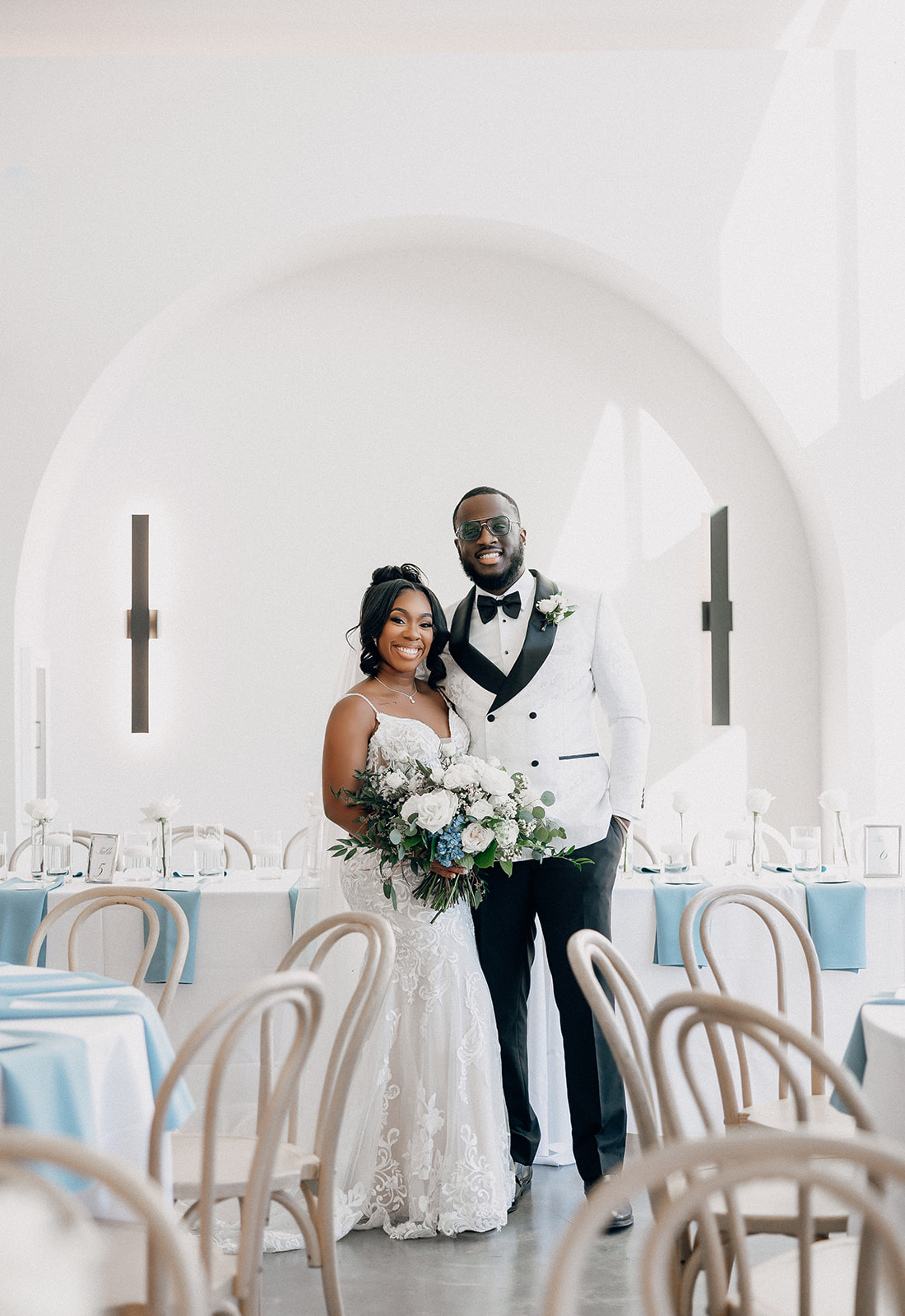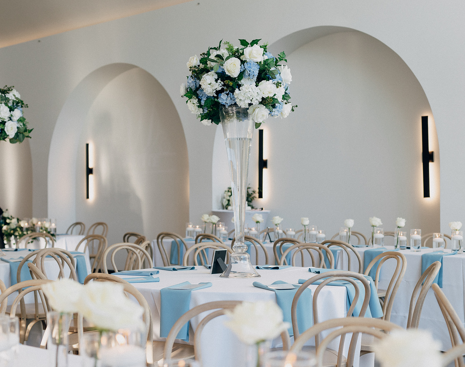 Their ceremony was held outside on the Lumen House lawn under the iconic architectural arch. Core Creations adorned the arch with lively blue and white floral arrangements, tying the space into the overall design of the day. They said ‘I do’ surrounded by loved ones before posing for stunning portraits as the sun began to set. Guests moved inside for the seated reception with floor to ceiling windows for guests to soak in the sunset. The reception space was filled with tables covered in crisp white linens, tall blue and white floral centerpieces, and white washed wooden chairs. Cooks Rentals provided the decor to transform this space. Guests enjoyed a delicious meal from Savory House Kitchen as they mingled and took in the decor. From there DJ JamxliVe kept the good times flowing onto the dance floor as the couple and their friends celebrated into the night. This beautiful blue wedding celebration was stunning from start to finish and fit perfectly at The Lumen House!