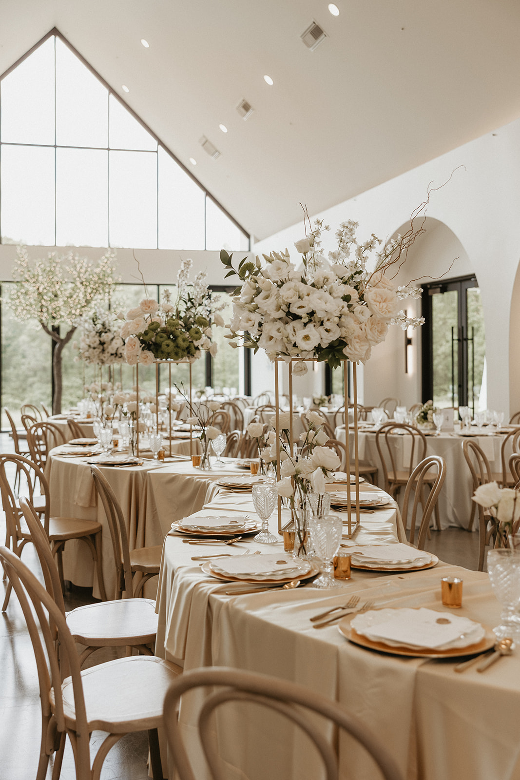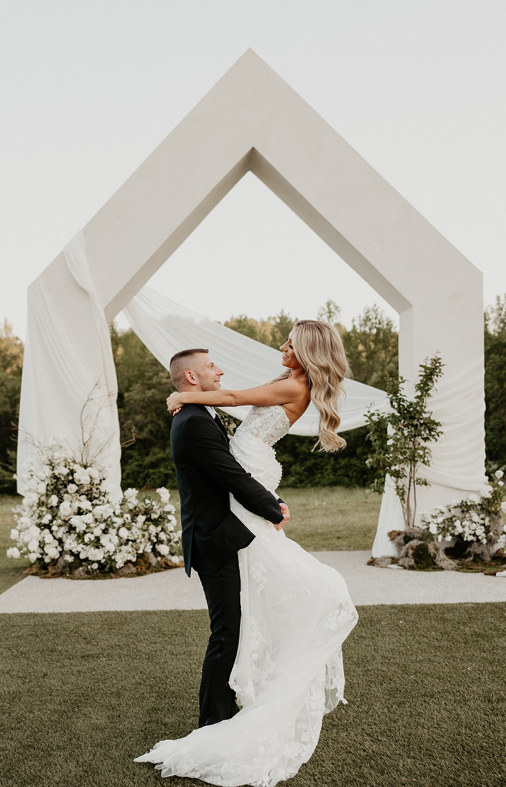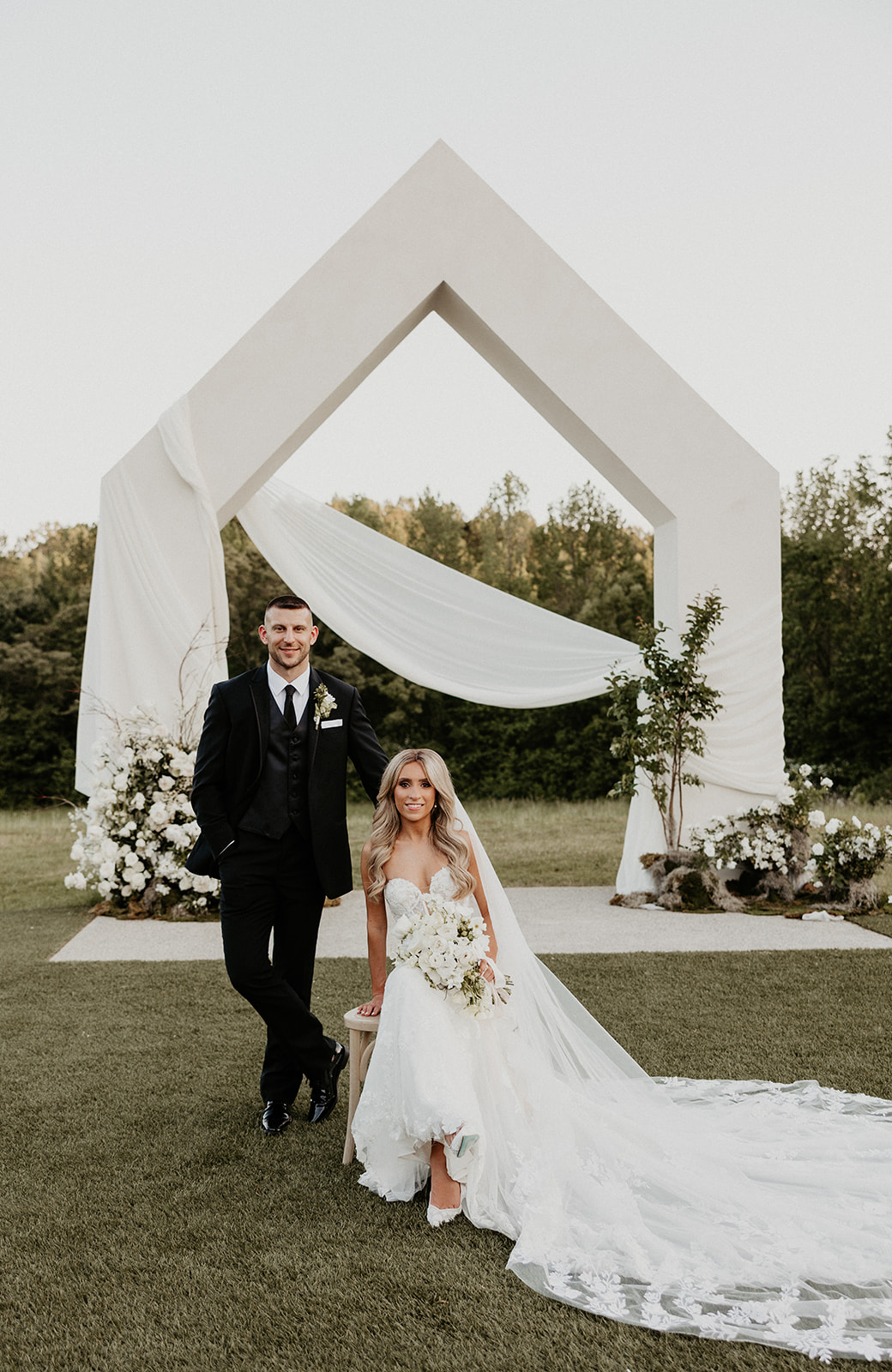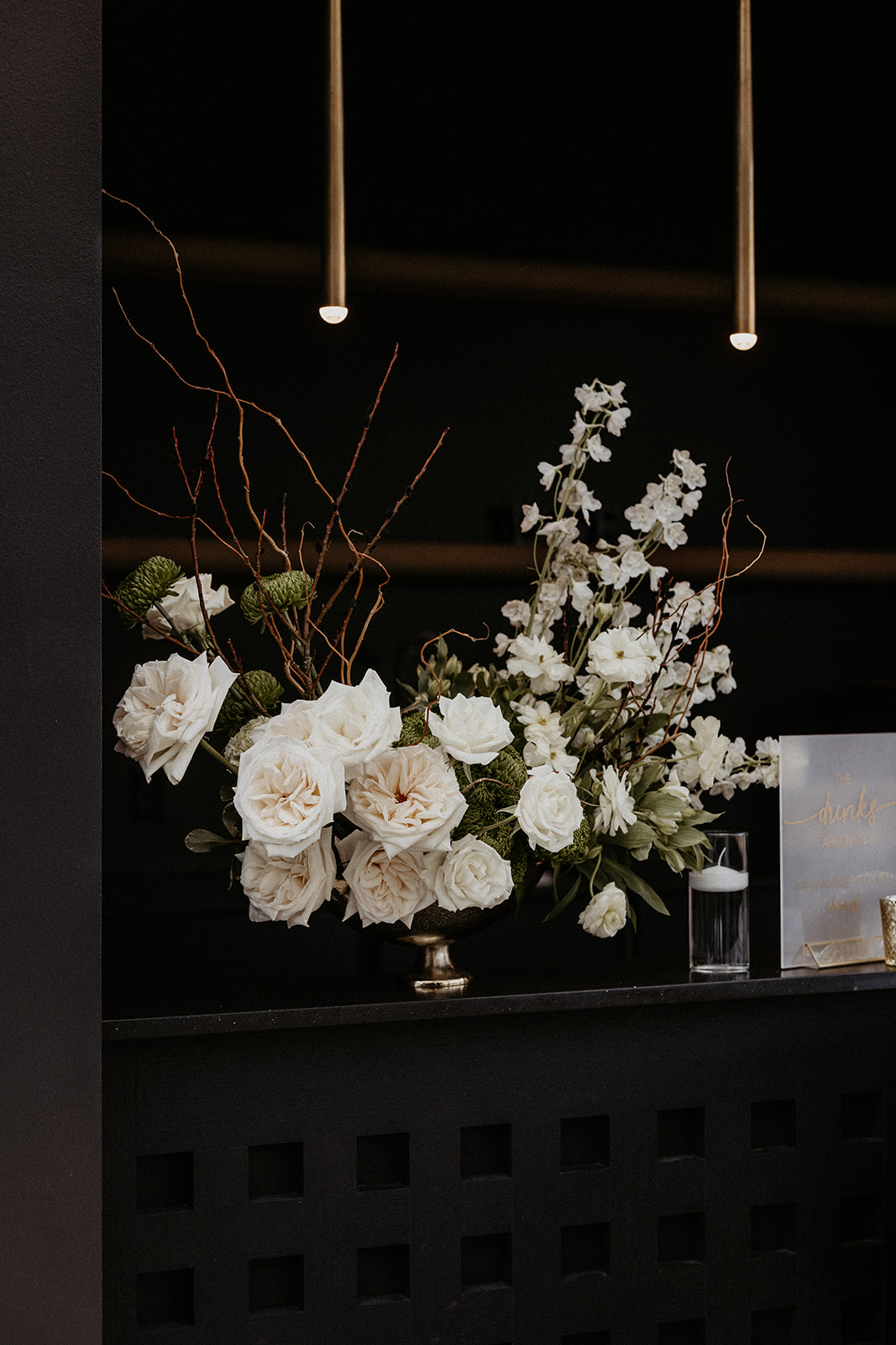 Following their ceremony, they had a time of stunning portraits outside at The Lumen House. Bella Liz Photography captured every detail with the help of Lexa Rae Films and The Mrs. POV. The newlyweds posed underneath the venue’s arch as they documented the momentous occasion. Guests moved into a cocktail hour in the greenhouse, enjoying drinks from Uptown Catering, before being whisked away to the stunning indoor reception.