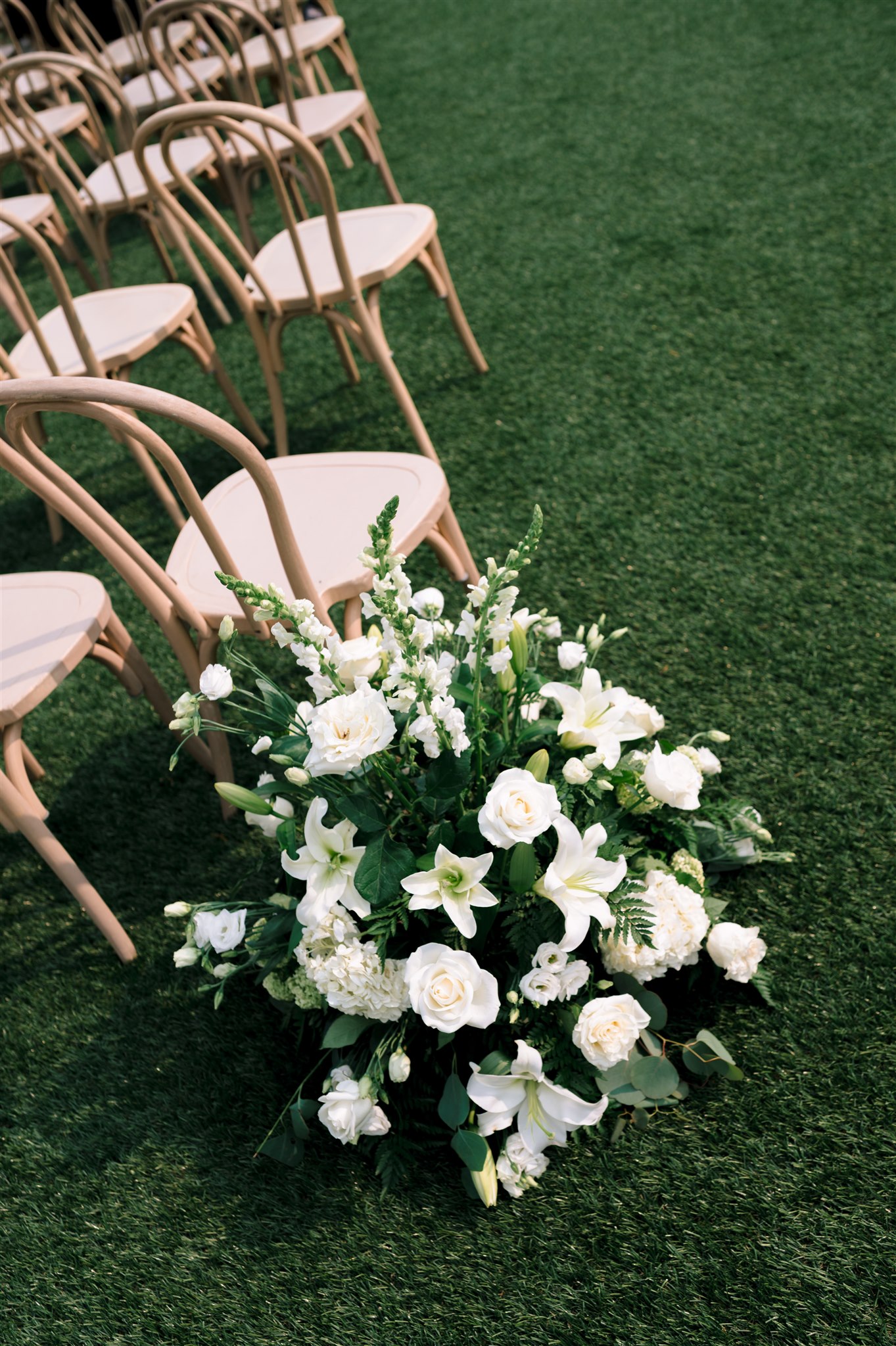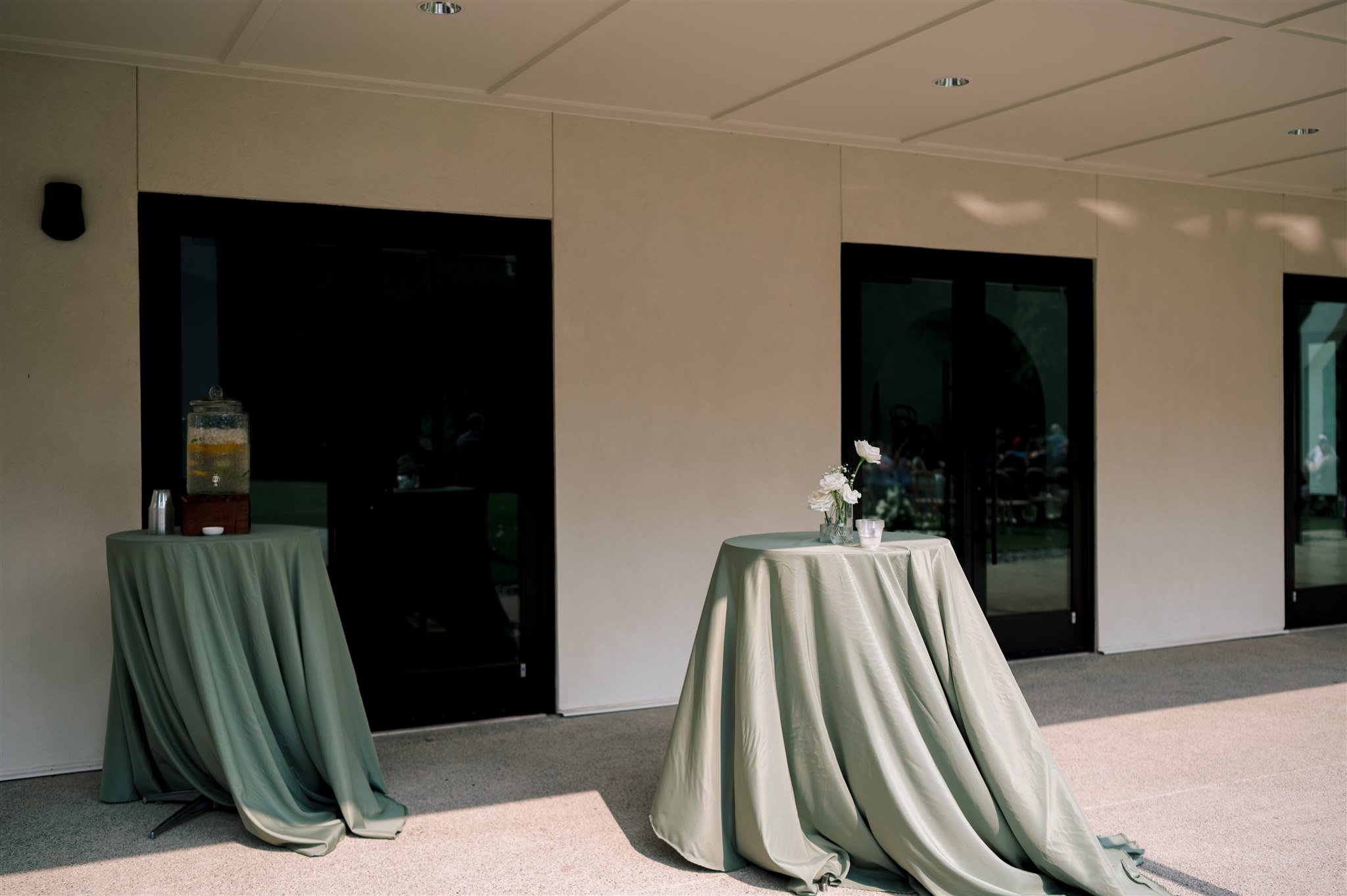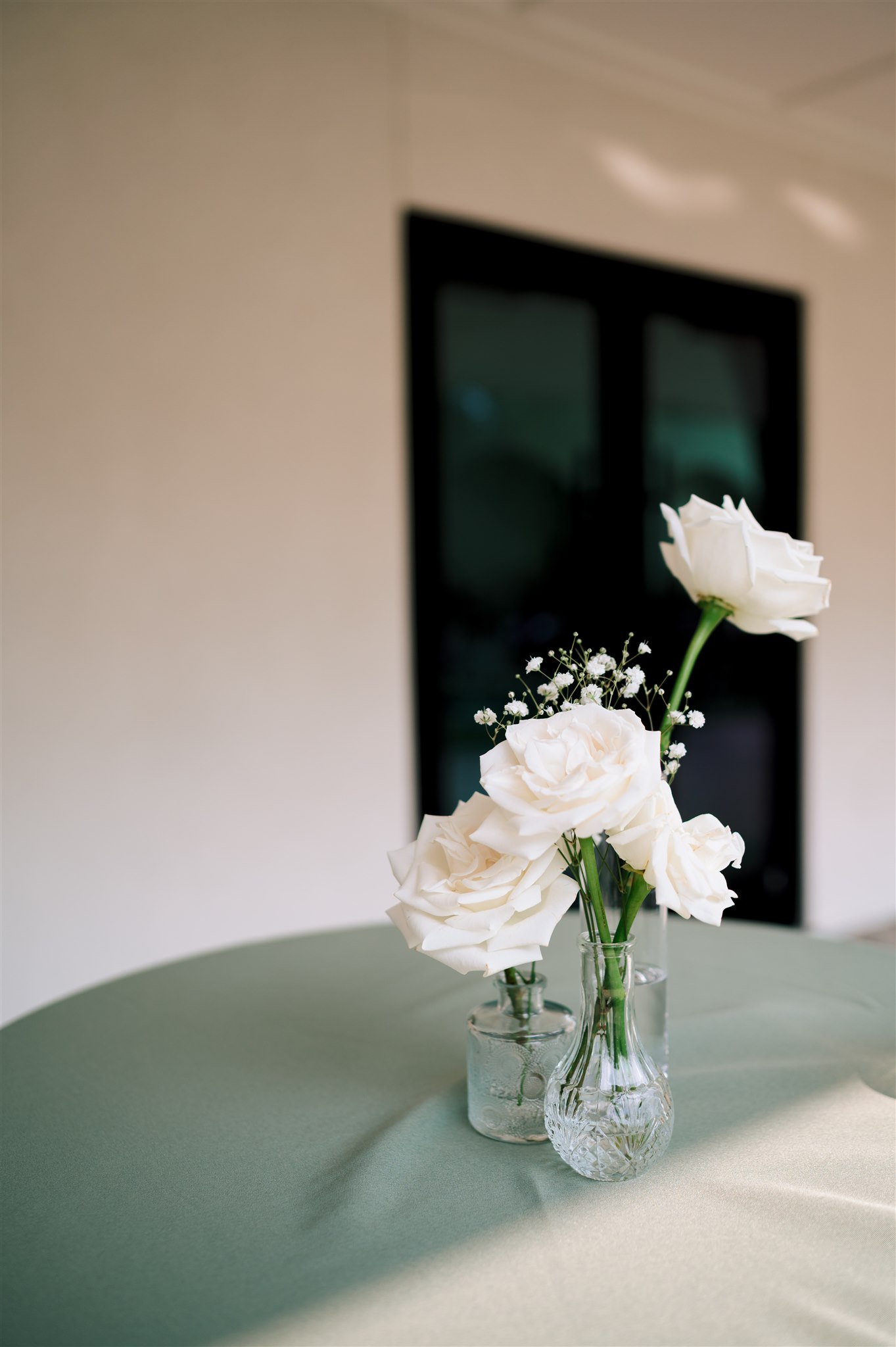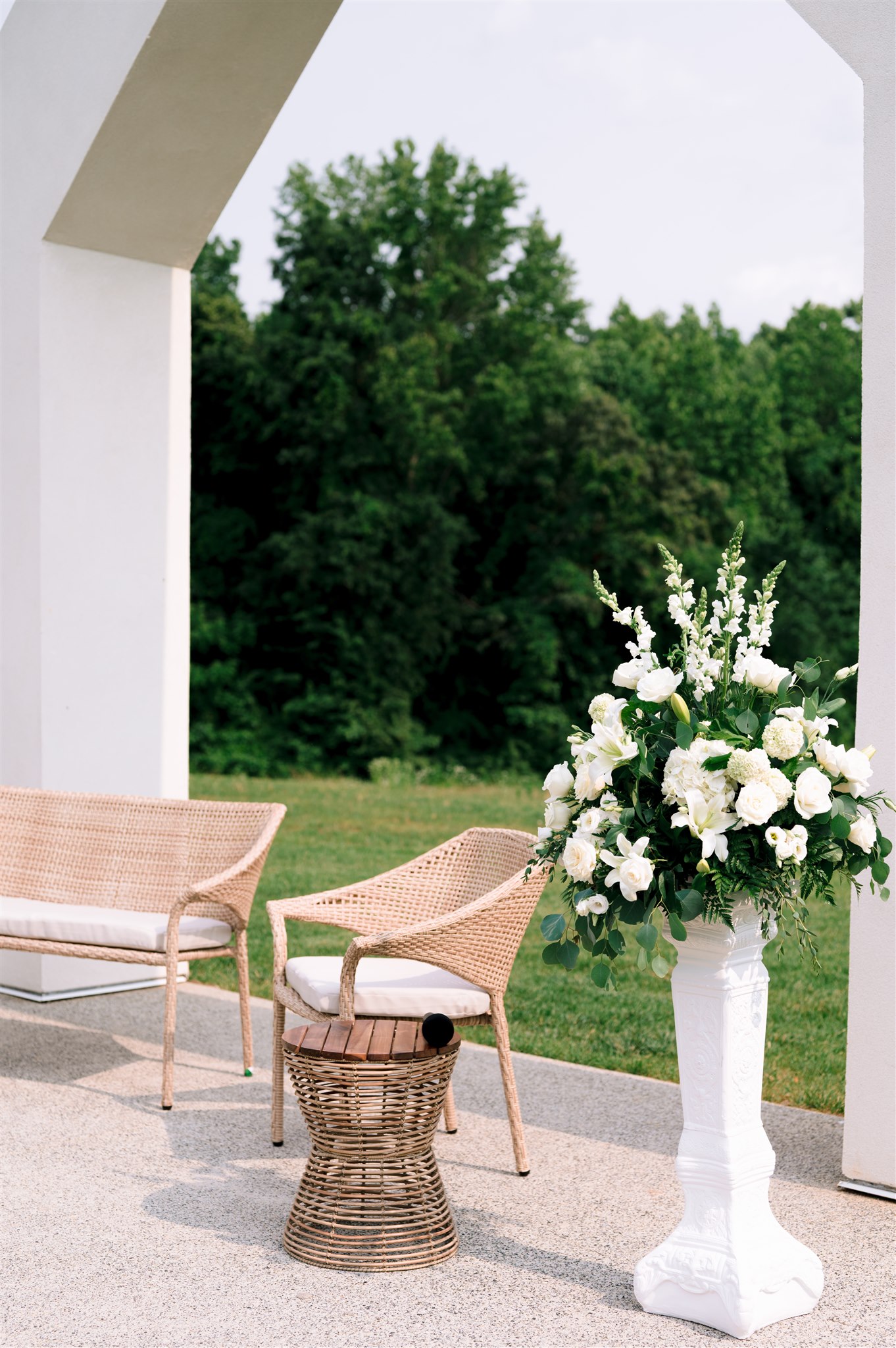 This beautiful May wedding at The Lumen House in North Carolina was marked with lush white florals, light rattan accents, and pops of green at every turn. Tailored to You Events planned every intricate detail, bringing the couple’s vision to life on our grounds. Let my People Free and The Makeup Team helped our bride look and feel her best as she and her bridesmaids got ready offsite. Once all parties arrived at The Lumen House, the ceremony was held outside on the lawn deck beneath the modern arch. Rattan lounge furniture was perfectly placed beneath the arch, beside lively floral arrangements by Carmel Florist, creating the perfect space to exchange vows. Corda Entertainment set the tone for the day with a beautiful soundtrack played on the violin. The green lawn and trees perfectly accented the outdoor space. Angela Acosta captured every beautiful moment, immortalizing the day.