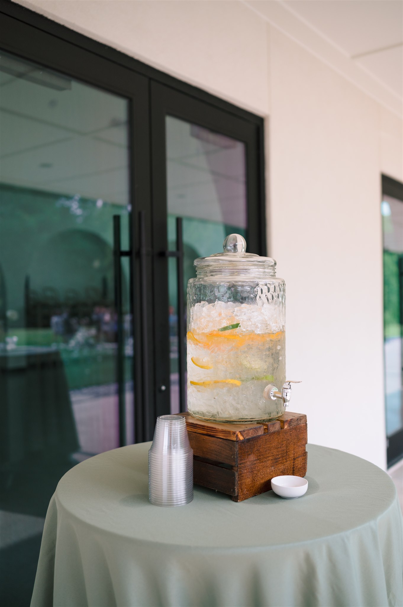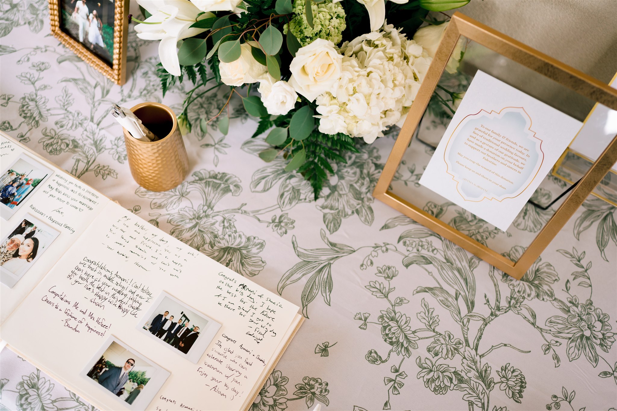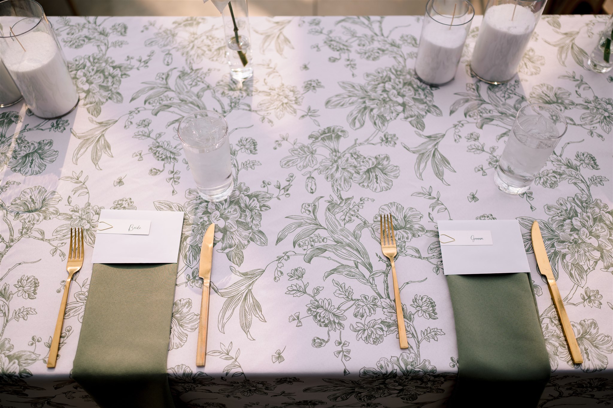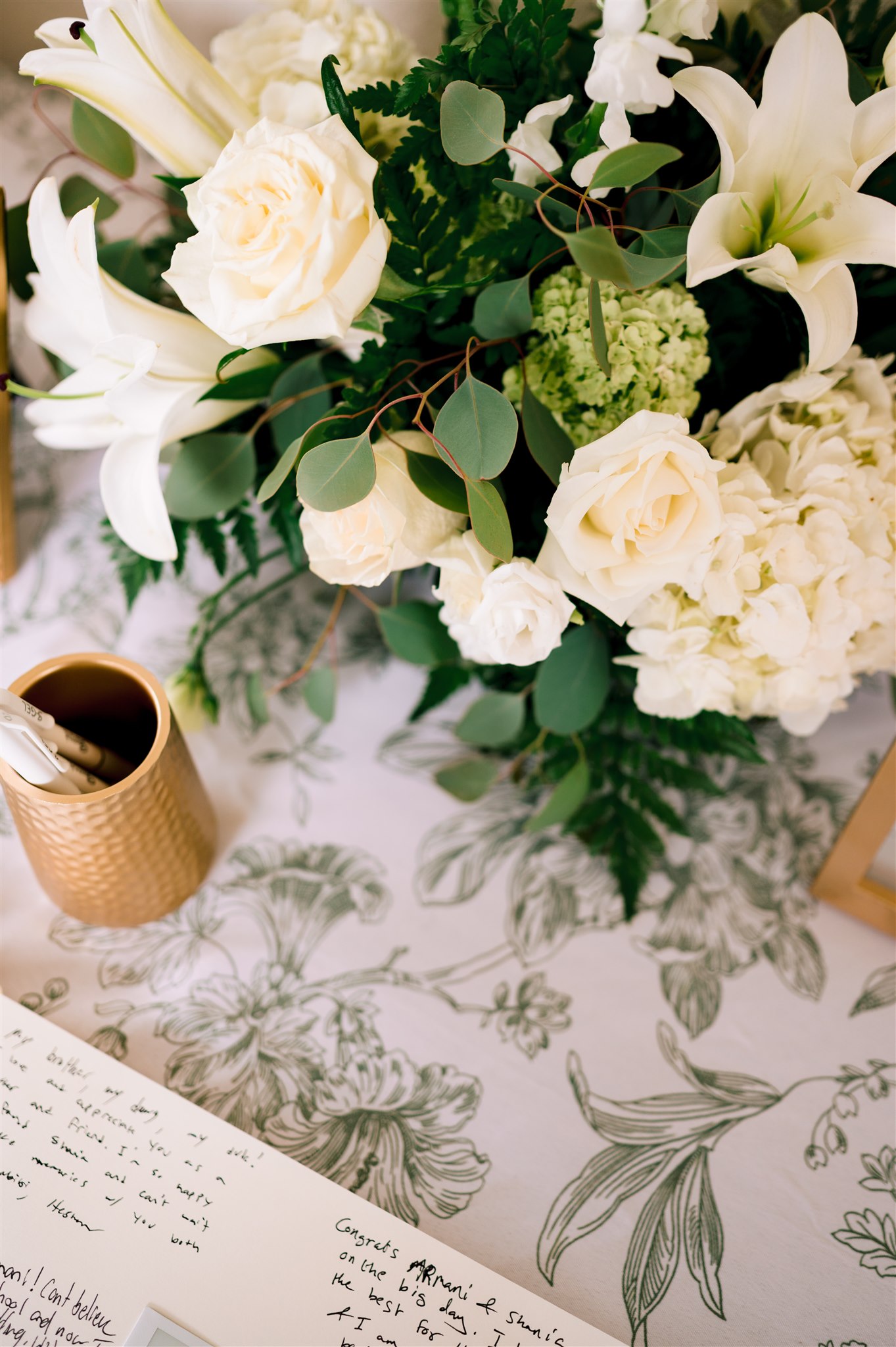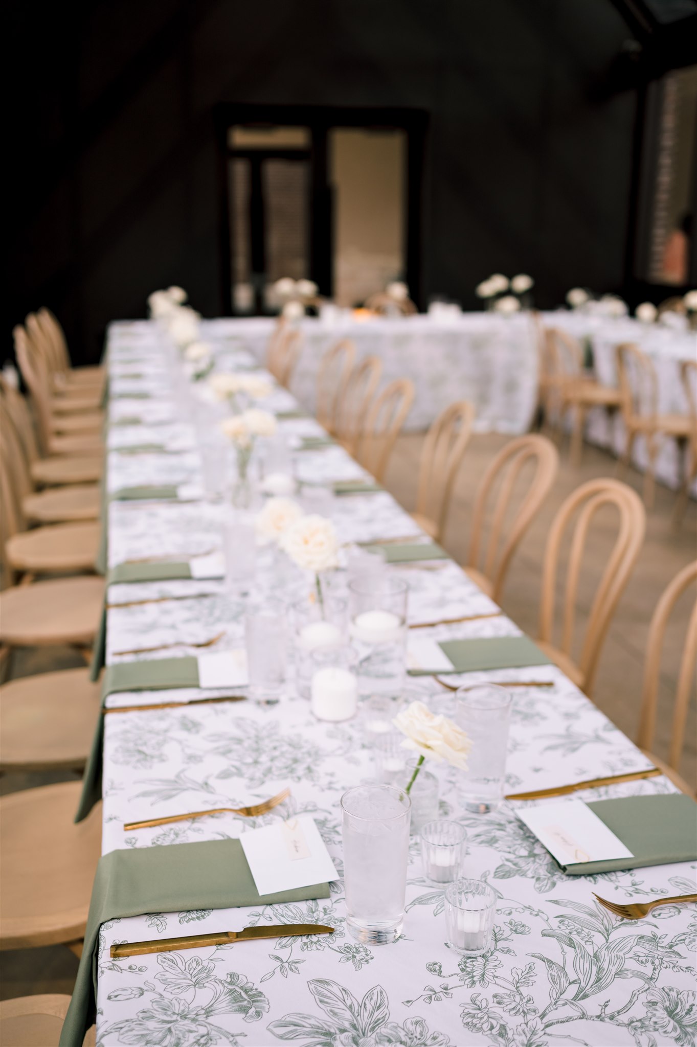 From there guests moved inside the glass house for an elegant reception celebration. The tables were topped with green printed linens and napkins, white floral bud vases, romantic candles, and gold cutlery. Rental pieces from Party Reflections helped solidify their chic green and white theme. The chandeliers twinkled overhead as the golden hour light poured in through the glass ceiling. Guests enjoyed a plated meal from Roots Catering as they mingled and enjoyed each other’s company. This May wedding in North Carolina was the perfect celebration of Shania & Armani’s marriage at The Lumen House!