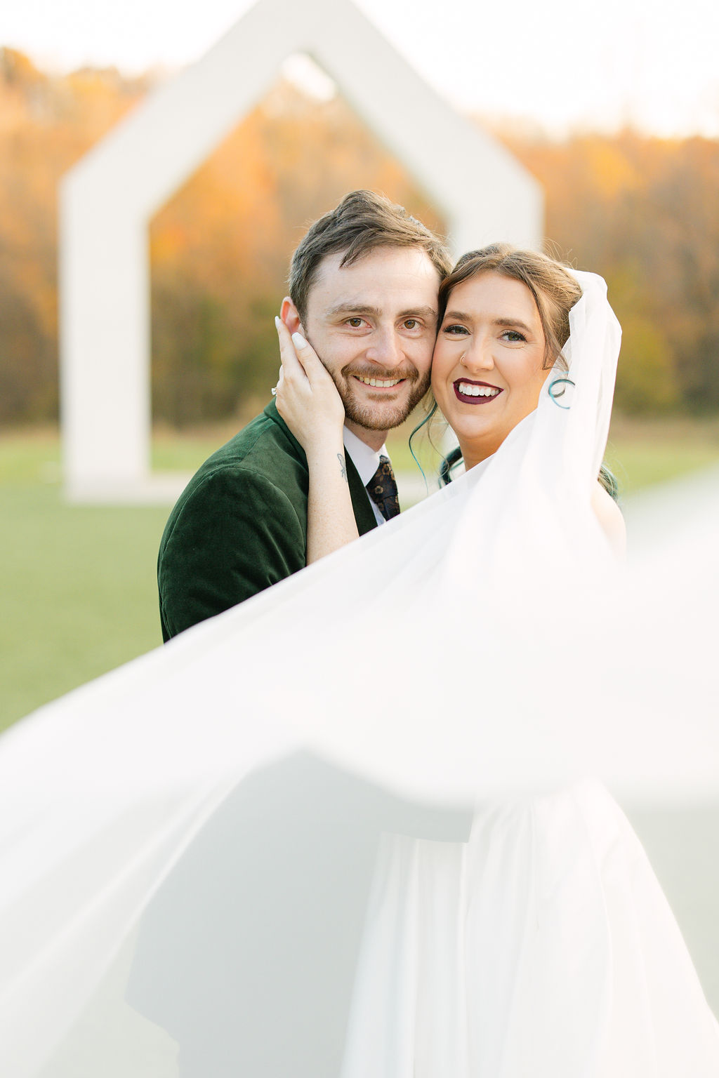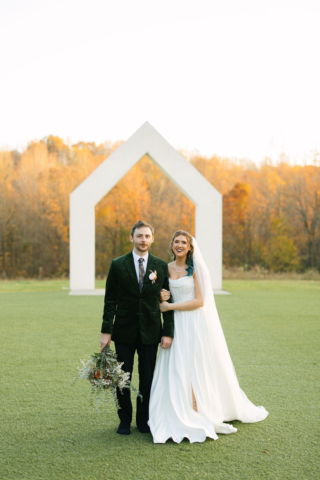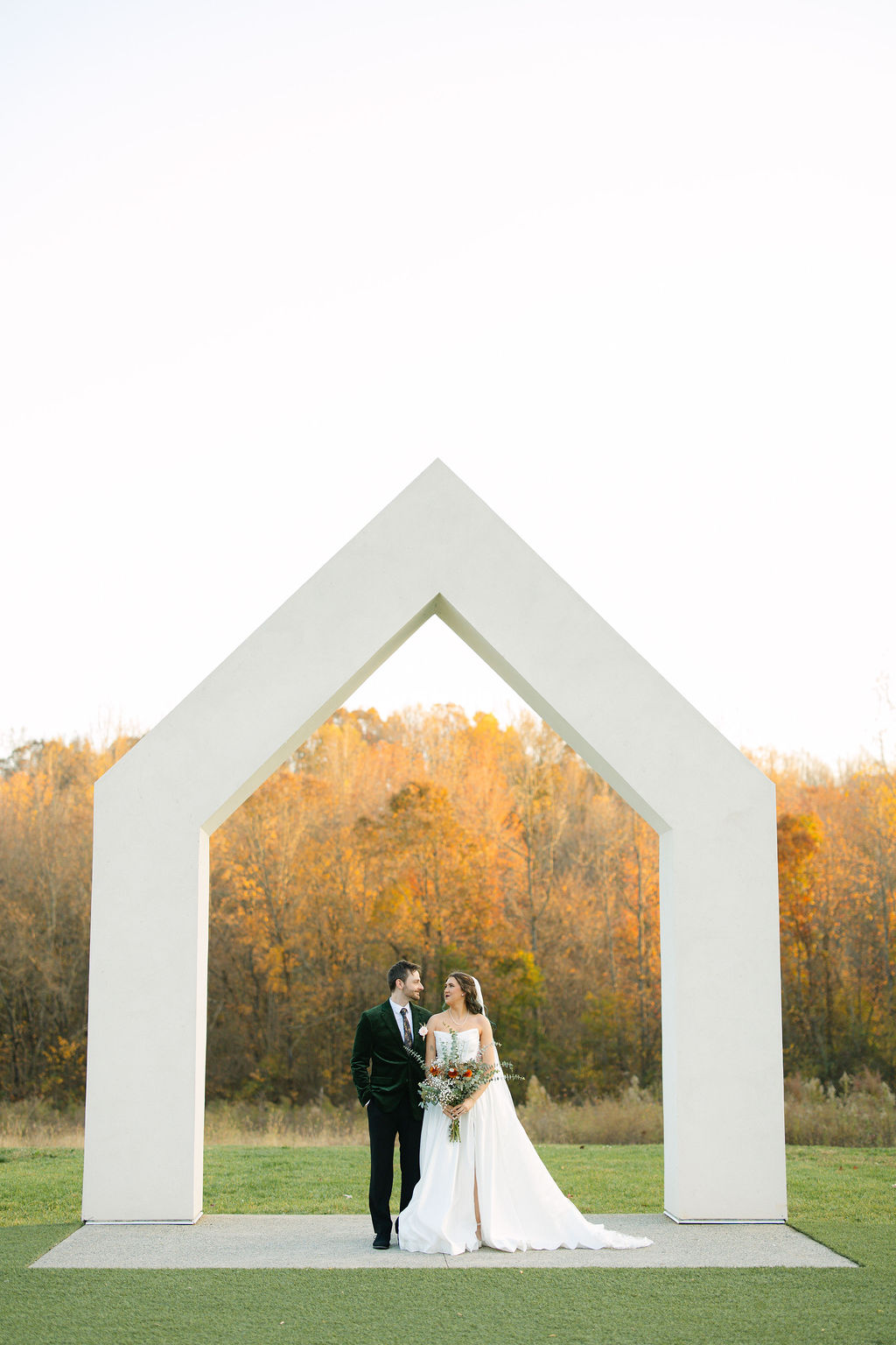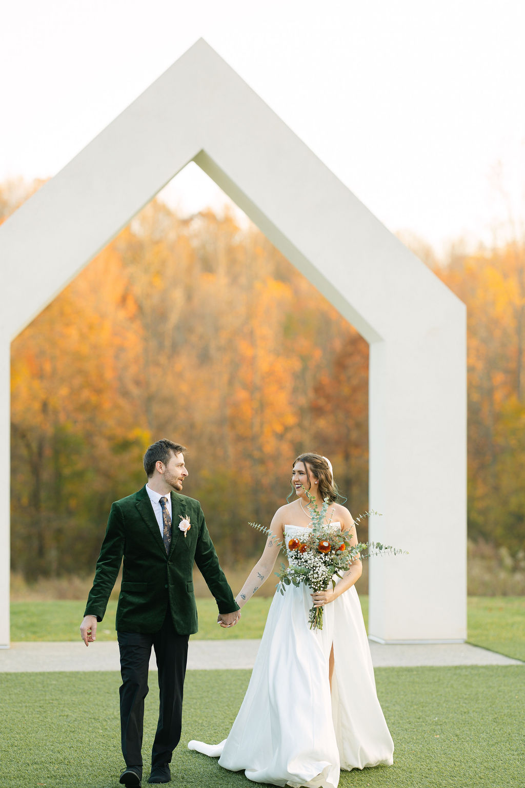A bride and groom walking hand in hand in front of a modern wedding arch and fall colored North Carolina trees.