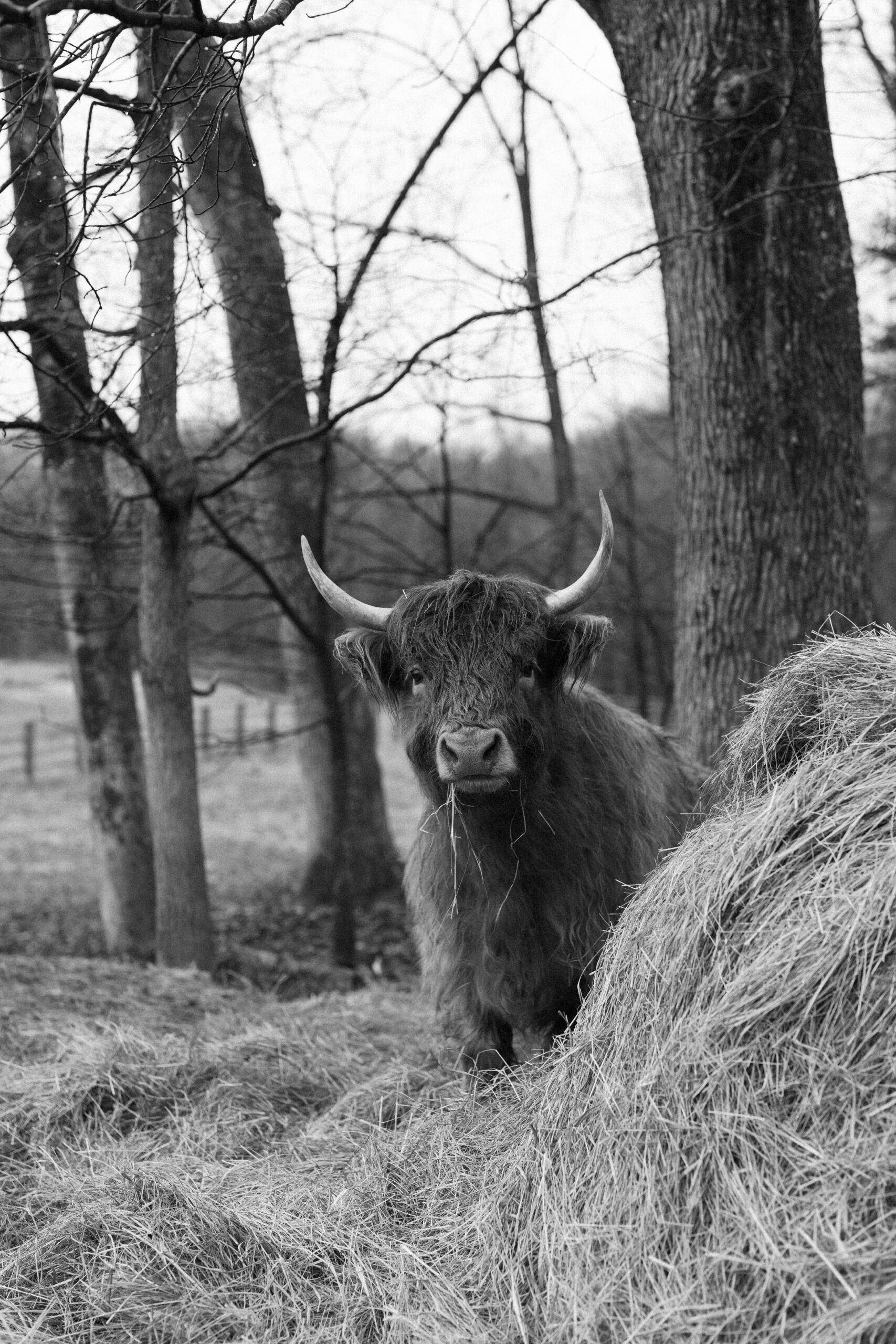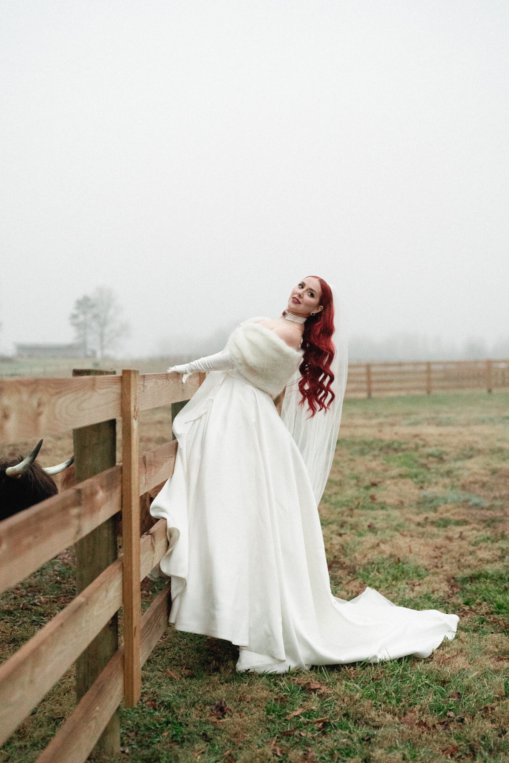 A bride and groom petting a cow at their North Carolina wedding.